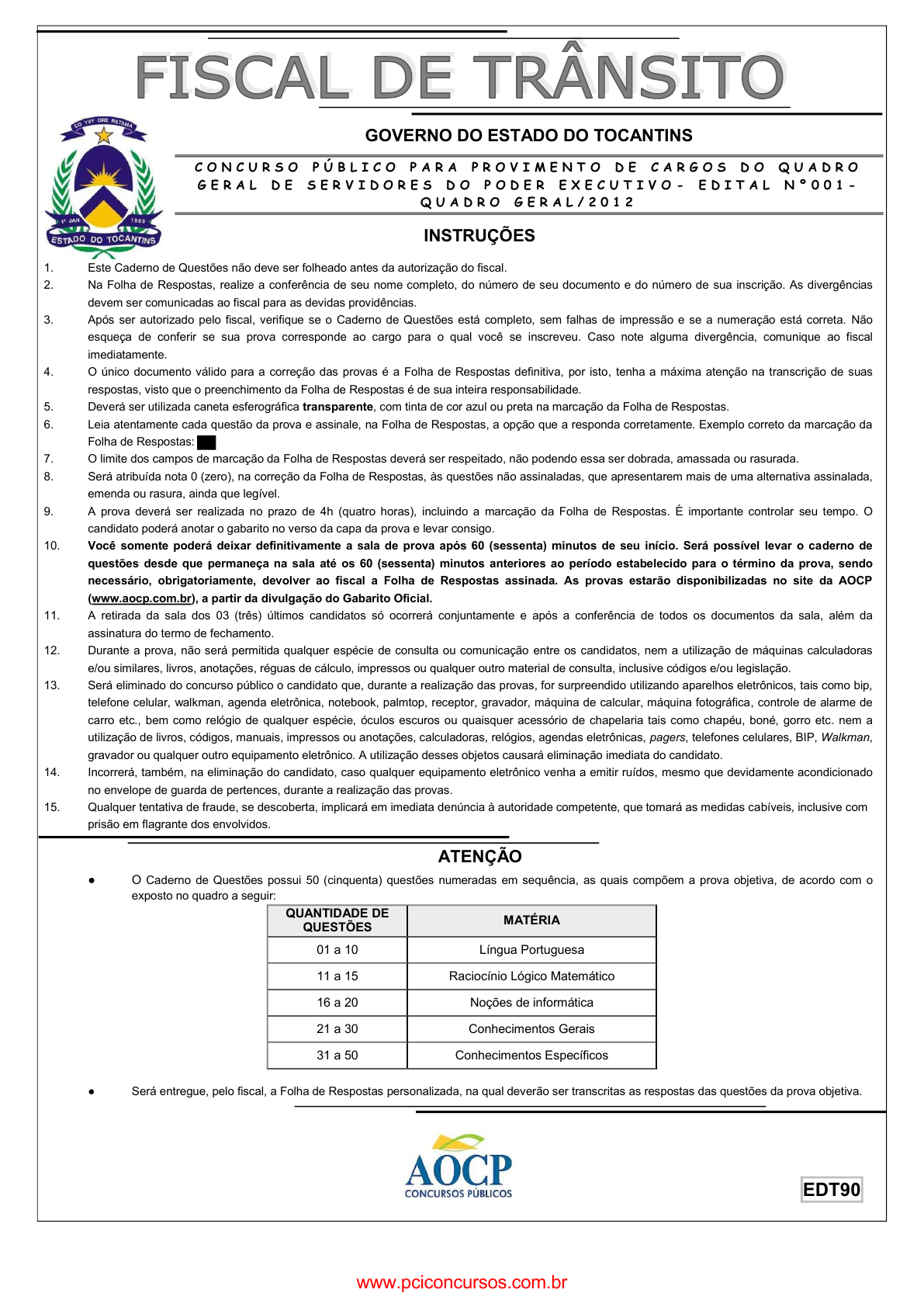 pcimarkpci MDAwMDowMDAwOjAwMDA6MDAwMDowMDAwOmZmZmY6MzZlOTpjMjU5:VGh1LCAxNiBTZXAgMjAyMSAwNDozMzoyMyAtMDMwMA== GOVERNO DO ESTADO DO TOCANTINS C O N C U R S O P Ú B L I C O P A R A P R O V I M E N T O D E C A R G O S D O Q U A D R O G E R A L D E S E R V I D O R E S D O P O D E R E X E C U T I V O - E D I T A L N º 0 0 1 - Q U A D R O G E R A L / 2 0 1 2 INSTRUÇÕES 1. Este Caderno de Questões não deve ser folheado antes da autorização do fiscal. 2. Na Folha de Respostas, realize a conferência de seu nome completo, do número de seu documento e do número de sua inscrição. As divergências devem ser comunicadas ao fiscal para as devidas providências. 3. Após ser autorizado pelo fiscal, verifique se o Caderno de Questões está completo, sem falhas de impressão e se a numeração está correta. Não esqueça de conferir se sua prova corresponde ao cargo para o qual você se inscreveu. Caso note alguma divergência, comunique ao fiscal imediatamente. 4. O único documento válido para a correção das provas é a Folha de Respostas definitiva, por isto, tenha a máxima atenção na transcrição de suas respostas, visto que o preenchimento da Folha de Respostas é de sua inteira responsabilidade. 5. Deverá ser utilizada caneta esferográfica transparente, com tinta de cor azul ou preta na marcação da Folha de Respostas. 6. Leia atentamente cada questão da prova e assinale, na Folha de Respostas, a opção que a responda corretamente. Exemplo correto da marcação da Folha de Respostas: 7. O limite dos campos de marcação da Folha de Respostas deverá ser respeitado, não podendo essa ser dobrada, amassada ou rasurada. 8. Será atribuída nota 0 (zero), na correção da Folha de Respostas, às questões não assinaladas, que apresentarem mais de uma alternativa assinalada, emenda ou rasura, ainda que legível. 9. A prova deverá ser realizada no prazo de 4h (quatro horas), incluindo a marcação da Folha de Respostas. É importante controlar seu tempo. O candidato poderá anotar o gabarito no verso da capa da prova e levar consigo. 10. Você somente poderá deixar definitivamente a sala de prova após 60 (sessenta) minutos de seu início. Será possível levar o caderno de questões desde que permaneça na sala até os 60 (sessenta) minutos anteriores ao período estabelecido para o término da prova, sendo necessário, obrigatoriamente, devolver ao fiscal a Folha de Respostas assinada. As provas estarão disponibilizadas no site da AOCP (www.aocp.com.br), a partir da divulgação do Gabarito Oficial. 11. A retirada da sala dos 03 (três) últimos candidatos só ocorrerá conjuntamente e após a conferência de todos os documentos da sala, além da assinatura do termo de fechamento. 12. Durante a prova, não será permitida qualquer espécie de consulta ou comunicação entre os candidatos, nem a utilização de máquinas calculadoras e/ou similares, livros, anotações, réguas de cálculo, impressos ou qualquer outro material de consulta, inclusive códigos e/ou legislação. 13. Será eliminado do concurso público o candidato que, durante a realização das provas, for surpreendido utilizando aparelhos eletrônicos, tais como bip, telefone celular, walkman, agenda eletrônica, notebook, palmtop, receptor, gravador, máquina de calcular, máquina fotográfica, controle de alarme de carro etc., bem como relógio de qualquer espécie, óculos escuros ou quaisquer acessório de chapelaria tais como chapéu, boné, gorro etc. nem a utilização de livros, códigos, manuais, impressos ou anotações, calculadoras, relógios, agendas eletrônicas, pagers, telefones celulares, BIP, Walkman, gravador ou qualquer outro equipamento eletrônico. A utilização desses objetos causará eliminação imediata do candidato. 14. Incorrerá, também, na eliminação do candidato, caso qualquer equipamento eletrônico venha a emitir ruídos, mesmo que devidamente acondicionado no envelope de guarda de pertences, durante a realização das provas. 15. Qualquer tentativa de fraude, se descoberta, implicará em imediata denúncia à autoridade competente, que tomará as medidas cabíveis, inclusive com prisão em flagrante dos envolvidos. ATENÇÃO ● O Caderno de Questões possui 50 (cinquenta) questões numeradas em sequência, as quais compõem a prova objetiva, de acordo com o exposto no quadro a seguir: QUANTIDADE DE QUESTÕES MATÉRIA 01 a 10 Língua Portuguesa 11 a 15 Raciocínio Lógico Matemático 16 a 20 Noções de informática 21 a 30 Conhecimentos Gerais 31 a 50 Conhecimentos Específicos ● Será entregue, pelo fiscal, a Folha de Respostas personalizada, na qual deverão ser transcritas as respostas das questões da prova objetiva. EDT90 www.pciconcursos.com.br pcimarkpci MDAwMDowMDAwOjAwMDA6MDAwMDowMDAwOmZmZmY6MzZlOTpjMjU5:VGh1LCAxNiBTZXAgMjAyMSAwNDozMzoyMyAtMDMwMA== CARGO: FISCAL DE TRÂNSITO - 2 - --------------------------------------------------------------------------------(destaque aqui)----------------------------------------------------------------------- FOLHA PARA ANOTAÇÃO DAS RESPOSTAS DO CANDIDATO QUESTÃO 01 02 03 04 05 06 07 08 09 10 11 12 13 14 15 16 17 18 19 20 21 22 23 24 25 RESP. QUESTÃO 26 27 28 29 30 31 32 33 34 35 36 37 38 39 40 41 42 43 44 45 46 47 48 49 50 RESP. www.pciconcursos.com.br pcimarkpci MDAwMDowMDAwOjAwMDA6MDAwMDowMDAwOmZmZmY6MzZlOTpjMjU5:VGh1LCAxNiBTZXAgMjAyMSAwNDozMzoyMyAtMDMwMA== CARGO: FISCAL DE TRÂNSITO - 3 - LL ÍÍ NN GG UU AA PP OO RR TT UU GG UU EE SS AA Utilize o texto 1 para responder as questões de 01 a 06. Texto 1 Um mundo chamado Brasil O Brasil é um país de superlativos. Estima-se que seu litoral ostente mais de 1.500 praias. Só isso bastaria para fazer dele um destino turístico inevitável. Acontece que o território brasileiro tem também o rio mais caudaloso da Terra, o Amazonas, e a maior floresta tropical do planeta, a Amazônia. Realiza o maior carnaval do mundo. São Paulo é simplesmente a terceira maior cidade do