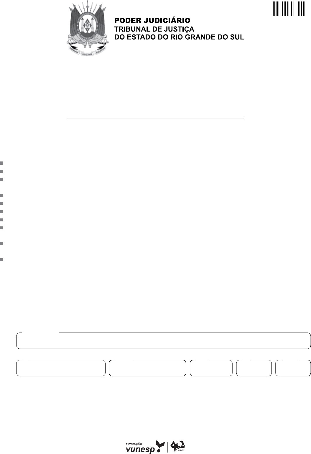 concurso público de provas e títulos para a outorga de delegação de serviços notariais e registrais do estado do rio grande do sul remoção 002. Prova objetiva de seleção você recebeu sua folha de respostas e este caderno contendo 100 questões objetivas. Confira seus dados impressos na capa deste caderno e na folha de respostas. Quando for permitido abrir o caderno, verifique se está completo ou se apresenta imperfeições. Caso haja algum problema, informe ao fiscal da sala. Leia cuidadosamente todas as questões e escolha a resposta que você considera correta. Marque, na folha de respostas, com caneta de tinta preta, a letra correspondente à alternativa que você escolheu. A duração da prova é de 5 horas, já incluído o tempo para o preenchimento da folha de respostas. Só será permitida a saída definitiva da sala e do prédio após transcorridas 2 horas do início da prova. Deverão permanecer em cada uma das salas de prova os 3 últimos candidatos, até que o último deles entregue sua prova, assinando termo respectivo. Ao sair, você entregará ao fiscal a folha de respostas e este caderno, podendo levar apenas o rascunho de gabarito, localizado em sua carteira, para futura conferência. Até que você saia do prédio, todas as proibições e orientações continuam válidas. AguArde A ordem do fiscAl pArA Abrir este cAderno de questões. 04.05.2019 Nome do candidato Prédio sala carteiraInscriçãorg 241143 3 TJRS1801/002-NotárioRegistrador-Remoção ConheCimentos espeCífiCos RegistRos Públicos, DiReito NotaRial e PRotesto De títulos 01. Quanto ao prazo de validade da prenotação, é correto afirmar que não é prorrogado (A) pela suscitação de dúvida. (B) pela determinação judicial expressa para que seja prorrogado tal prazo. (C) pela necessidade de o Oficial exigir depósito prévio em título judicial de mandado de averbação de pro- testo contra alienação de bens. (D) pelo processo extrajudicial de retificação de registro. (E) pelo processo extrajudicial de usucapião. 02. No que diz respeito ao registro do usufruto deducto no Registro de Imóveis, é correto afirmar que (A) deve ser registrado no Livro 3. (B) não deve ser registrado nem averbado, por falta de previsão legal. (C) não deve ser registrado nem averbado por decorrer do direito de família. (D) deve ser registrado no Livro 2. (E) deve ser averbado. 03. No que diz respeito à usucapião extrajudicial, é correto asseverar que (A) se tiver por objeto imóvel edificado, a abertura de matrícula independerá de apresentação do habite-se ou outro documento equivalente. (B) se deve fazer prova do recolhimento do ITBI. (C) somente pode ser utilizado para a aquisição do direi- to real de propriedade. (D) não é possível se abranger parte de vários imóveis. (E) a existência de ônus real sobre o imóvel impede o seu reconhecimento. 04. Os atos de registro stricto sensu imobiliários produzem efeitos a partir da data da (A) realização do ato. (B) assinatura do registro, pelo Oficial ou seu preposto. (C) autorização, pelo Oficial de Registro, para a prática do ato. (D) retirada do título pelo apresentante. (E) prenotação. 05. Assinale a alternativa correta. (A) A cópia, autenticada por Tabelião, do instrumento particular, é título apto para o Registro de Imóveis. (B) A posse é situação fática que não pode ser publici- zada na matrícula do imóvel. (C) O registro, no Registro de Imóveis, da cláusula de vigência em um contrato de locação de imóvel urbano, somente pode ser feito se os proprietários do imóvel coincidirem, em sua totalidade, com os lo- cadores contratuais. (D) O arrendamento rural pode ser registrado no Regis- tro de Imóveis. (E) Uma escritura pública de constituição de renda one- rosa sobre certo imóvel não pode ser registrada no Registro Imobiliário. 06. A respeito da alienação fiduciária em garantia de bem imóvel, é correto asseverar que (A) após consolidada a propriedade pelo credor fiduciá- rio, em razão da constituição em mora do devedor, é possível o registro de qualquer negócio jurídico de alienação do imóvel, independentemente de ter sido ou não realizada em público leilão, uma vez que não há o estabelecimento legal de pena para o credor que não realiza os leilões estipulados na Lei no 9.514/97. (B) a propriedade fiduciária constitui um direito real sobre coisa alheia, de modo que uma certidão que responda ao quesito sobre quem seja o proprietá- rio do imóvel deverá informar o nome do devedor fiduciante. (C) não pode a nua-propriedade ser alienada fiduciaria- mente, devendo o seu registro ser negado. (D) o domínio útil pode ser alienado fiduciariamente, sen- do possível o seu registro. (E) não é possível alienar fiduciariamente imóvel locado com cláusula de vigência registrada. 4TJRS1801/002-NotárioRegistrador-Remoção 09. Na lavratura do registro de óbito, o Oficial de RCPN tem que fazer constar, obrigatoriamente, a seguinte informação: (A) a residência dos pais. (B) o nome do hospital que atendeu o de cujus, mesmo em caso de morte em outro local. (C) o número da CNH do falecido, caso fosse motorista. (D) a hora do falecimento. (E) a variável raça/cor. 10. O Sr. Pileco, radialista famoso, tem 60 anos e é um personagem notório, muito conhecido em sua cidade e região do Vale do Paraíba. Assina, apresenta-se e preen- che todos seus cadastros como João Pileco de Souza Fernandes. Todavia, ao solicitar a 2a via de sua certidão de nascimento, descobre que o nome constante de seu assento de nascimento é apenas João de Souza Fer- nandes. Diante disso, solicita ao Oficial de RCPN que corrija o seu registro, já que entende estar errado. Qual a resposta que você, como Oficial, daria a ele? (A) O requerimento para a inclusão do prenome Pileco pode ser feito judicialmente, nos termos do art. 58 da LRP, por se tratar de apelido pelo qual ele é conheci- do há anos, socialmente. (B) 