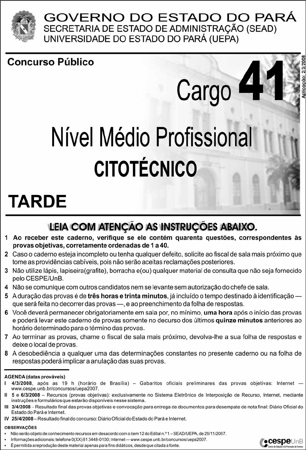 UnB/CESPE – SEAD/UEPA Cargo 41: Nível Médio Profissional – Citotécnico – 1 – • Nas questões de 1 a 40, marque, em cada uma, a única opção correta, de acordo com o respectivo comando. Para as devidas marcações, use a folha de respostas, único documento válido para a correção das suas provas. • Nas questões que avaliam Noções de Informática, a menos que seja explicitamente informado o contrário, considere que todos os programas mencionados estão em configuração-padrão, em português, que o mouse está configurado para pessoas destras e que expressões como clicar, clique simples e clique duplo referem-se a cliques com o botão esquerdo do mouse. Considere também que não há restrições de proteção, de funcionamento e de uso em relação aos programas, arquivos, diretórios e equipamentos mencionados. CONHECIMENTOS BÁSICOS Texto para as questões de 1 a 8 Onde mais? A gente não se dá conta, mas existe um outro vício (eu diria: vírus) de linguagem infectando indiscriminadamente1 brasileiros de todas as idades, sexos e estratos sociais. Falo do insidioso “onde”. Sim: insidioso. À primeira vista, “onde” parece uma palavra inocente e inofensiva. Mas, sem fazer alarde, o danado do “onde” foi se imiscuindo na nossa vida, invadindo frases que não lhe dizem respeito e diminuindo4 consideravelmente as oportunidades de emprego para palavras honestas como “que”, “o qual” e “das quais”. Todos os momentos em que deveríamos usar “em que”, muitas situações nas quais antigamente se usava “nas quais” e uma série de casos “onde” pedem nada além de um simples “que”, de repente, viraram momentos “onde”, situações “onde” e casos7 “onde”. Casos “onde” ?!! Esse maldito “onde” é ainda mais perigoso, porque, na maioria das vezes, a gente nem nota que ele está ali, apodrecendo uma frase inteira. Tem vezes “onde” a gente consegue perceber, mas existem construções mais elaboradas “onde” até os ouvidos10 mais sensíveis acabam engambelados. É diferente do irritante “com certeza”, que tem uma melancia pendurada no pescoço e não esquece de se anunciar a cada aparição. Não é como a praga do gerundismo, que sempre vai estar chamando a atenção de todos os que não suportam estar13 ouvindo quem insiste em estar falando desse jeito. O “onde”, não. O “onde” é discreto. Vai chegar um momento “onde” você e eu vamos passar a falar assim e vamos achar normal. Confesso que eu não tinha me dado conta do problema até conversar com o professor Eduardo Martins em seu programa16 na Rádio Eldorado, o “De palavra em palavra”. (Parênteses. Sim, existe ALGUÉM nesse país que leva “Xongas” a sério. E esse alguém é ninguém menos que o professor Eduardo Martins. Não, leitor, você não precisa mais ler “Xongas” escondido, ou fingindo que está com os olhos no resto da página. O Eduardo Martins também lê! — obrigadíssimo pela audiência, Professor.)19 Depois do programa do professor Eduardo, vi o assunto sendo discutido no programa de TV do professor Pasquale, e ainda recebi várias newsletters pela Internet que tocavam no problema do “onde”. Ou seja: os estudiosos já estão há muito tempo cientes do problema. Agora é preciso envolver o resto da população no combate a essa epidemia. Aliás, aqui vai uma sugestão à produção22 da próxima “Casa dos Artistas”: vamos fazer da Tiazinha, da Feiticeira e dos Gêmeos os garotos-propaganda de uma campanha pela erradicação do “com certeza”, do “eu vou estar transferindo a sua ligação” e do “tem casos onde”. O absurdo maior é que o “onde” está deixando de ser usado justamente nos momentos em que deveria, ou seja, quando é relativo a lugares.25 Quase ninguém mais diz “o lugar onde nasci” ou “as cidades onde morei”. Agora é o lugar “que” eu nasci, as cidades “que” eu morei. Se essa troca de função entre o “onde” e o “que” for mais longe, aonde (a quê?) vamos parar? Já pensou? Em vez de “a mulher que eu amo”, você vai dizer “a mulher onde eu amo”. (Às vezes as duas coisas coincidem, mas outras vezes o28 objeto do desejo está inacessível ou com enxaqueca.) Mas o pior vai ser quando “por que” virar “por onde”. “Por que você não foi?” vai virar “Por onde você não foi?”, o que vai suscitar múltiplas interpretações. Além do que (do onde?), aprender de novo quando o poronde é junto, quando o por onde é separado e quando o porônde31 leva acento vai ser complicado demais nessa idade. Ricardo Freire. Época, 25/12/2001 (com adaptações). QUESTÃO 1 De acordo com o texto, “onde” A pode ser plenamente substituído por outras palavras, sem prejuízo de sentido. B deve ser empregado em todos os momentos em que se emprega em que. C é discreto e, por isso, pode ser empregado sem problemas, em lugar de que. D vem sendo indiscriminadamente empregado, em lugar de outros pronomes. QUESTÃO 2 Assinale o trecho do texto em que o emprego de onde está de acordo com a prescrição gramatical. A “e uma série de casos ‘onde’ pedem nada além de um simples ‘que’” (R.6-7). B “Tem vezes ‘onde’ a gente consegue perceber, mas existem construções mais elaboradas ‘onde’ até os ouvidos mais sensíveis acabam engambelados” (R.10-11). C “O ‘onde’, não. O ‘onde’ é discreto. Vai chegar um momento ‘onde’ você e eu vamos passar a falar assim e vamos achar normal” (R.14-15). D “Quase ninguém mais diz ‘o lugar onde nasci’ ou ‘as cidades onde morei’. Agora é o lugar ‘que’ eu nasci, as cidades ‘que’ eu morei” (R.26-27). UnB/CESPE – SEAD/UEPA Cargo 41: Nível Médio Profissional – Citotécnico – 2 – QUESTÃO 3 De acordo com o texto, é correto afirmar que A o uso exagerado do pronome “onde” não é tão pernicioso quanto o uso do “com certeza” ou do gerundismo. B o autor empre