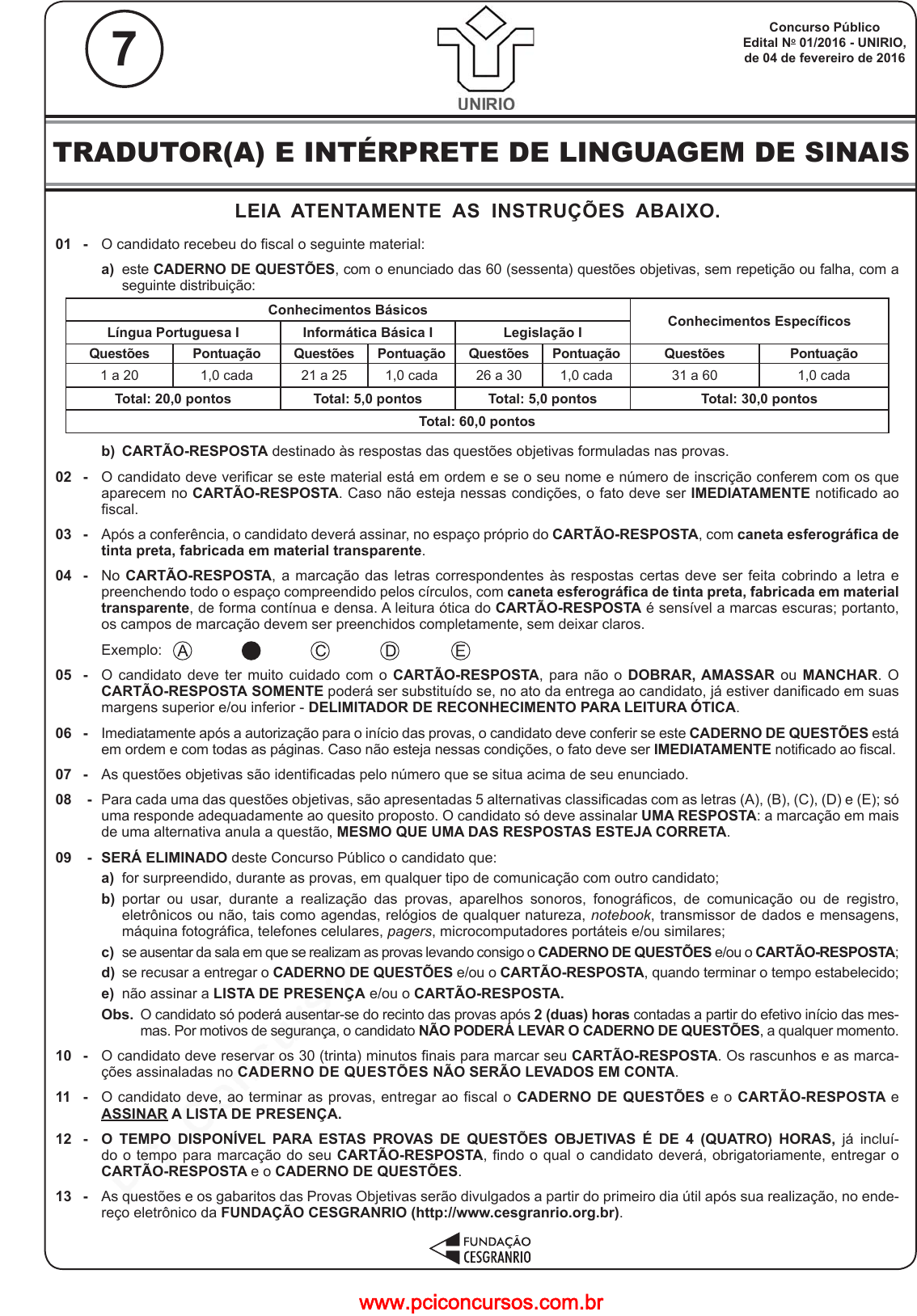 pcimarkpci MDAwMDowMDAwOjAwMDA6MDAwMDowMDAwOmZmZmY6MzZlOTpjMjU5:U3VuLCAxMiBTZXAgMjAyMSAwMjozNjoxOCAtMDMwMA== LEIA ATENTAMENTE AS INSTRUÇÕES ABAIXO. 01 - O candidato recebeu do fiscal o seguinte material: a) este CADERNO DE QUESTÕES, com o enunciado das 60 (sessenta) questões objetivas, sem repetição ou falha, com a seguinte distribuição: Conhecimentos Básicos Conhecimentos Específicos Língua Portuguesa I Informática Básica I Legislação I Questões Pontuação Questões Pontuação Questões Pontuação Questões Pontuação 1 a 20 1,0 cada 21 a 25 1,0 cada 26 a 30 1,0 cada 31 a 60 1,0 cada Total: 20,0 pontos Total: 5,0 pontos Total: 5,0 pontos Total: 30,0 pontos Total: 60,0 pontos b) CARTÃO-RESPOSTA destinado às respostas das questões objetivas formuladas nas provas. 02 - O candidato deve verificar se este material está em ordem e se o seu nome e número de inscrição conferem com os que aparecem no CARTÃO-RESPOSTA. Caso não esteja nessas condições, o fato deve ser IMEDIATAMENTE notificado ao fiscal. 03 - Após a conferência, o candidato deverá assinar, no espaço próprio do CARTÃO-RESPOSTA, com caneta esferográfica de tinta preta, fabricada em material transparente. 04 - No CARTÃO-RESPOSTA, a marcação das letras correspondentes às respostas certas deve ser feita cobrindo a letra e preenchendo todo o espaço compreendido pelos círculos, com caneta esferográfica de tinta preta, fabricada em material transparente, de forma contínua e densa. A leitura ótica do CARTÃO-RESPOSTA é sensível a marcas escuras; portanto, os campos de marcação devem ser preenchidos completamente, sem deixar claros. Exemplo: 05 - O candidato deve ter muito cuidado com o CARTÃO-RESPOSTA, para não o DOBRAR, AMASSAR ou MANCHAR. O CARTÃO-RESPOSTA SOMENTE poderá ser substituído se, no ato da entrega ao candidato, já estiver danificado em suas margens superior e/ou inferior - DELIMITADOR DE RECONHECIMENTO PARA LEITURA ÓTICA. 06 - Imediatamente após a autorização para o início das provas, o candidato deve conferir se este CADERNO DE QUESTÕES está em ordem e com todas as páginas. Caso não esteja nessas condições, o fato deve ser IMEDIATAMENTE notificado ao fiscal. 07 - As questões objetivas são identificadas pelo número que se situa acima de seu enunciado. 08 - Para cada uma das questões objetivas, são apresentadas 5 alternativas classificadas com as letras (A), (B), (C), (D) e (E); só uma responde adequadamente ao quesito proposto. O candidato só deve assinalar UMA RESPOSTA: a marcação em mais de uma alternativa anula a questão, MESMO QUE UMA DAS RESPOSTAS ESTEJA CORRETA. 09 - SERÁ ELIMINADO deste Concurso Público o candidato que: a) for surpreendido, durante as provas, em qualquer tipo de comunicação com outro candidato; b) portar ou usar, durante a realização das provas, aparelhos sonoros, fonográficos, de comunicação ou de registro, eletrônicos ou não, tais como agendas, relógios de qualquer natureza, notebook, transmissor de dados e mensagens, máquina fotográfica, telefones celulares, pagers, microcomputadores portáteis e/ou similares; c) se ausentar da sala em que se realizam as provas levando consigo o CADERNO DE QUESTÕES e/ou o CARTÃO-RESPOSTA; d) se recusar a entregar o CADERNO DE QUESTÕES e/ou o CARTÃO-RESPOSTA, quando terminar o tempo estabelecido; e) não assinar a LISTA DE PRESENÇA e/ou o CARTÃO-RESPOSTA. Obs. O candidato só poderá ausentar-se do recinto das provas após 2 (duas) horas contadas a partir do efetivo início das mes- mas. Por motivos de segurança, o candidato NÃO PODERÁ LEVAR O CADERNO DE QUESTÕES, a qualquer momento. 10 - O candidato deve reservar os 30 (trinta) minutos finais para marcar seu CARTÃO-RESPOSTA. Os rascunhos e as marca- ções assinaladas no CADERNO DE QUESTÕES NÃO SERÃO LEVADOS EM CONTA. 11 - O candidato deve, ao terminar as provas, entregar ao fiscal o CADERNO DE QUESTÕES e o CARTÃO-RESPOSTA e ASSINAR A LISTA DE PRESENÇA. 12 - O TEMPO DISPONÍVEL PARA ESTAS PROVAS DE QUESTÕES OBJETIVAS É DE 4 (QUATRO) HORAS, já incluí- do o tempo para marcação do seu CARTÃO-RESPOSTA, findo o qual o candidato deverá, obrigatoriamente, entregar o CARTÃO-RESPOSTA e o CADERNO DE QUESTÕES. 13 - As questões e os gabaritos das Provas Objetivas serão divulgados a partir do primeiro dia útil após sua realização, no ende- reço eletrônico da FUNDAÇÃO CESGRANRIO (http://www.cesgranrio.org.br). Concurso Público Edital No 01/2016 - UNIRIO, de 04 de fevereiro de 20167 TRADUTOR(A) E INTÉRPRETE DE LINGUAGEM DE SINAIS www.pciconcursos.com.br pcimarkpci MDAwMDowMDAwOjAwMDA6MDAwMDowMDAwOmZmZmY6MzZlOTpjMjU5:U3VuLCAxMiBTZXAgMjAyMSAwMjozNjoxOCAtMDMwMA== RA SC UN HO www.pciconcursos.com.br pcimarkpci MDAwMDowMDAwOjAwMDA6MDAwMDowMDAwOmZmZmY6MzZlOTpjMjU5:U3VuLCAxMiBTZXAgMjAyMSAwMjozNjoxOCAtMDMwMA== TRADUTOR(A) E INTÉRPRETE DE LINGUAGEM DE SINAIS 3 UNIRIO 1 A leitura atenta do Texto I permite sustentar que o título dado à crônica (A) contradiz a informação de que o autor nasceu em 1936. (B) mostra originalidade no emprego equivocado das aspas. (C) contém uma homenagem explícita aos bailes de car- naval. (D) tem continuidade sintática nos versos transcritos no primeiro parágrafo do texto. (E) é a reprodução de uma frase-feita empregada costu- meiramente entre os mais idosos. CONHECIMENTOS BÁSICOS LÍNGUA PORTUGUESA I Texto I “Quando eu for bem velhinho / Bem velhinho, que [precise] usar um bastão / Eu hei de ter um netinho, ah... / Pra me levar pela mão / No carnaval, eu não fico em casa / Eu não fico, eu vou brincar! / Nem que eu vá me sentar na calçada / Pra ver meu bloco passar...” Lupicínio Rodrigues — autor de elaboradas e densas canções de amor — surpreende escre- vendo, em 1936, ano em que nasci, essa singela e comovente marchinha carnavalesca. Uma raridade que constrói e, ao mesmo tempo, define um carna- val. O carnaval como um ritual — como um encon- tro neces