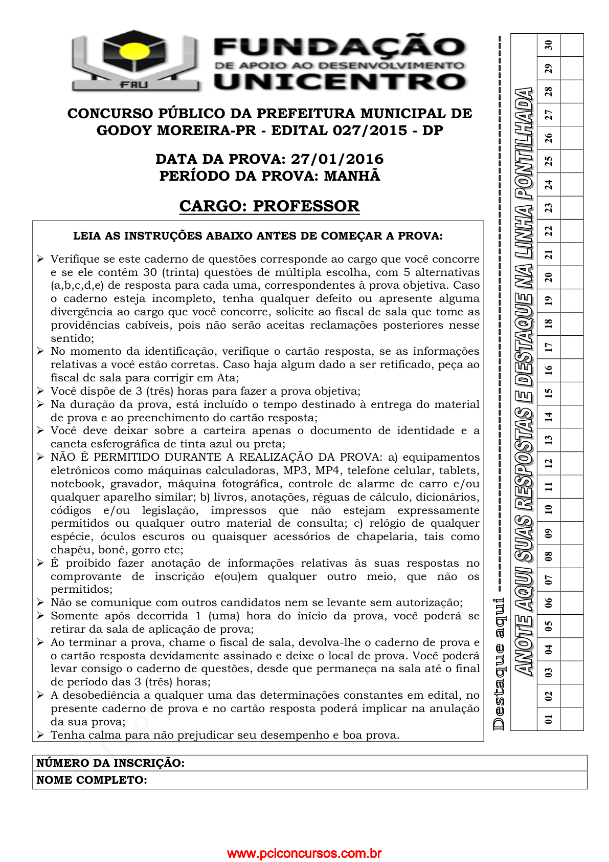 pcimarkpci MDAwMDowMDAwOjAwMDA6MDAwMDowMDAwOmZmZmY6MzZlOTpjMjU5:U3VuLCAxMiBTZXAgMjAyMSAwODoyMzoyMiAtMDMwMA== CONCURSO PÚBLICO DA PREFEITURA MUNICIPAL DE GODOY MOREIRA-PR - EDITAL 027/2015 - DP DATA DA PROVA: 27/01/2016 PERÍODO DA PROVA: MANHÃ CARGO: PROFESSOR 3 0 2 9 2 8 2 7 2 6 2 5 2 4 2 3 2 2 2 1 2 0 1 9 1 8 1 7 1 6 1 5 1 4 1 3 1 2 1 1 1 0 0 9 0 8 0 7 0 6 0 5 0 4 0 3 0 2 0 1 LEIA AS INSTRUÇÕES ABAIXO ANTES DE COMEÇAR A PROVA: Verifique se este caderno de questões corresponde ao cargo que você concorre e se ele contém 30 (trinta) questões de múltipla escolha, com 5 alternativas (a,b,c,d,e) de resposta para cada uma, correspondentes à prova objetiva. Caso o caderno esteja incompleto, tenha qualquer defeito ou apresente alguma divergência ao cargo que você concorre, solicite ao fiscal de sala que tome as providências cabíveis, pois não serão aceitas reclamações posteriores nesse sentido; No momento da identificação, verifique o cartão resposta, se as informações relativas a você estão corretas. Caso haja algum dado a ser retificado, peça ao fiscal de sala para corrigir em Ata; Você dispõe de 3 (três) horas para fazer a prova objetiva; Na duração da prova, está incluído o tempo destinado à entrega do material de prova e ao preenchimento do cartão resposta; Você deve deixar sobre a carteira apenas o documento de identidade e a caneta esferográfica de tinta azul ou preta; NÃO É PERMITIDO DURANTE A REALIZAÇÃO DA PROVA: a) equipamentos eletrônicos como máquinas calculadoras, MP3, MP4, telefone celular, tablets, notebook, gravador, máquina fotográfica, controle de alarme de carro e/ou qualquer aparelho similar; b) livros, anotações, réguas de cálculo, dicionários, códigos e/ou legislação, impressos que não estejam expressamente permitidos ou qualquer outro material de consulta; c) relógio de qualquer espécie, óculos escuros ou quaisquer acessórios de chapelaria, tais como chapéu, boné, gorro etc; É proibido fazer anotação de informações relativas às suas respostas no comprovante de inscrição e(ou)em qualquer outro meio, que não os permitidos; Não se comunique com outros candidatos nem se levante sem autorização; Somente após decorrida 1 (uma) hora do início da prova, você poderá se retirar da sala de aplicação de prova; Ao terminar a prova, chame o fiscal de sala, devolva-lhe o caderno de prova e o cartão resposta devidamente assinado e deixe o local de prova. Você poderá levar consigo o caderno de questões, desde que permaneça na sala até o final de período das 3 (três) horas; A desobediência a qualquer uma das determinações constantes em edital, no presente caderno de prova e no cartão resposta poderá implicar na anulação da sua prova; Tenha calma para não prejudicar seu desempenho e boa prova. NÚMERO DA INSCRIÇÃO: NOME COMPLETO: www.pciconcursos.com.brwww.pciconcursos.com.br pcimarkpci MDAwMDowMDAwOjAwMDA6MDAwMDowMDAwOmZmZmY6MzZlOTpjMjU5:U3VuLCAxMiBTZXAgMjAyMSAwODoyMzoyMiAtMDMwMA== 2 E NÃO QUE VAI DAR TEMPO? Em 2009, quando o Rio de Janeiro foi escolhido para sediar a Olimpíada, o Brasil era outro: a economia crescia até então, o desemprego caía e a inflação estava sob controle. Aos olhos do mundo, o Cristo Redentor preparava a sua grande decolagem. Seis anos depois, os índices viraram de ponta-cabeça – e o país enfrenta uma crise como nunca se viu. Mas eis que nem tudo é desgraça: a oito meses da Olimpíada, para surpresa dos céticos, falta muito pouco para tudo ficar pronto. O Parque Olímpico está praticamente terminado. No terreno na Zona Oeste Carioca, onde ficaram as arenas de dezesseis modalidades esportivas, 94% do prometido está de pé. A obra mais atrasada, o centro olímpico de tênis, tem 85% as quadras e das arquibancadas no lugar e pôde sediar um evento-teste, neste mês, como programado. Mesmo os gastos, ao menos aqueles registrados na planilha oficial, permanecem dentro do razoável: as obras olímpicas vão totalizar 6,67 bilhões de reais, pouco mais de 1% acima do esperado. Como competidor global, não foi neste ano que o Brasil decolou. Mas como anfitrião, ele está pronto para fazer bonito. E não é que vai dar tempo? Revista Veja 2458, ano 46, nº 52. Editora Abril, 30 de dezembro de 2015, p. 77. 01) O assunto do texto é: (A) A crise financeira econômica e política enfrentada pelo Brasil. (B) O Brasil, sede das Olimpíadas, e o fato de que, ao contrário do esperado, o parque Olímpico está praticamente terminado. (C) A história que antecede a escolha do Brasil como sede das Olimpíadas. (D) Os gastos realizados para terminar o parque Olímpico. (E) O Brasil como competidor global. 02) No fragmento: “Aos olhos do mundo o Cristo Redentor preparava a sua grande decolagem”, o sintagma sublinhado está empregado em sentido _____________(conotativo ou denotativo) e retoma: (A) Está empregado em sentido conotativo, retomando de forma ampla, o Brasil e, de forma restrita, o Rio de Janeiro. (B) Está empregado em sentido denotativo, retomando o monumento mais importante do Rio de Janeiro. (C) Está empregado em sentido conotativo, retornando simplesmente a referência a um monumento qualquer do Brasil. (D) Está empregado em sentido denotativo e retoma um lugar turístico. (E) Está empregado em sentido conotativo, retomando o sul do Brasil e os imigrantes italianos. 03) Marque a alternativa em que a conjunção sublinhada é coordenativa adversativa: (A) Em 2009, quando o Rio de Janeiro foi escolhido para sediar a Olimpíada, o Brasil era outro: a economia crescia até então, o desemprego caía e a inflação estava sob controle. (B) [...] não foi neste ano que o Brasil decolou. (C) Como competidor global, não foi neste ano que o Brasil decolou. (D) Mas eis que nem tudo é desgraça: a oito meses da Olimpíada, para surpresa dos céticos, falta pouco para dar tudo ficar pronto. (E) Seis anos depois, os índices viraram de ponta-cabeça – e o pa