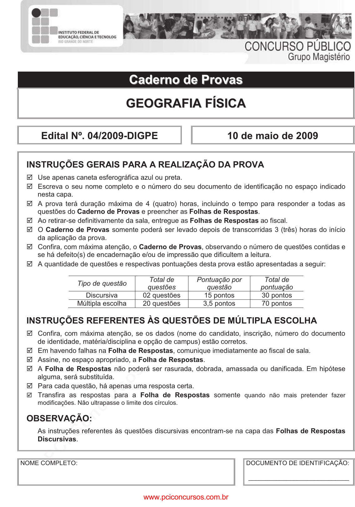pcimarkpci MDAwMDowMDAwOjAwMDA6MDAwMDowMDAwOmZmZmY6MzZlOTpjMjU5:U3VuLCAxMiBTZXAgMjAyMSAxMDoxNzoxMyAtMDMwMA== CCaaddeerrnnoo ddee PPrroovvaass GGEEOOGGRRAAFFIIAA FFÍÍSSIICCAA Edital Nº. 04/2009-DIGPE 10 de maio de 2009 INSTRUÇÕES GERAIS PARA A REALIZAÇÃO DA PROVA þ Use apenas caneta esferográfica azul ou preta. þ Escreva o seu nome completo e o número do seu documento de identificação no espaço indicado nesta capa. þ A prova terá duração máxima de 4 (quatro) horas, incluindo o tempo para responder a todas as questões do Caderno de Provas e preencher as Folhas de Respostas. þ Ao retirar-se definitivamente da sala, entregue as Folhas de Respostas ao fiscal. þ O Caderno de Provas somente poderá ser levado depois de transcorridas 3 (três) horas do início da aplicação da prova. þ Confira, com máxima atenção, o Caderno de Provas, observando o número de questões contidas e se há defeito(s) de encadernação e/ou de impressão que dificultem a leitura. þ A quantidade de questões e respectivas pontuações desta prova estão apresentadas a seguir: Tipo de questão Total de questões Pontuação por questão Total de pontuação Discursiva 02 questões 15 pontos 30 pontos Múltipla escolha 20 questões 3,5 pontos 70 pontos INSTRUÇÕES REFERENTES ÀS QUESTÕES DE MÚLTIPLA ESCOLHA þ Confira, com máxima atenção, se os dados (nome do candidato, inscrição, número do documento de identidade, matéria/disciplina e opção de campus) estão corretos. þ Em havendo falhas na Folha de Respostas, comunique imediatamente ao fiscal de sala. þ Assine, no espaço apropriado, a Folha de Respostas. þ A Folha de Respostas não poderá ser rasurada, dobrada, amassada ou danificada. Em hipótese alguma, será substituída. þ Para cada questão, há apenas uma resposta certa. þ Transfira as respostas para a Folha de Respostas somente quando não mais pretender fazer modificações. Não ultrapasse o limite dos círculos. OBSERVAÇÃO: As instruções referentes às questões discursivas encontram-se na capa das Folhas de Respostas Discursivas. NOME COMPLETO: DOCUMENTO DE IDENTIFICAÇÃO: _____________________________ www.pciconcursos.com.br pcimarkpci MDAwMDowMDAwOjAwMDA6MDAwMDowMDAwOmZmZmY6MzZlOTpjMjU5:U3VuLCAxMiBTZXAgMjAyMSAxMDoxNzoxMyAtMDMwMA== CONCURSO PÚBLICO – GRUPO MAGISTÉRIO EDITAL Nº. 04/2009-DIGPE/IFRN PROFESSOR_GEOGRAFIA FÍSICA.DOC 1 QUESTÕES DISCURSIVAS ESTAS QUESTÕES DEVERÃO SER RESPONDIDAS NAS FOLHAS DE RESPOSTAS DAS QUESTÕES DISCURSIVAS. 1. (15 pontos) A maior parte das cidades, assim como as áreas rurais, têm problemas com a erosão. Explique como isso acontece e como esse problema pode ser amenizado. 2. (15 pontos) Descreva os processos e os mecanismos da circulação geral da atmosfera terrestre, destacando os movimentos atmosféricos primários, secundários e terciários, tanto em escalas de área quanto de tempo. www.pciconcursos.com.br pcimarkpci MDAwMDowMDAwOjAwMDA6MDAwMDowMDAwOmZmZmY6MzZlOTpjMjU5:U3VuLCAxMiBTZXAgMjAyMSAxMDoxNzoxMyAtMDMwMA== CONCURSO PÚBLICO – GRUPO MAGISTÉRIO EDITAL Nº. 04/2009-DIGPE/IFRN PROFESSOR_GEOGRAFIA FÍSICA.DOC 2 QUESTÕES DE MÚLTIPLA ESCOLHA AS RESPOSTAS DESTAS QUESTÕES DEVERÃO SER ASSINALADAS NA FOLHA DE RESPOSTAS DAS QUESTÕES DE MÚLTIPLA ESCOLHA. 1. (3,5 pontos) Os estudos realizados em várias regiões do globo evidenciaram que os solos são produtos da interação de fatores ativos e passivos, tais como a) relevo, água, ar, homem e fauna. b) clima, rocha, relevo, organismo e tempo. c) rocha, fauna, relevo, homem e tempo. d) organismo, tempo, flora, rocha e homem. 2. (3,5 pontos) A figura abaixo, representada por uma quadrícula de um mapa topográfico, mostra uma linha tracejada indicando o caminho percorrido por um geógrafo nos interflúvios de uma bacia hidrográfica, durante uma viagem de reconhecimento de área. Nos seus apontamentos consta que ele percorreu uma distância de 3,25km, que, na escala do referido mapa, equivale a Escala 1/50.000 a) 5,6 cm. b) 5,0 cm. c) 6,5 cm. d) 7,0 cm. 3. (3,5 pontos) Considere as características a seguir: assoreamento de canais, alterações do ciclo hidrológico, diminuição da infiltração, aumento do escoamento superficial. Tudo isso são características ambientais que resultam a) do desmatamento de áreas florestadas. b) do barramento de canais de drenagem. c) da poluição de rios e mares. d) da erosão acelerada nas encostas. www.pciconcursos.com.br pcimarkpci MDAwMDowMDAwOjAwMDA6MDAwMDowMDAwOmZmZmY6MzZlOTpjMjU5:U3VuLCAxMiBTZXAgMjAyMSAxMDoxNzoxMyAtMDMwMA== CONCURSO PÚBLICO – GRUPO MAGISTÉRIO EDITAL Nº. 04/2009-DIGPE/IFRN PROFESSOR_GEOGRAFIA FÍSICA.DOC 3 4. (3,5 pontos) As variações de relevo podem desenvolver ventos causados por um gradiente de pressão ou podendo, em parte, ser de origem térmica. Durante a noite, o ar, em contato com o solo arrefecido, aumenta de densidade e tende a escoar pelas encostas, acumulando-se nos vales e, não raramente, fluindo acima dos rios. Durante o dia, acontecerá o inverso, em contato com as encostas aquecidas pelo sol, o ar adquire calor e se expande, tornando-se menos denso, movimentando-se no sentido ascensional das encostas. VAREJÂO, Silva. Meteorologia e climatologia. Recife: 2005, versão digital, p. 359, com adaptações. Os dois movimentos do ar descritos acima são, respectivamente, a) vento catabático e vento anabático. b) brisa terrestre e brisa marítima. c) vento de vale e vento de montanha. d) vento geostrófico e vento de gradiente. 5. (3,5 pontos) O ar atmosférico, se olhado por qualquer observador sobre a superfície da Terra, é afetado pela força de Coriolis ou Defletora que se deve à rotação da Terra e provoca nos objetos e no ar o movimento com a) um aparente desvio do ar para a direita de sua trajetória, no hemisfério Sul e para a esquerda, no hemisfério Norte. b) um aparente desvio do ar para a esquerda de sua trajetória, no hemisfério Sul e para a direita, no hemis