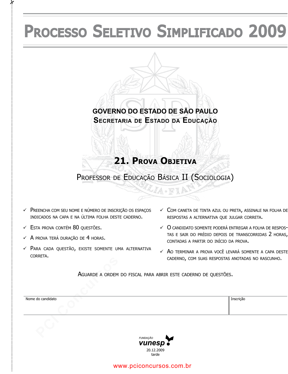 pcimarkpci MDAwMDowMDAwOjAwMDA6MDAwMDowMDAwOmZmZmY6MzZlOTpjMjU5:U3VuLCAxMiBTZXAgMjAyMSAxNzowODoyNSAtMDMwMA==  Preencha com seu nome e número de inscrição os esPaços indicados na caPa e na última folha deste caderno.  esta Prova contém 80 questões.  a Prova terá duração de 4 horas.  Para cada questão, existe somente uma alternativa correta.  com caneta de tinta azul ou Preta, assinale na folha de resPostas a alternativa que julgar correta.  o candidato somente Poderá entregar a folha de resPos- tas e sair do Prédio dePois de transcorridas 2 horas, contadas a Partir do início da Prova.  ao terminar a Prova você levará somente a caPa deste caderno, com suas resPostas anotadas no rascunho. aguarde a ordem do fiscal Para abrir este caderno de questões. Nome do candidato Inscrição 20.12.2009 tarde Processo seletivo simPlificado 2009 GOVERNO DO ESTADO DE SÃO PAULO Secretaria de eStado da educação 21. Prova objetiva Professor de educação básica ii (sociologia) www.pciconcursos.com.br pcimarkpci MDAwMDowMDAwOjAwMDA6MDAwMDowMDAwOmZmZmY6MzZlOTpjMjU5:U3VuLCAxMiBTZXAgMjAyMSAxNzowODoyNSAtMDMwMA== 2SEED0902/21-PEBII-Sociologia-tarde-20 Processo seletivo simPlificado 2009 Rascunho QUE STÃ O RESPOSTA 01 02 03 04 05 A B C D E A B C D E A B C D E A B C D E A B C D E 06 07 08 09 10 A B C D E A B C D E A B C D E A B C D E A B C D E 11 12 13 14 15 A B C D E A B C D E A B C D E A B C D E A B C D E 16 17 18 19 20 A B C D E A B C D E A B C D E A B C D E A B C D E QUE STÃ O RESPOSTA QUES TÃO RESPOSTA 21 22 23 24 25 A B C D E A B C D E A B C D E A B C D E A B C D E 26 27 28 29 30 A B C D E A B C D E A B C D E A B C D E A B C D E 31 32 33 34 35 A B C D E A B C D E A B C D E A B C D E A B C D E 36 37 38 39 40 A B C D E A B C D E A B C D E A B C D E A B C D E QUE STÃ O RESPOSTA QUES TÃO RESPOSTA 41 42 43 44 45 A B C D E A B C D E A B C D E A B C D E A B C D E 46 47 48 49 50 A B C D E A B C D E A B C D E A B C D E A B C D E 51 52 53 54 55 A B C D E A B C D E A B C D E A B C D E A B C D E 56 57 58 59 60 A B C D E A B C D E A B C D E A B C D E A B C D E QUE STÃ O RESPOSTA QUES TÃO RESPOSTA 61 62 63 64 65 A B C D E A B C D E A B C D E A B C D E A B C D E 66 67 68 69 70 A B C D E A B C D E A B C D E A B C D E A B C D E 71 72 73 74 75 A B C D E A B C D E A B C D E A B C D E A B C D E 76 77 78 79 80 A B C D E A B C D E A B C D E A B C D E A B C D E QUE STÃ O RESPOSTA www.pciconcursos.com.br pcimarkpci MDAwMDowMDAwOjAwMDA6MDAwMDowMDAwOmZmZmY6MzZlOTpjMjU5:U3VuLCAxMiBTZXAgMjAyMSAxNzowODoyNSAtMDMwMA== 3 SEED0902/21-PEBII-Sociologia-tarde-20 CONHECIMENTOS PEDAGÓGICOS 01. Para iniciar a reunião pedagógica bimestral, a coordenadora Solange distribuiu entre os grupos de professores a seguinte afirmação: ... “a extensão das tecnologias e das redes informáticas favo- recem a comunicação com o outro, mas reforça as tendências de cada um para se fechar sobre si mesmo e se isolar”... (Delors, 2001) Os grupos de trabalho passaram a discutir as implicações desse pensamento de Delors sobre o cotidiano de suas práticas, recorrendo a ele para (A) justificar os graves problemas disciplinares apresentados pelos alunos, sobretudo os do curso noturno. (B) responsabilizar a escola na priorização de atividades individuais de aprendizagem. (C) escolher atividades curriculares que promovam a comu- nicação e a cooperação entre alunos, professores, pais e comunidade. (D) desenvolver uma proposta pedagógica que valorize o ensino a distância. (E) incentivar o uso de redes de informática para garantir o sucesso dos alunos nas avaliações. 02. Em sua obra “O ensino na sociedade do conhecimento: educa- ção na era da insegurança”, Hargreaves analisa o signi ficado da expressão sociedade do conhecimento afirmando que uma de suas características é a mudança. A partir dessa afirmação do autor, pode-se dizer que o projeto pedagógico da escola, na sociedade atual, deve objetivar o preparo dos indivíduos para (A) viverem melhor na regulamentação social. (B) viverem adaptados às redes de uniformidade técnica. (C) se comprometerem com a prosperidade. (D) valorizarem a microgestão da uniformidade curricular. (E) valorizarem a criatividade e a solidariedade. 03. Conforme sugestão apresentada nos PCNs (1997), a utiliza- ção do espaço e do tempo na escola reflete a concepção da organização escolar e interfere, diretamente, na construção da autonomia dos alunos. Sugere também meios para a criação de situações em que o aluno possa controlar a realização de suas atividades tomando consciência de suas possibilidades. São situações que a escola e o professor devem propor: I. o professor como orientador de atividades, a organiza- ção em grupos, disponibilizando os recursos materiais e deixando os alunos responsáveis pelo planejamento e execução das atividades intra e extraescolares, em um horário adequado ao projeto educativo; II. a escola deve prover carteiras móveis para facilitar o trabalho em grupo, o diálogo e a cooperação; favorecer o acesso dos alunos a armários e prateleiras de uso frequen- te; responsabilizar os alunos pela decoração das paredes com trabalhos, exibindo ordem e limpeza na classe; III. o professor como orientador do processo nas atividades cognitivas, deixando as de caráter artístico cultural como responsabilidade dos alunos, favorecendo o exercício da criatividade e da autonomia; criar critérios para decoração das paredes e para organização das atividades voltadas à improvisação de espaços educativos. Assinale a alternativa que apresenta situações favoráveis ao desenvolvimento da autonomia do aluno e do caráter forma- tivo da escola. (A) I, II e III. (B) I e II, apenas. (C) I e III, apenas. (D) II, apenas. (E) III, apenas. 04. Zabala (1998) considera a aprendizagem como uma constru- ção pessoal, que cada um realiza graças à ajuda que recebe de outras pessoas. O sujeito que aprende participa do processo por meio de seu
