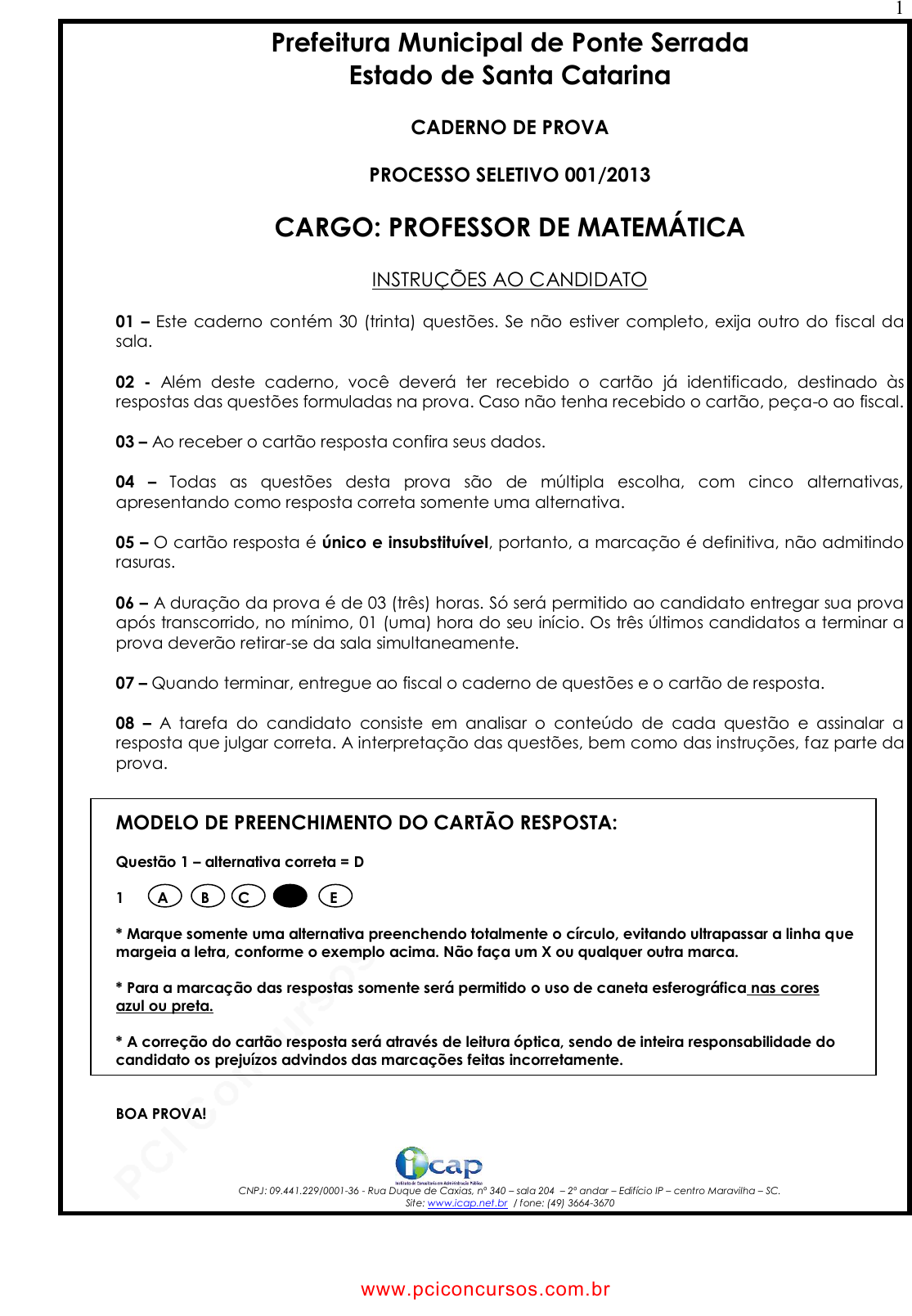 pcimarkpci MDAwMDowMDAwOjAwMDA6MDAwMDowMDAwOmZmZmY6MzZlOTpjMjU5:TW9uLCAxMyBTZXAgMjAyMSAwMjo1Nzo0OCAtMDMwMA== 1 Prefeitura Municipal de Ponte Serrada Estado de Santa Catarina CADERNO DE PROVA PROCESSO SELETIVO 001/2013 CARGO: PROFESSOR DE MATEMÁTICA INSTRUÇÕES AO CANDIDATO 01 – Este caderno contém 30 (trinta) questões. Se não estiver completo, exija outro do fiscal da sala. 02 - Além deste caderno, você deverá ter recebido o cartão já identificado, destinado às respostas das questões formuladas na prova. Caso não tenha recebido o cartão, peça-o ao fiscal. 03 – Ao receber o cartão resposta confira seus dados. 04 – Todas as questões desta prova são de múltipla escolha, com cinco alternativas, apresentando como resposta correta somente uma alternativa. 05 – O cartão resposta é único e insubstituível, portanto, a marcação é definitiva, não admitindo rasuras. 06 – A duração da prova é de 03 (três) horas. Só será permitido ao candidato entregar sua prova após transcorrido, no mínimo, 01 (uma) hora do seu início. Os três últimos candidatos a terminar a prova deverão retirar-se da sala simultaneamente. 07 – Quando terminar, entregue ao fiscal o caderno de questões e o cartão de resposta. 08 – A tarefa do candidato consiste em analisar o conteúdo de cada questão e assinalar a resposta que julgar correta. A interpretação das questões, bem como das instruções, faz parte da prova. MODELO DE PREENCHIMENTO DO CARTÃO RESPOSTA: Questão 1 – alternativa correta = D 1 A B C D E * Marque somente uma alternativa preenchendo totalmente o círculo, evitando ultrapassar a linha que margeia a letra, conforme o exemplo acima. Não faça um X ou qualquer outra marca. * Para a marcação das respostas somente será permitido o uso de caneta esferográfica nas cores azul ou preta. * A correção do cartão resposta será através de leitura óptica, sendo de inteira responsabilidade do candidato os prejuízos advindos das marcações feitas incorretamente. BOA PROVA! CNPJ: 09.441.229/0001-36 - Rua Duque de Caxias, nº 340 – sala 204 – 2º andar – Edifício IP – centro Maravilha – SC. Site: www.icap.net.br / fone: (49) 3664-3670 www.pciconcursos.com.br pcimarkpci MDAwMDowMDAwOjAwMDA6MDAwMDowMDAwOmZmZmY6MzZlOTpjMjU5:TW9uLCAxMyBTZXAgMjAyMSAwMjo1Nzo0OCAtMDMwMA== 2 CONHECIMENTOS GERAIS PORTUGUÊS 01) Analise a pontuação dos períodos abaixo, também a justificativa e assinale com C os que estiverem certos e com F, os errados: ( ) Toda mulher é um anjo, um encanto, um sonho e um problema. – é obrigatório o emprego das vírgulas para separar os termos coordenados. ( ) Possuía lavouras, de trigo, de linho, de arroz e de soja. – Também nesse período a pontuação está correta, pois separa termos coordenados, isto é, adjuntos adnominais. ( ) Na próxima semana, o prefeito visitará várias comunidades. – Nessa oração, a vírgula separa uma locução adverbial anteposta. ( ) O instinto social é privilégio dos homens, contudo, o deparamos também nos animais. – As vírgulas enfatizam a conjunção e separam oração coordenada sindética. ( ) O pai, tristonho, viu a partida do filho. – Nessa oração, a oração separa um adjetivo em função de predicativo. Assinale a sequência correta: a) C, C, C, C, C. b) E, E, E, E, E. c) C, E, C, E, C. d) E, C, E, C, E. e) C, C, E, E, C. 02) As palavras que recebem acento gráfico pela mesma razão que o justifica em domínio e saído são respectivamente: a) Sufrágio e possível. b) Média e obrigará. c) Agrária e países. d) Difícil e salário. e) Histórico e torná-los. 03) Há erro no emprego do porquê na alternativa: a) Não sei por que faltaste ontem. b) Finalmente entendi porque não gostas de novelas. c) Estudem, porque a prova é difícil. d) Todos estudam muito porque querem passar no concurso. e) Em vão, indaga-se o porque de tanta confusão. 04) O substantivo solidez deve ser classificado como substantivo: a) Comum. b) Abstrato. c) Simples. d) Derivado. e) Todas as alternativas anteriores estão corretas. www.pciconcursos.com.br pcimarkpci MDAwMDowMDAwOjAwMDA6MDAwMDowMDAwOmZmZmY6MzZlOTpjMjU5:TW9uLCAxMyBTZXAgMjAyMSAwMjo1Nzo0OCAtMDMwMA== 3 05) Assinale a alternativa que apresenta erro nas expressões sublinhadas: a) O novo escritório, situado no centro financeiro da cidade, era mais grande que confortável. b) Minha paixão tem olhos azuis-claros, profundos e brilhantes. c) Ternos azul-marinho, gravatas azul-petróleo davam tom austero ao evento; contudo as senhoras, elegantérrimas, com vestidos rosa, amenizavam toda a sisudez masculina. d) O pôr do sol coloriu o horizonte de tons vermelho-sangue. e) Os lançamentos da indústria automotiva trouxeram carros verde-abacate, inaceitáveis em outras épocas. 06) Assinale a alternativa incorreta quanto ao emprego de pronome: a) Trarei a legislação pertinente ao caso para tu leres com calma e, assim, tomares uma decisão abalizada. b) Você, que entende de literatura, recomende um bom livro para eu ler nas férias. c) Para esclarecer esse problema, melhor será o diretor falar com nós dois o quanto antes. d) Solicito a S. Exa. dignar-vos aceitar as homenagens devidas, por justiça, a quem tanto engrandeceu o município. (ofício dirigido ao governador) e) O rapazinho trazia consigo a intolerância. 07) Assinale a alternativa correta quanto ao emprego da regência verbal ou nominal: a) Todas as indagações serão respondidas pela comissão. b) Todos os diretores leram e concordaram com a proposta. c) Cecília nunca pôde perdoar a madrasta por ter esquecido o convite. d) Os torcedores só se acalmaram quando os ônibus chegaram no estádio. e) O interior do casarão também não agradou os decoradores contratados pelo diretor. MATEMÁTICA 08) Marta, ao receber seu 13º salário, aplicou metade à taxa de juro simples de1,6% ao mês e a outra metade à taxa de juro simples de 3,2% ao mês. Depois de um mês recebeu um montan