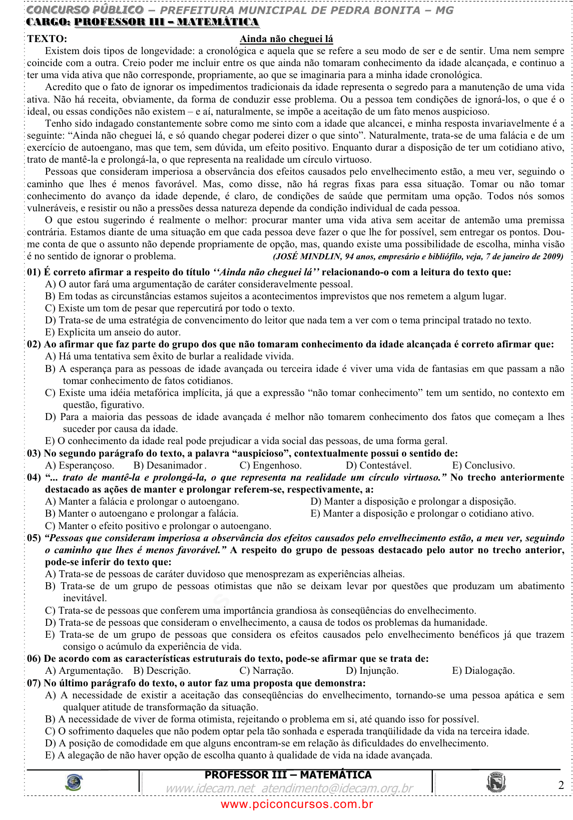 pcimarkpci MDAwMDowMDAwOjAwMDA6MDAwMDowMDAwOmZmZmY6MzZlOTpjMjU5:TW9uLCAxMyBTZXAgMjAyMSAwMzowNzowOSAtMDMwMA== CCCOOONNNCCCUUURRRSSSOOO PPPÚÚÚBBBLLLIIICCCOOO � PREFEITURA MUNICIPAL DE PEDRA BONITA – MG PROFESSOR III – MATEMÁTICA www.idecam.net atendimento@idecam.org.br 2 CCCAAARRRGGGOOO::: PROFESSOR III – MATEMÁTICAPPRROOFFEESSSSOORR IIIIII –– MMAATTEEMMÁÁTTIICCAA TEXTO: Ainda não cheguei lá Existem dois tipos de longevidade: a cronológica e aquela que se refere a seu modo de ser e de sentir. Uma nem sempre coincide com a outra. Creio poder me incluir entre os que ainda não tomaram conhecimento da idade alcançada, e continuo a ter uma vida ativa que não corresponde, propriamente, ao que se imaginaria para a minha idade cronológica. Acredito que o fato de ignorar os impedimentos tradicionais da idade representa o segredo para a manutenção de uma vida ativa. Não há receita, obviamente, da forma de conduzir esse problema. Ou a pessoa tem condições de ignorá-los, o que é o ideal, ou essas condições não existem – e aí, naturalmente, se impõe a aceitação de um fato menos auspicioso. Tenho sido indagado constantemente sobre como me sinto com a idade que alcancei, e minha resposta invariavelmente é a seguinte: “Ainda não cheguei lá, e só quando chegar poderei dizer o que sinto”. Naturalmente, trata-se de uma falácia e de um exercício de autoengano, mas que tem, sem dúvida, um efeito positivo. Enquanto durar a disposição de ter um cotidiano ativo, trato de mantê-la e prolongá-la, o que representa na realidade um círculo virtuoso. Pessoas que consideram imperiosa a observância dos efeitos causados pelo envelhecimento estão, a meu ver, seguindo o caminho que lhes é menos favorável. Mas, como disse, não há regras fixas para essa situação. Tomar ou não tomar conhecimento do avanço da idade depende, é claro, de condições de saúde que permitam uma opção. Todos nós somos vulneráveis, e resistir ou não a pressões dessa natureza depende da condição individual de cada pessoa. O que estou sugerindo é realmente o melhor: procurar manter uma vida ativa sem aceitar de antemão uma premissa contrária. Estamos diante de uma situação em que cada pessoa deve fazer o que lhe for possível, sem entregar os pontos. Dou- me conta de que o assunto não depende propriamente de opção, mas, quando existe uma possibilidade de escolha, minha visão é no sentido de ignorar o problema. (JOSÉ MINDLIN, 94 anos, empresário e bibliófilo, veja, 7 de janeiro de 2009) 01) É correto afirmar a respeito do título ‘‘Ainda não cheguei lá’’ relacionando-o com a leitura do texto que: A) O autor fará uma argumentação de caráter consideravelmente pessoal. B) Em todas as circunstâncias estamos sujeitos a acontecimentos imprevistos que nos remetem a algum lugar. C) Existe um tom de pesar que repercutirá por todo o texto. D) Trata-se de uma estratégia de convencimento do leitor que nada tem a ver com o tema principal tratado no texto. E) Explicita um anseio do autor. 02) Ao afirmar que faz parte do grupo dos que não tomaram conhecimento da idade alcançada é correto afirmar que: A) Há uma tentativa sem êxito de burlar a realidade vivida. B) A esperança para as pessoas de idade avançada ou terceira idade é viver uma vida de fantasias em que passam a não tomar conhecimento de fatos cotidianos. C) Existe uma idéia metafórica implícita, já que a expressão “não tomar conhecimento” tem um sentido, no contexto em questão, figurativo. D) Para a maioria das pessoas de idade avançada é melhor não tomarem conhecimento dos fatos que começam a lhes suceder por causa da idade. E) O conhecimento da idade real pode prejudicar a vida social das pessoas, de uma forma geral. 03) No segundo parágrafo do texto, a palavra “auspicioso”, contextualmente possui o sentido de: A) Esperançoso. B) Desanimador . C) Engenhoso. D) Contestável. E) Conclusivo. 04) “... trato de mantê-la e prolongá-la, o que representa na realidade um círculo virtuoso.” No trecho anteriormente destacado as ações de manter e prolongar referem-se, respectivamente, a: A) Manter a falácia e prolongar o autoengano. D) Manter a disposição e prolongar a disposição. B) Manter o autoengano e prolongar a falácia. E) Manter a disposição e prolongar o cotidiano ativo. C) Manter o efeito positivo e prolongar o autoengano. 05) “Pessoas que consideram imperiosa a observância dos efeitos causados pelo envelhecimento estão, a meu ver, seguindo o caminho que lhes é menos favorável.” A respeito do grupo de pessoas destacado pelo autor no trecho anterior, pode-se inferir do texto que: A) Trata-se de pessoas de caráter duvidoso que menosprezam as experiências alheias. B) Trata-se de um grupo de pessoas otimistas que não se deixam levar por questões que produzam um abatimento inevitável. C) Trata-se de pessoas que conferem uma importância grandiosa às conseqüências do envelhecimento. D) Trata-se de pessoas que consideram o envelhecimento, a causa de todos os problemas da humanidade. E) Trata-se de um grupo de pessoas que considera os efeitos causados pelo envelhecimento benéficos já que trazem consigo o acúmulo da experiência de vida. 06) De acordo com as características estruturais do texto, pode-se afirmar que se trata de: A) Argumentação. B) Descrição. C) Narração. D) Injunção. E) Dialogação. 07) No último parágrafo do texto, o autor faz uma proposta que demonstra: A) A necessidade de existir a aceitação das conseqüências do envelhecimento, tornando-se uma pessoa apática e sem qualquer atitude de transformação da situação. B) A necessidade de viver de forma otimista, rejeitando o problema em si, até quando isso for possível. C) O sofrimento daqueles que não podem optar pela tão sonhada e esperada tranqüilidade da vida na terceira idade. D) A posição de comodidade em que alguns encontram-se em relação às dificu