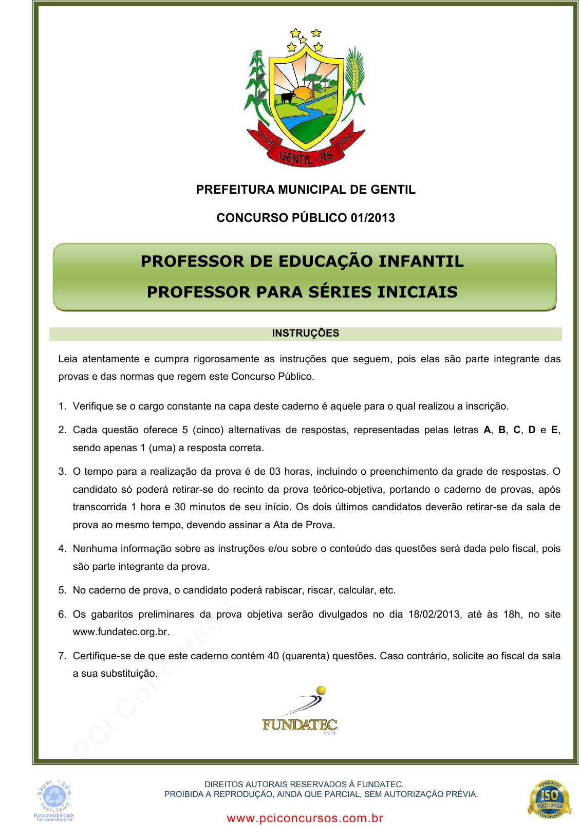 pcimarkpci MDAwMDowMDAwOjAwMDA6MDAwMDowMDAwOmZmZmY6MzZlOTpjMjU5:TW9uLCAxMyBTZXAgMjAyMSAwNDo0OToxMSAtMDMwMA== DIREITOS AUTORAIS RESERVADOS À FUNDATEC. PROIBIDA A REPRODUÇÃO, AINDA QUE PARCIAL, SEM AUTORIZAÇÃO PRÉVIA. PREFEITURA MUNICIPAL DE GENTIL CONCURSO PÚBLICO 01/2013 PROFESSOR DE EDUCAÇÃO INFANTIL PROFESSOR PARA SÉRIES INICIAIS INSTRUÇÕES Leia atentamente e cumpra rigorosamente as instruções que seguem, pois elas são parte integrante das provas e das normas que regem este Concurso Público. 1. Verifique se o cargo constante na capa deste caderno é aquele para o qual realizou a inscrição. 2. Cada questão oferece 5 (cinco) alternativas de respostas, representadas pelas letras A, B, C, D e E, sendo apenas 1 (uma) a resposta correta. 3. O tempo para a realização da prova é de 03 horas, incluindo o preenchimento da grade de respostas. O candidato só poderá retirar-se do recinto da prova teórico-objetiva, portando o caderno de provas, após transcorrida 1 hora e 30 minutos de seu início. Os dois últimos candidatos deverão retirar-se da sala de prova ao mesmo tempo, devendo assinar a Ata de Prova. 4. Nenhuma informação sobre as instruções e/ou sobre o conteúdo das questões será dada pelo fiscal, pois são parte integrante da prova. 5. No caderno de prova, o candidato poderá rabiscar, riscar, calcular, etc. 6. Os gabaritos preliminares da prova objetiva serão divulgados no dia 18/02/2013, até às 18h, no site www.fundatec.org.br. 7. Certifique-se de que este caderno contém 40 (quarenta) questões. Caso contrário, solicite ao fiscal da sala a sua substituição. www.pciconcursos.com.br pcimarkpci MDAwMDowMDAwOjAwMDA6MDAwMDowMDAwOmZmZmY6MzZlOTpjMjU5:TW9uLCAxMyBTZXAgMjAyMSAwNDo0OToxMSAtMDMwMA== ProvaA_Base_V2_7/2/201316:47:56 Execução: Fundatec PROFESSORES 2 LÍNGUA PORTUGUESA Instrução: As questões de números 01 a 12 referem-se ao texto abaixo. Como agir quando os pais dos alunos considerados difíceis, mesmo sendo chamados pela escola, ficam indiferentes? 01 02 03 04 05 06 07 08 09 10 11 12 13 14 Inicialmente, cabe reforçar que nenhuma família está satisfeita diante de um filho "difícil", mesmo que aparentemente pareça estar. Em geral, os pais já fizeram tudo que sabiam para modificar as coisas e se sentem _________. O melhor a fazer é ouvi-los e ampará-los. De nada adianta chamar os pais para reclamar que a criança é "terrível" ou tentar ensiná-los a educá-la. Esse tipo de conduta não resolverá, pois isso possivelmente já ocorreu e não trouxe resultados efetivos. Portanto, é preciso procurar outros caminhos. Os pais devem, antes de mais nada, saber que existe alguém que compreende o que eles estão passando. É preciso ainda ter ________ com os que se mostrarem __________, pois, __________, eles se sentem angustiados em relação a si mesmos, a seus filhos e aos profissionais e estão, portanto, numa posição defensiva. Quando os pais quiserem conselhos, eles mesmos solicitarão e, quando o professor os der, é importante reconhecer que ninguém realmente tem todas as respostas. O que se pode fazer é apenas concordar em experimentar diferentes estratégias mais coerentes com o desenvolvimento socioafetivo da criança e que atendam às necessidades dela. (Fonte:Telma Vinha, abril.com.br/crianca-e-adolescente/comportamento/como-agir-quando-pais-alunos-considerados-dificeis-mesmo- sendo-chamados-pela-escola-ficam-indiferentes-618147.shtml – adaptação) QUESTÃO 01 – Avalie as seguintes afirmações a respeito da palavra a nas ocorrências assinaladas no texto. I. Na linha 04 do texto, a palavra a é um artigo feminino definido. II. Na linha 09, as duas ocorrências da palavra a são preposições. III. Na linha 14, em às, ocorre a contração do artigo definido feminino as com a preposição a. Quais estão corretas? A) Apenas I. B) Apenas II. C) Apenas I e II. D) Apenas II e III. E) I, II e III. QUESTÃO 02 – Assinale a alternativa cujas palavras completam corretamente as lacunas tracejadas das linhas 03 e 08 (três ocorrências), considerando a correta grafia de cada uma delas. A) frustados – paciência – agressivos – com certeza B) fustrados – pasciência – agrecivos – concerteza C) frustrados – paciência – agrecivos – concerteza D) frustados – pasciência – agressivos – concerteza E) frustrados – paciência – agressivos – com certeza QUESTÃO 03 – Qual das seguintes palavras vem ao encontro do que está sendo apresentado pelo texto? A) Discrição. B) Orientação. C) Negação. D) Imposição. E) Inadequação. QUESTÃO 04 – Na frase De nada adianta chamar os pais para reclamar que a criança é "terrível" ou tentar ensiná-los a educá-la. (l. 04 e 05), os pronomes negritados – los e la – exercem a função de __________________, tendo como referente, respectivamente, as expressões ________________ e ____________________. As lacunas do trecho acima ficam correta e respectivamente preenchidas por: A) complemento nominal – os pais – a criança B) complemento nominal – a criança – os pais C) objeto indireto – a criança – os pais D) adjunto adnominal – os pais – a criança E) objeto direto – os pais – a criança QUESTÃO 05 – Os nexos coesivos pois (linha 08) e portanto (linha 09), nos respectivos contextos de ocorrência, expressam A) conclusão e explicação. B) explicação e concessão. C) explicação e conclusão. D) conclusão e concessão. E) concessão e explicação. www.pciconcursos.com.br pcimarkpci MDAwMDowMDAwOjAwMDA6MDAwMDowMDAwOmZmZmY6MzZlOTpjMjU5:TW9uLCAxMyBTZXAgMjAyMSAwNDo0OToxMSAtMDMwMA== ProvaA_Base_V2_7/2/201316:47:56 Execução: Fundatec PROFESSORES 3 QUESTÃO 06 – Analise as seguintes propostas de alteração de segmentos textuais: I. A expressão “as coisas” (l. 02) poderia ser substituída por “a situação”, mantendo-se o mesmo sentido e a correção gramática. II. A palavra conduta (l. 05) poderia ser substituída po
