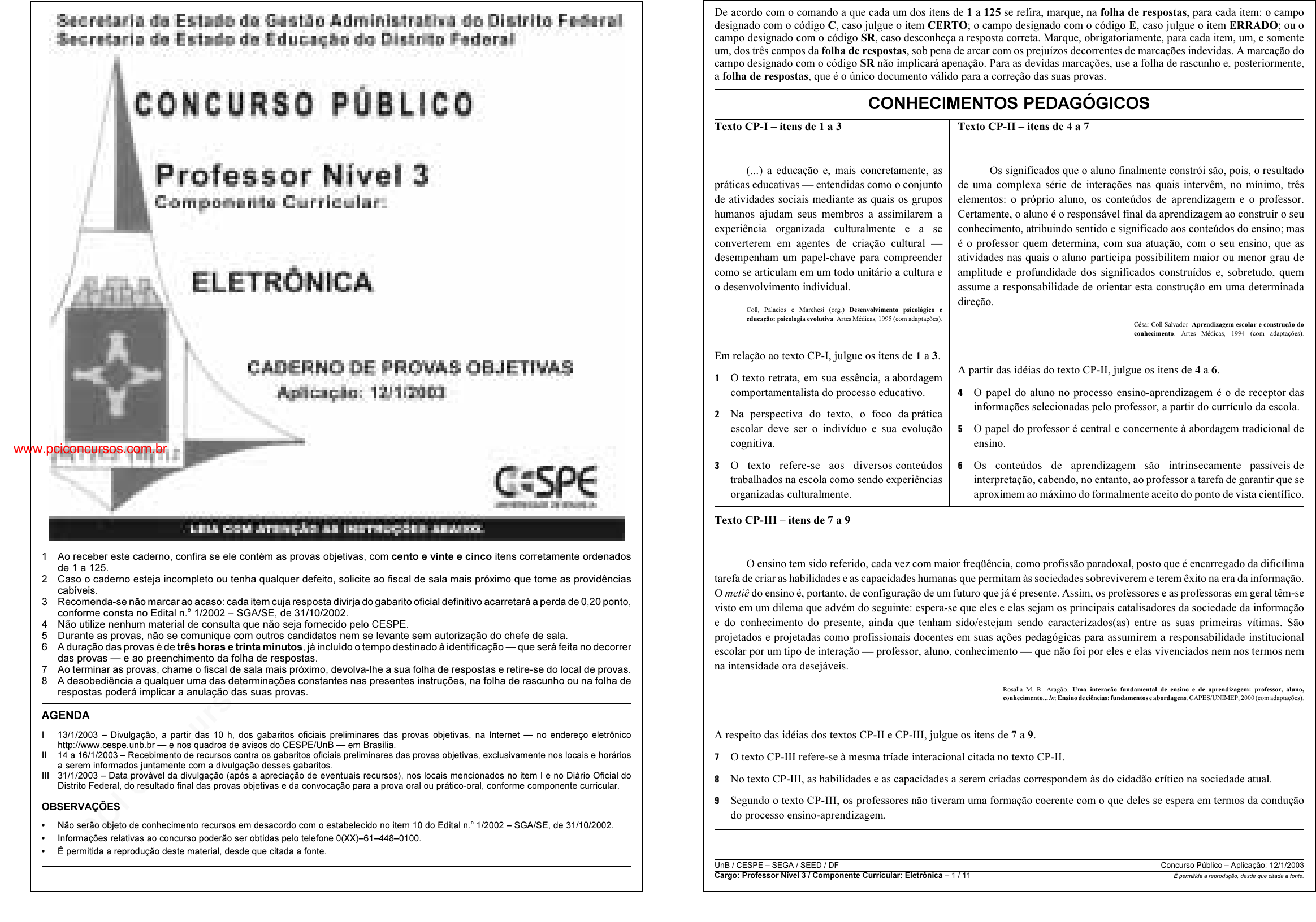 pcimarkpci MDAwMDowMDAwOjAwMDA6MDAwMDowMDAwOmZmZmY6MzZlOTpjMjU5:TW9uLCAxMyBTZXAgMjAyMSAwOToxNjoxMCAtMDMwMA== 1 Ao receber este caderno, confira se ele contém as provas objetivas, com cento e vinte e cinco itens corretamente ordenados de 1 a 125. 2 Caso o caderno esteja incompleto ou tenha qualquer defeito, solicite ao fiscal de sala mais próximo que tome as providências cabíveis. 3 Recomenda-se não marcar ao acaso: cada item cuja resposta divirja do gabarito oficial definitivo acarretará a perda de 0,20 ponto, conforme consta no Edital n.o 1/2002 – SGA/SE, de 31/10/2002. 4 Não utilize nenhum material de consulta que não seja fornecido pelo CESPE. 5 Durante as provas, não se comunique com outros candidatos nem se levante sem autorização do chefe de sala. 6 A duração das provas é de três horas e trinta minutos, já incluído o tempo destinado à identificação — que será feita no decorrer das provas — e ao preenchimento da folha de respostas. 7 Ao terminar as provas, chame o fiscal de sala mais próximo, devolva-lhe a sua folha de respostas e retire-se do local de provas. 8 A desobediência a qualquer uma das determinações constantes nas presentes instruções, na folha de rascunho ou na folha de respostas poderá implicar a anulação das suas provas. AGENDA I 13/1/2003 – Divulgação, a partir das 10 h, dos gabaritos oficiais preliminares das provas objetivas, na Internet — no endereço eletrônico http://www.cespe.unb.br — e nos quadros de avisos do CESPE/UnB — em Brasília. II 14 a 16/1/2003 – Recebimento de recursos contra os gabaritos oficiais preliminares das provas objetivas, exclusivamente nos locais e horários a serem informados juntamente com a divulgação desses gabaritos. III 31/1/2003 – Data provável da divulgação (após a apreciação de eventuais recursos), nos locais mencionados no item I e no Diário Oficial do Distrito Federal, do resultado final das provas objetivas e da convocação para a prova oral ou prático-oral, conforme componente curricular. OBSERVAÇÕES • Não serão objeto de conhecimento recursos em desacordo com o estabelecido no item 10 do Edital n.o 1/2002 – SGA/SE, de 31/10/2002. • Informações relativas ao concurso poderão ser obtidas pelo telefone 0(XX)–61–448–0100. • É permitida a reprodução deste material, desde que citada a fonte. UnB / CESPE – SEGA / SEED / DF Concurso Público – Aplicação: 12/1/2003 Cargo: Professor Nível 3 / Componente Curricular: Eletrônica – 1 / 11 É permitida a reprodução, desde que citada a fonte. De acordo com o comando a que cada um dos itens de 1 a 125 se refira, marque, na folha de respostas, para cada item: o campo designado com o código C, caso julgue o item CERTO; o campo designado com o código E, caso julgue o item ERRADO; ou o campo designado com o código SR, caso desconheça a resposta correta. Marque, obrigatoriamente, para cada item, um, e somente um, dos três campos da folha de respostas, sob pena de arcar com os prejuízos decorrentes de marcações indevidas. A marcação do campo designado com o código SR não implicará apenação. Para as devidas marcações, use a folha de rascunho e, posteriormente, a folha de respostas, que é o único documento válido para a correção das suas provas. CONHECIMENTOS PEDAGÓGICOS Texto CP-I – itens de 1 a 3 (...) a educação e, mais concretamente, as práticas educativas — entendidas como o conjunto de atividades sociais mediante as quais os grupos humanos ajudam seus membros a assimilarem a experiência organizada culturalmente e a se converterem em agentes de criação cultural — desempenham um papel-chave para compreender como se articulam em um todo unitário a cultura e o desenvolvimento individual. Coll, Palacios e Marchesi (org.) Desenvolvimento psicológico e educação: psicologia evolutiva. Artes Médicas, 1995 (com adaptações). Em relação ao texto CP-I, julgue os itens de 1 a 3. �� O texto retrata, em sua essência, a abordagem comportamentalista do processo educativo. �� Na perspectiva do texto, o foco da prática escolar deve ser o indivíduo e sua evolução cognitiva. �� O texto refere-se aos diversos conteúdos trabalhados na escola como sendo experiências organizadas culturalmente. Texto CP-II – itens de 4 a 7 Os significados que o aluno finalmente constrói são, pois, o resultado de uma complexa série de interações nas quais intervêm, no mínimo, três elementos: o próprio aluno, os conteúdos de aprendizagem e o professor. Certamente, o aluno é o responsável final da aprendizagem ao construir o seu conhecimento, atribuindo sentido e significado aos conteúdos do ensino; mas é o professor quem determina, com sua atuação, com o seu ensino, que as atividades nas quais o aluno participa possibilitem maior ou menor grau de amplitude e profundidade dos significados construídos e, sobretudo, quem assume a responsabilidade de orientar esta construção em uma determinada direção. César Coll Salvador. Aprendizagem escolar e construção do conhecimento. Artes Médicas, 1994 (com adaptações). A partir das idéias do texto CP-II, julgue os itens de 4 a 6. �� O papel do aluno no processo ensino-aprendizagem é o de receptor das informações selecionadas pelo professor, a partir do currículo da escola. �� O papel do professor é central e concernente à abordagem tradicional de ensino. �� Os conteúdos de aprendizagem são intrinsecamente passíveis de interpretação, cabendo, no entanto, ao professor a tarefa de garantir que se aproximem ao máximo do formalmente aceito do ponto de vista científico. Texto CP-III – itens de 7 a 9 O ensino tem sido referido, cada vez com maior freqüência, como profissão paradoxal, posto que é encarregado da dificílima tarefa de criar as habilidades e as capacidades humanas que permitam às sociedades sobreviverem e terem êxito na era da informação. O metiê do ensino é, portanto, de co