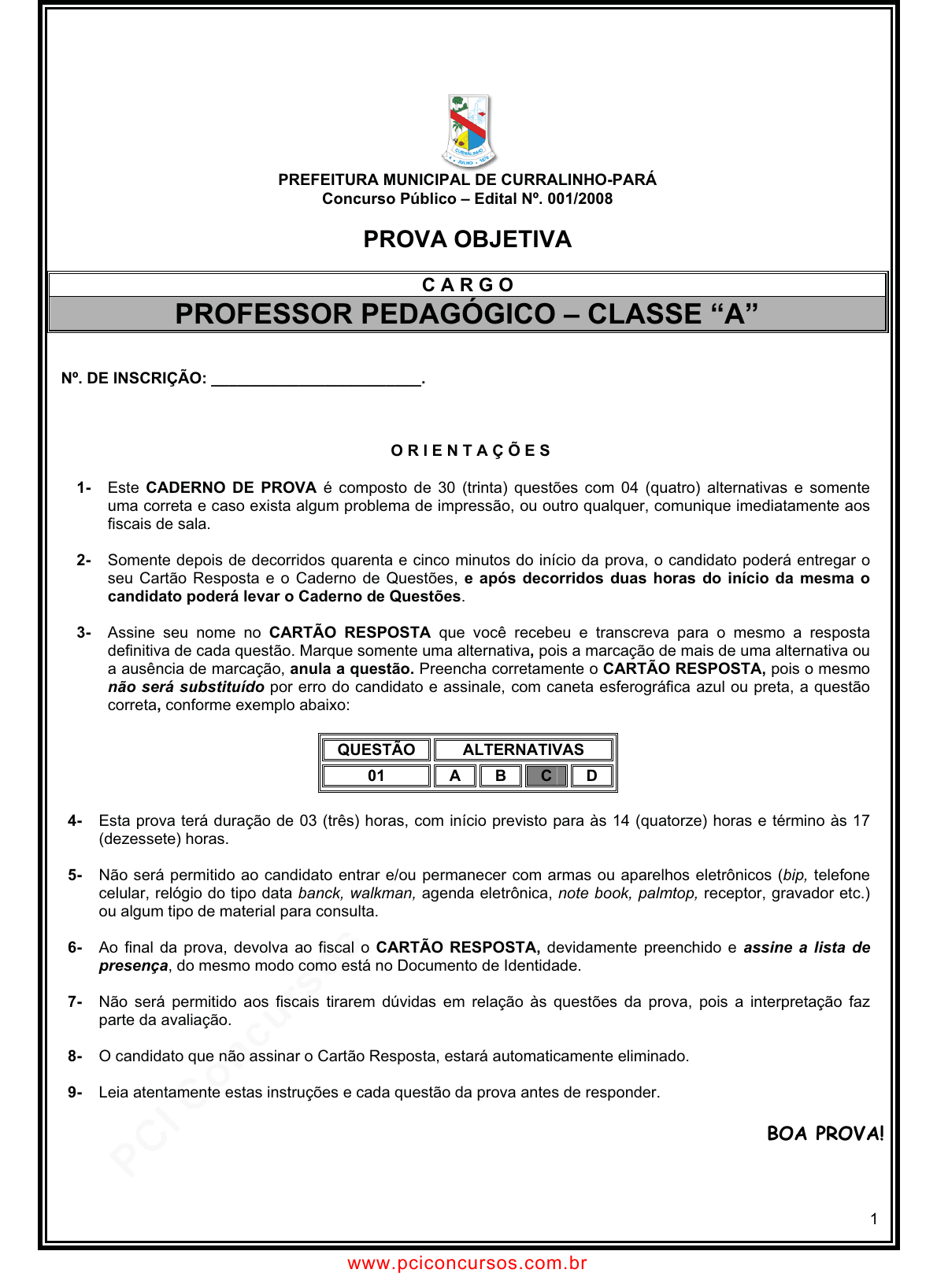 pcimarkpci MDAwMDowMDAwOjAwMDA6MDAwMDowMDAwOmZmZmY6MzZlOTpjMjU5:TW9uLCAxMyBTZXAgMjAyMSAwOTozODo0OSAtMDMwMA== 1 PREFEITURA MUNICIPAL DE CURRALINHO-PARÁ Concurso Público – Edital Nº. 001/2008 PROVA OBJETIVA C A R G O PROFESSOR PEDAGÓGICO – CLASSE “A” Nº. DE INSCRIÇÃO: ________________________. O R I E N T A Ç Õ E S 1- Este CADERNO DE PROVA é composto de 30 (trinta) questões com 04 (quatro) alternativas e somente uma correta e caso exista algum problema de impressão, ou outro qualquer, comunique imediatamente aos fiscais de sala. 2- Somente depois de decorridos quarenta e cinco minutos do início da prova, o candidato poderá entregar o seu Cartão Resposta e o Caderno de Questões, e após decorridos duas horas do início da mesma o candidato poderá levar o Caderno de Questões. 3- Assine seu nome no CARTÃO RESPOSTA que você recebeu e transcreva para o mesmo a resposta definitiva de cada questão. Marque somente uma alternativa, pois a marcação de mais de uma alternativa ou a ausência de marcação, anula a questão. Preencha corretamente o CARTÃO RESPOSTA, pois o mesmo não será substituído por erro do candidato e assinale, com caneta esferográfica azul ou preta, a questão correta, conforme exemplo abaixo: QUESTÃO ALTERNATIVAS 01 A B C D 4- Esta prova terá duração de 03 (três) horas, com início previsto para às 14 (quatorze) horas e término às 17 (dezessete) horas. 5- Não será permitido ao candidato entrar e/ou permanecer com armas ou aparelhos eletrônicos (bip, telefone celular, relógio do tipo data banck, walkman, agenda eletrônica, note book, palmtop, receptor, gravador etc.) ou algum tipo de material para consulta. 6- Ao final da prova, devolva ao fiscal o CARTÃO RESPOSTA, devidamente preenchido e assine a lista de presença, do mesmo modo como está no Documento de Identidade. 7- Não será permitido aos fiscais tirarem dúvidas em relação às questões da prova, pois a interpretação faz parte da avaliação. 8- O candidato que não assinar o Cartão Resposta, estará automaticamente eliminado. 9- Leia atentamente estas instruções e cada questão da prova antes de responder. BOA PROVA! www.pciconcursos.com.br pcimarkpci MDAwMDowMDAwOjAwMDA6MDAwMDowMDAwOmZmZmY6MzZlOTpjMjU5:TW9uLCAxMyBTZXAgMjAyMSAwOTozODo0OSAtMDMwMA== 2 LÍNGUA PORTUGUESA Texto 1: Professores brasileiros provêm de famílias pobres O professor formado pelas universidades brasileiras é filho de pais que nunca foram à escola ou nem sequer completaram os quatro primeiros anos do ensino fundamental. Vive em famílias com renda inferior a R$ 1.800 ao mês e estudou sempre em escola pública. É o que apontou o questionário socioeconômico do provão de 2001 do Ministério da Educação. A profissão, que no século passado abriu espaço no mercado de trabalho para as mulheres, agora ajuda a incluir um novo perfil de trabalhador no mercado formal. Os formandos de cursos como pedagogia, letras, matemática, biologia, física e química (os mais procurados pelos que pretendem ser professores) têm perfil distinto dos que saem de cursos mais concorridos, como medicina, ou de oferta mais comum nas faculdades, como direito e administração. Em letras e matemática, 23,1% e 24,4%, respectivamente, dos formandos vivem em famílias com renda inferior a R$ 540. A média de todos os cursos é de 10,9% dos alunos nessa situação. Em faculdades mais concorridas, como a de odontologia, essa proporção é de apenas 2,2%. O nível de escolaridade também destoa da média. Em pedagogia, por exemplo, 9,8% dos pais dos formandos nunca freqüentaram a escola, enquanto outros 54,7% não completaram a 4ª série do ensino fundamental. Em medicina, um dos mais elitizados, apenas 0,9% dos formandos têm pais que não freqüentaram a escola e 10,7% têm pais que não completaram quatro anos de estudo. (Folha de S. Paulo, 31/12/2001, por Gilberto Dimesntein) 01 - Julgue os itens em Verdadeiro ou Falso e marque a opção correta, respectivamente: a) A tese do texto encontra-se no primeiro parágrafo: “O professor formado pelas universidades brasileiras é filho de pais que nunca foram à escola ou nem sequer completaram os quatro primeiros anos do ensino fundamental”. b) O texto pertence a tipologia dissertativa e ao gênero artigo de jornal. c) De acordo com o primeiro período do segundo parágrafo, há uma idéia de inclusão de homens no mercado de trabalho. d) Ainda no primeiro período do segundo parágrafo, o uso da vírgula foi utilizado para fazer uma explicação a mais, também conhecido como aposto explicativo. A- ( ) V, V, F, V. B- ( ) V, V, V, F. C- ( ) F, V, V, V. D- ( ) V, V, V, V. 02 - Julgue os itens a seguir em Verdadeiro ou Falso e marque a opção correta, respectivamente: a) Considere o seguinte enunciado: “(...) apenas 0,9% dos formandos têm pais que não freqüentaram a (...)”, o verbo ter é acentuado porque é monossílabo tônico. b) Considerando o mesmo enunciado acima, o verbo “ter” é acentuado porque concorda com formandos, 3ª pessoa do plural, daí ser uma concordância verbal. c) O início do segundo parágrafo começa com uma expressão nominal a qual retoma o termo antecedente do primeiro parágrafo (o professor). É um tipo de coesão referencial ou anafórica. d) No primeiro período do terceiro parágrafo temos a ocorrência da palavra “respectivamente”, a qual contrapõe as palavras “letras e matemática” ou “23,1% e 24,4%”. A- ( ) V, V, V, F. B- ( ) F, V, V, V. C- ( ) V, V, V, V. D- ( ) F, V, V, F. Texto II: Palmeiras Vanderlei Luxemburgo está longe de uma unanimidade. É amado por muitos e odiado por outros tantos palmeirenses mundo afora. Ele é também o segundo treinador que mais vezes comandou o Verdão na história. Está atrás apenas do lendário Osvaldo Brandão [1945; 147 e 1948; 1958 a 1960; 1971 a 1975; 1980], com 580 jogos [335 vitórias, 151 empates e 94 derrotas]. www.pciconcursos.com.br pcimarkpci MDAwMDowMDAwOj