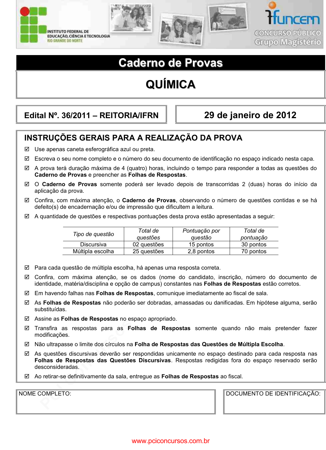 pcimarkpci MDAwMDowMDAwOjAwMDA6MDAwMDowMDAwOmZmZmY6MzZlOTpjMjU5:TW9uLCAxMyBTZXAgMjAyMSAxNTo1OTo1NCAtMDMwMA== CCaaddeerrnnoo ddee PPrroovvaass QQUUÍÍMMIICCAA Edital Nº. 36/2011 – REITORIA/IFRN 29 de janeiro de 2012 INSTRUÇÕES GERAIS PARA A REALIZAÇÃO DA PROVA Use apenas caneta esferográfica azul ou preta. Escreva o seu nome completo e o número do seu documento de identificação no espaço indicado nesta capa. A prova terá duração máxima de 4 (quatro) horas, incluindo o tempo para responder a todas as questões do Caderno de Provas e preencher as Folhas de Respostas. O Caderno de Provas somente poderá ser levado depois de transcorridas 2 (duas) horas do início da aplicação da prova. Confira, com máxima atenção, o Caderno de Provas, observando o número de questões contidas e se há defeito(s) de encadernação e/ou de impressão que dificultem a leitura. A quantidade de questões e respectivas pontuações desta prova estão apresentadas a seguir: Tipo de questão Total de questões Pontuação por questão Total de pontuação Discursiva 02 questões 15 pontos 30 pontos Múltipla escolha 25 questões 2,8 pontos 70 pontos Para cada questão de múltipla escolha, há apenas uma resposta correta. Confira, com máxima atenção, se os dados (nome do candidato, inscrição, número do documento de identidade, matéria/disciplina e opção de campus) constantes nas Folhas de Respostas estão corretos. Em havendo falhas nas Folhas de Respostas, comunique imediatamente ao fiscal de sala. As Folhas de Respostas não poderão ser dobradas, amassadas ou danificadas. Em hipótese alguma, serão substituídas. Assine as Folhas de Respostas no espaço apropriado. Transfira as respostas para as Folhas de Respostas somente quando não mais pretender fazer modificações. Não ultrapasse o limite dos círculos na Folha de Respostas das Questões de Múltipla Escolha. As questões discursivas deverão ser respondidas unicamente no espaço destinado para cada resposta nas Folhas de Respostas das Questões Discursivas. Respostas redigidas fora do espaço reservado serão desconsideradas. Ao retirar-se definitivamente da sala, entregue as Folhas de Respostas ao fiscal. NOME COMPLETO: DOCUMENTO DE IDENTIFICAÇÃO: www.pciconcursos.com.br pcimarkpci MDAwMDowMDAwOjAwMDA6MDAwMDowMDAwOmZmZmY6MzZlOTpjMjU5:TW9uLCAxMyBTZXAgMjAyMSAxNTo1OTo1NCAtMDMwMA== QUESTÕES DISCURSIVAS www.pciconcursos.com.br pcimarkpci MDAwMDowMDAwOjAwMDA6MDAwMDowMDAwOmZmZmY6MzZlOTpjMjU5:TW9uLCAxMyBTZXAgMjAyMSAxNTo1OTo1NCAtMDMwMA== CONCURSO PÚBLICO – GRUPO MAGISTÉRIO EDITAL Nº. 36/2011-REITORIA/IFRN IFRN – Concurso Público – Grupo Magistério – Química 1 ESTAS QUESTÕES DEVERÃO SER RESPONDIDAS NAS FOLHAS DE RESPOSTAS DAS QUESTÕES DISCURSIVAS, MANTENDO O MEMORIAL DE CÁLCULO. Questão 1 No fim do século XIX, as substâncias utilizadas em medicamentos, em produtos de limpeza e em perfumes só podiam ser obtidas no seu estado natural. O desenvolvimento da Química Orgânica possibilitou um grande avanço no campo da indústria, produzindo, sinteticamente, vários materias, desde os mais simples até os mais complexos, como os polímeros. Dado o esquema abaixo, complete as reações, indicando, através da fórmula estrutural, o composto formado, bem como os nomes oficiais dos reagentes e produtos. (IUPAC). [O] [H] X [O] [H] YCH3CH2OH Y + CH3OH Z + H2O Z + CH3CH2OH W + CH3OH www.pciconcursos.com.br pcimarkpci MDAwMDowMDAwOjAwMDA6MDAwMDowMDAwOmZmZmY6MzZlOTpjMjU5:TW9uLCAxMyBTZXAgMjAyMSAxNTo1OTo1NCAtMDMwMA== CONCURSO PÚBLICO – GRUPO MAGISTÉRIO EDITAL Nº. 36/2011-REITORIA/IFRN IFRN – Concurso Público Grupo Magistério – Química 2 Questão 2 Na natureza, os fenóis são retirados do alcatrão da hulha e são utilizados na fabricação de resinas, de explosivos e de corantes. Apresentam características bactericidas, evitando que muitos pacientes venham a óbito, devido a infecções pós-operatórias. Quando 5 g do composto fenol entram em combustão completa, a quantidade de calor liberado é de 65,48 kJ. Utilizando os dados da tabela a seguir, calcule o valor da entalpia padrão de formação do fenol a 25ºC e o valor da energia livre de Gibbis para a mesma reação, considerando a mesma temperatura. TABELA Substâncias Fenol Dióxido de Carbono Água Entalpia de formação (?) - 395,5 kJ -285,8 kJ Entropia 144,0 J 213,60 J 68,91 J www.pciconcursos.com.br pcimarkpci MDAwMDowMDAwOjAwMDA6MDAwMDowMDAwOmZmZmY6MzZlOTpjMjU5:TW9uLCAxMyBTZXAgMjAyMSAxNTo1OTo1NCAtMDMwMA== CONCURSO PÚBLICO – GRUPO MAGISTÉRIO EDITAL Nº. 36/2011-REITORIA/IFRN IFRN – Concurso Público – Grupo Magistério – Química 3 QUESTÕES DE MÚLTIPLA ESCOLHA AS RESPOSTAS DESTAS QUESTÕES DEVERÃO SER ASSINALADAS NA FOLHA DE RESPOSTAS DAS QUESTÕES DE MÚLTIPLA ESCOLHA. 01. As plantas utilizam inúmeras substâncias químicas para reduzir a predação por animais, especialmente por insetos. Entretanto, muitos outros animais, além de serem imunes a elas, acabam por incorporá-las em seu sistema de defesa, por meio das plantas consumidas na dieta. Um exemplo clássico é o da borboleta monarca (Danaus plexippus), cujas larvas se alimentam de asclépias, que contêm calotropina um dos glicosídeos cardioativos tóxicos para mamíferos e aves. A estrutura química da calotropina é dada a seguir: CALOTROPINA As funções orgânicas presentes na estrutura da calotropina são A) álcool, aldeído, éster e éter. B) aldeído, éter, cetona, e fenol. C) álcool, cetona, éster e éter. D) aldeído, fenol, éster, éter. 02. O intenso aumento da utilização de dispositivos eletrônicos portáteis que necessitam de alta energia, como telefones celulares, notebooks e tablets tem aumentado a demanda por baterias leves e rapidamente recarregáveis. Uma das baterias mais comuns é a bateria de níquel-cádmio (nicad). Nessas pilhas, a produção de corrente elétrica pode ser representada pelas seguintes equações: 2NiO(OH)(s) + 2H2O(l) + 2e-