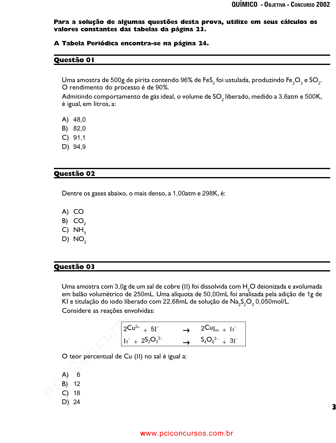 pcimarkpci MDAwMDowMDAwOjAwMDA6MDAwMDowMDAwOmZmZmY6MzZlOTpjMjU5:TW9uLCAxMyBTZXAgMjAyMSAxNjowODowOSAtMDMwMA== 3 QUÍMICO - OBJETIVA - CONCURSO 2002 Para a solução de algumas questões desta prova, utilize em seus cálculos os valores constantes das tabelas da página 23. A Tabela Periódica encontra-se na página 24. Questão 01 Uma amostra de 500g de pirita contendo 96% de FeS 2 foi ustulada, produzindo Fe 2 O 3 e SO 2 . O rendimento do processo é de 90%. Admitindo comportamento de gás ideal, o volume de SO 2 liberado, medido a 3,6atm e 500K, é igual, em litros, a: A) 48,0 B) 82,0 C) 91,1 D) 94,9 Questão 02 Dentre os gases abaixo, o mais denso, a 1,00atm e 298K, é: A) CO B) CO 2 C) NH 3 D) NO 2 Questão 03 Uma amostra com 3,0g de um sal de cobre (II) foi dissolvida com H 2 O deionizada e avolumada em balão volumétrico de 250mL. Uma alíquota de 50,00mL foi analisada pela adição de 1g de KI e titulação do iodo liberado com 22,68mL de solução de Na 2 S 2 O 3 0,050mol/L. Considere as reações envolvidas: O teor percentual de Cu (II) no sal é igual a: A) 6 B) 12 C) 18 D) 24 2Cu2+ + 5I− →→ 2CuI(s) + I3− I3− + 2S2O3 2− →→ S4O62− + 3I− www.pciconcursos.com.br www.pciconcursos.com.br www.pciconcursos.com.br www.pciconcursos.com.br www.pciconcursos.com.br pcimarkpci MDAwMDowMDAwOjAwMDA6MDAwMDowMDAwOmZmZmY6MzZlOTpjMjU5:TW9uLCAxMyBTZXAgMjAyMSAxNjowODowOSAtMDMwMA== 4 QUÍMICO - OBJETIVA - CONCURSO 2002 Questão 04 Hidrotalcitas são argilas aniônicas formadas por uma dupla camada de hidróxidos que, em sua forma natural, hidroxicarbonato de magnésio e alumínio, apresentam a seguinte fórmula geral: (Mg 1−x Al x (OH) 2 )x+ (C 23 − O ) x/2 . nH 2 O No difratograma de raios X destes materiais, obtidos empregando-se radiação CuKα (λ = 1,5418 Å), um pico intenso correspondente ao plano (003) é observado a 2θ = 11o. Sabendo que sen 5,5º = 0,0958, a distância interplanar associada ao plano (003) é, em angstrons, aproximadamente igual a: A) 3,0 B) 4,6 C) 8,0 D) 9,8 Questão 05 Considere o diagrama de fases abaixo e a pressão externa de 760mmHg: Uma diminuição da pressão externa provoca, respectivamente, as seguintes alterações nos pontos de fusão e ebulição da substância pura: A) elevação e elevação B) elevação e abaixamento C) abaixamento e elevação D) abaixamento e abaixamento Pressão Temperatura (ºC) 760 (mmHg) www.pciconcursos.com.br www.pciconcursos.com.br www.pciconcursos.com.br www.pciconcursos.com.br www.pciconcursos.com.br pcimarkpci MDAwMDowMDAwOjAwMDA6MDAwMDowMDAwOmZmZmY6MzZlOTpjMjU5:TW9uLCAxMyBTZXAgMjAyMSAxNjowODowOSAtMDMwMA== 5 QUÍMICO - OBJETIVA - CONCURSO 2002 Questão 06 Uma solução de amônia em água é chamada de hidróxido de amônio, em função do equilíbrio: A massa específica de uma solução de hidróxido de amônio, que contém 28% em massa de NH 3 , é igual a 0,9g/mL. Utilize massa molar do NH3 igual a 17,0g. O volume desta solução que deverá ser diluído para preparar 500mL de uma solução 0,250mol/L é, em mL, igual a: A) 04,2 B) 05,0 C) 08,4 D) 10,5 Questão 07 O químico de um laboratório de análises necessita preparar uma solução padrão de HCl para ser utilizada na determinação de proteínas pelo método de Kjeldahl. Sabendo que a neutralização completa de 0,762g de KHC 8 H 4 O 4 consumiu 25,00mL da solução de HCl, a concentração, em mol por litro, da solução padrão ácida corresponde a: Dado: massa molar do KHC 8 H 4 O 4 = 204,22g A) 0,08 B) 0,15 C) 0,21 D) 0,26 Questão 08 Considere as quantidades de matéria de solutos abaixo e que todas as substâncias iônicas estão completamente dissociadas. A quantidade de matéria que provocará a maior elevação ebulioscópica ao se dissolver em 1kg de água é: A) 3 mols de etileno glicol B) 1 mol de sulfato de sódio C) 1 mol de sulfato de alumínio D) 2 mols de cloreto de potássio NH3 + H2O + 4NH + OH − www.pciconcursos.com.br www.pciconcursos.com.br www.pciconcursos.com.br www.pciconcursos.com.br www.pciconcursos.com.br pcimarkpci MDAwMDowMDAwOjAwMDA6MDAwMDowMDAwOmZmZmY6MzZlOTpjMjU5:TW9uLCAxMyBTZXAgMjAyMSAxNjowODowOSAtMDMwMA== 6 QUÍMICO - OBJETIVA - CONCURSO 2002 Questão 09 Em relação ao mercúrio, a entalpia padrão de vaporização é 59,3 kJ.mol−1 e a de fusão é 2,29 kJ.mol−1. A entalpia padrão de sublimação do mercúrio, em kJ.mol−1, é: A) + 57,0 B) − 57,0 C) + 61,6 D) − 61,6 Questão 10 Considere os dados termodinâmicos abaixo: Nas condições padrão, a conversão da substância I em II ocorre com as seguintes variações de entalpia e entropia, respectivamente: A) positiva e positiva B) positiva e negativa C) negativa e positiva D) negativa e negativa Questão 11 Considere as soluções salinas de I a IV, todas a 25oC. I: NaCl 0,01mol/L II: NaCl 0,1mol/L III: CaCl 2 0,01mol/L IV: AgNO 3 0,01mol/L A solubilidade do cloreto de prata, a 25oC, é menor na solução de número: A) I B) II C) III D) IV Substância ∆∆H o formação (kJ/mol) So (J/K.mol) II. Octano (g) − 208,2 + 467,2 II. Isooctano (g) − 225,0 + 423,0 www.pciconcursos.com.br www.pciconcursos.com.br www.pciconcursos.com.br www.pciconcursos.com.br www.pciconcursos.com.br pcimarkpci MDAwMDowMDAwOjAwMDA6MDAwMDowMDAwOmZmZmY6MzZlOTpjMjU5:TW9uLCAxMyBTZXAgMjAyMSAxNjowODowOSAtMDMwMA== 7 QUÍMICO - OBJETIVA - CONCURSO 2002 Questão 12 Considere o cromatograma abaixo, obtido por cromatografia gasosa de alta resolução com a coluna em condição isotérmica. Ao analisá-lo, podemos afirmar que uma melhor separação entre os picos 3 e 4 pode ser conseguida com: A) diminuição na corrente do detector B) aumento da vazão de gás de arraste C) diminuição da temperatura da coluna D) aumento da quantidade de amostra injetada Questão 13 A figura abaixo descreve a variação da concentração de um reagente durante uma reação química conduzida a duas temperaturas T distintas, sendo T2 > T1. A análise da figura indica que, com relação à re