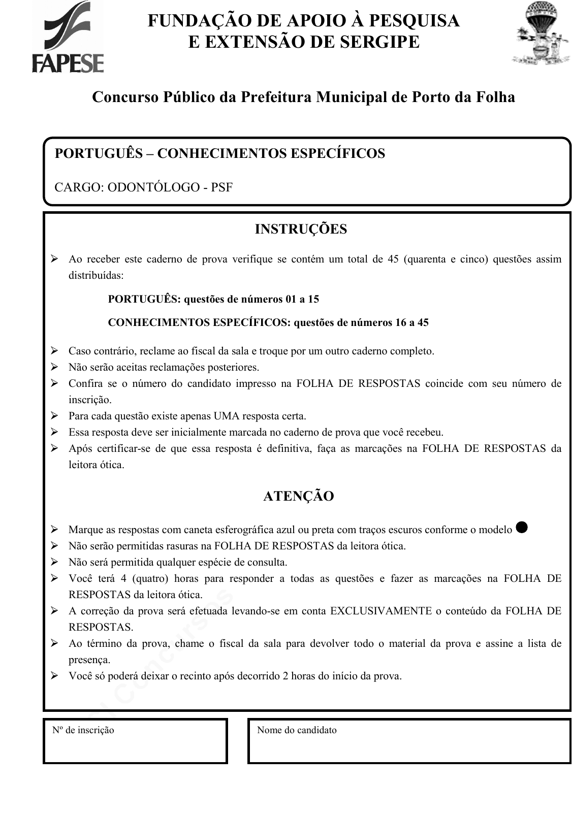 pcimarkpci MDAwMDowMDAwOjAwMDA6MDAwMDowMDAwOmZmZmY6MzZlOTpjMjU5:TW9uLCAxMyBTZXAgMjAyMSAxOTo0NjowMSAtMDMwMA== INSTRUÇÕES � Ao receber este caderno de prova verifique se contém um total de 45 (quarenta e cinco) questões assim distribuídas: PORTUGUÊS: questões de números 01 a 15 CONHECIMENTOS ESPECÍFICOS: questões de números 16 a 45 � Caso contrário, reclame ao fiscal da sala e troque por um outro caderno completo. � Não serão aceitas reclamações posteriores. � Confira se o número do candidato impresso na FOLHA DE RESPOSTAS coincide com seu número de inscrição. � Para cada questão existe apenas UMA resposta certa. � Essa resposta deve ser inicialmente marcada no caderno de prova que você recebeu. � Após certificar-se de que essa resposta é definitiva, faça as marcações na FOLHA DE RESPOSTAS da leitora ótica. ATENÇÃO � Marque as respostas com caneta esferográfica azul ou preta com traços escuros conforme o modelo � Não serão permitidas rasuras na FOLHA DE RESPOSTAS da leitora ótica. � Não será permitida qualquer espécie de consulta. � Você terá 4 (quatro) horas para responder a todas as questões e fazer as marcações na FOLHA DE RESPOSTAS da leitora ótica. � A correção da prova será efetuada levando-se em conta EXCLUSIVAMENTE o conteúdo da FOLHA DE RESPOSTAS. � Ao término da prova, chame o fiscal da sala para devolver todo o material da prova e assine a lista de presença. � Você só poderá deixar o recinto após decorrido 2 horas do início da prova. Nº de inscrição Nome do candidato Concurso Público da Prefeitura Municipal de Por to da Folha PORTUGUÊS – CONHECIMENTOS ESPECÍFICOS CARGO: ODONTÓLOGO - PSF Nº de inscrição Nome do candidato FUNDAÇÃO DE APOIO À PESQUISA E EXTENSÃO DE SERGIPE pcimarkpci MDAwMDowMDAwOjAwMDA6MDAwMDowMDAwOmZmZmY6MzZlOTpjMjU5:TW9uLCAxMyBTZXAgMjAyMSAxOTo0NjowMSAtMDMwMA== 2 PM de Porto da Folha – Odontólogo - PSF PORTUGUÊS Texto para as questões 1, 2, 3 e 4. Os desastres de Sofia Qualquer que tivesse sido seu trabalho anterior, ele o abandonara,mudara de profissão e passara pesadamente a ensinar no curso primário: Era tudo o que sabíamos dele. O professor era gordo, grande e silencioso, de ombros contraídos. Em vez de nó na garganta, ele tinha ombros contraídos. Usava paletó curto demais, óculos sem aro, com um fio de ouro encimando o nariz grosso e romano. E eu era atraída por ele. Não amor, mas atraída pelo seu silêncio e pela controlada impaciência que ele tinha em nos ensinar e que, ofendida, eu adivinhara. Passei a me comportar mal na sala. Falava muito alto, mexia com os colegas, interrompia a lição com piadinhas, até que ele dizia, vermelho: - Cale-se ou expulso a senhora da sala. Ferida, triunfante, eu respondia em desafio: pode me mandar! Ele não mandava, senão estaria me obedecendo. Mas eu o exasperava tanto que se tornara doloroso para mim ser o objeto de ódio daquele homem que de certo modo eu amava. Não o amava como a mulher que eu seria um dia, amava-o como uma criança que tenta desastradamente proteger um adulto, com a cólera de quem ainda não foi covarde e vê um homem forte de ombros tão curvos. (...) LISPECTOR, Clarice. A legião estrangeira. 1. Nas linhas 3 e 4, o narrador afirma que o professor tinha “ ombros contraídos “. Fora do contexto em que está inserida, essa característica pode sugerir múltiplas interpretações, mas, de acordo com o contexto apenas uma possibilidade contém uma interpretação adequada: (A) Que o professor era velhinho (B) Que era frágil fisicamente (C) Que era acovardado e submisso às pressões sociais (D) Que era corcunda (E) Indica apenas uma qualidade física. 2. Segundo o texto, os sentimentos da aluna pelo professor eram ambíguos. Analise os itens abaixo e marque a alternativa que confirma essas contradições. I - “ Eu era atraída por ele(...) Ofendida, eu adivinhara “. II - “O professor era gordo, grande e silencioso, de ombros contraídos”. III - “Ferida, triunfante...” (A) Apenas o item I confirma as contradições. (B) Apenas os itens I e II confirmam as contradições. (C) Apenas os itens I e III confirmam as contradições. (D) Apenas o item II confirma as contradições. (E) Nenhum item confirma as contradições. 3. Nas linhas 12, 13 e 14, a menina diz que amava o professor “com a cólera de quem ainda não foi covarde “. O significado de “ainda“ nesse contexto significa: (A) Que é improvável a idéia de que um dia fará coisas contrárias ao seu caráter. (B) Que ela própria admite a possibilidade de um dia vir a ser covarde, como o professor. (C) Que ela própria inviabiliza a possibilidade de no futuro fazer coisas contrárias ao seu caráter. (D) Ela admite a impossibilidade de ainda um dia vir a ser covarde como o professor. (E) Ao incluir o advérbio “ainda“ o narrador leva a pressupor que ele só não é covarde porque “ainda” não teve de submeter-se às regras sociais. 4. Todo texto deve revelar a visão de mundo de quem o produziu. No caso desse, pode-se dizer que ele foi produzido para mostrar que: (A) Todo educando nutre pelo educador um grande sentimento e pode se irritar quando não é correspondido; (B) Todo professor se dedica à tarefa de ensinar; (C) As condições da vida prática e a necessidade de seguir regras e normas podem levar o homem a reprimir suas emoções; (D) Todo covarde se submete às regras sociais, o que o leva a fazer coisas próprias do seu caráter e índole; (E) Todo professor deve priorizar as necessidades práticas e seguir as regras e normas impostas, mas, não deve reprimir suas emoções. 5. Palavras ditas a um jogador da seleção brasileira: “AINDA QUE FOSSE BOM JOGADOR, não ganharia a partida.” A oração destacada encerra a idéia de: (A) Causa (B) Concessão (C) Fim (D) Condição (E) Proporção 6. Rui Guerra e Chico Buarque escreveram uma peça para o teatro chamada CALABAR, pondo em dúvid