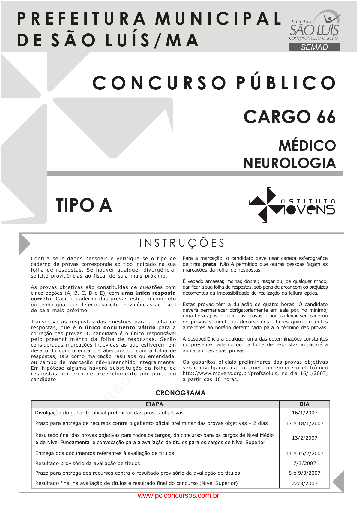 pcimarkpci MDAwMDowMDAwOjAwMDA6MDAwMDowMDAwOmZmZmY6MzZlOTpjMjU5:VHVlLCAxNCBTZXAgMjAyMSAwMzo0ODoxMiAtMDMwMA== CONC U R S O P Ú B L I C O I N S T R U Ç Õ E S CRONOGRAMA ETAPA DIA Divulgação do gabarito oficial preliminar das provas objetivas 16/1/2007 Prazo para entrega de recursos contra o gabarito oficial preliminar das provas objetivas – 2 dias 17 e 18/1/2007 P R E F E I T U R A M U N I C I P A L D E S Ã O L U Í S / M A 13/2/2007 Entrega dos documentos referentes à avaliação de títulos 14 e 15/2/2007 Resultado provisório da avaliação de títulos 7/3/2007 Prazo para entrega dos recursos contra o resultado provisório da avaliação de títulos 8 e 9/3/2007 Resultado final na avaliação de títulos e resultado final do concurso (Nível Superior) 22/3/2007 CARGO 66 MÉDICO NEUROLOGIA TIPO A Confira seus dados pessoais e verifique se o tipo de caderno de provas corresponde ao tipo indicado na sua folha de respostas. Se houver qualquer divergência, solicite providências ao fiscal de sala mais próximo. As provas objetivas são constituídas de questões com cinco opções (A, B, C, D e E), com uma única resposta correta. Caso o caderno das provas esteja incompleto ou tenha qualquer defeito, solicite providências ao fiscal de sala mais próximo. Transcreva as respostas das questões para a folha de respostas, que é o único documento válido para a correção das provas. O candidato é o único responsável pelo preenchimento da folha de respostas. Serão consideradas marcações indevidas as que estiverem em desacordo com o edital de abertura ou com a folha de respostas, tais como marcação rasurada ou emendada, ou campo de marcação não-preenchido integralmente. Em hipótese alguma haverá substituição da folha de respostas por erro de preenchimento por parte do candidato. Para a marcação, o candidato deve usar caneta esferográfica de tinta preta. Não é permitido que outras pessoas façam as marcações da folha de respostas. É vedado amassar, molhar, dobrar, rasgar ou, de qualquer modo, danificar a sua folha de respostas, sob pena de arcar com os prejuízos decorrentes da impossibilidade de realização da leitura óptica. Estas provas têm a duração de quatro horas. O candidato deverá permanecer obrigatoriamente em sala por, no mínimo, uma hora após o início das provas e poderá levar seu caderno de provas somente no decurso dos últimos quinze minutos anteriores ao horário determinado para o término das provas. A desobediência a qualquer uma das determinações constantes no presente caderno ou na folha de respostas implicará a anulação das suas provas. Os gabaritos oficiais preliminares das provas objetivas serão divulgados na Internet, no endereço eletrônico http://www.movens.org.br/prefsaoluis, no dia 16/1/2007, a partir das 16 horas. www.pciconcursos.com.br pcimarkpci MDAwMDowMDAwOjAwMDA6MDAwMDowMDAwOmZmZmY6MzZlOTpjMjU5:VHVlLCAxNCBTZXAgMjAyMSAwMzo0ODoxMiAtMDMwMA== www.pciconcursos.com.br pcimarkpci MDAwMDowMDAwOjAwMDA6MDAwMDowMDAwOmZmZmY6MzZlOTpjMjU5:VHVlLCAxNCBTZXAgMjAyMSAwMzo0ODoxMiAtMDMwMA== Concurso Público para a Prefeitura de São Luís/MA3 Médico – Neurologia CONHECIMENTOS ESPECÍFICOS QUESTÃO 01 Assinale a opção que apresenta o diagnóstico mais provável para o caso de uma atleta de escola secundária (ginasta) que, após uma atividade física, desenvolveu cefaléia súbita, vertigem, movimentos desajeitados de braço e perna esquerdos, dormência facial esquerda e corporal direita. (A) Vertigem posicional paroxística benigna (B) Dissecção da artéria vertebral (C) Cefaléia tensional (D) Esclerose múltipla (E) Labirintite QUESTÃO 02 Assinale a opção que apresenta a anomalia que é muito compatível com quadro de paralisia da mirada superior, resposta pupilar de dissociação, luz-perto, nistagmo de retração de convergência e retração patológica palpebral. (A) Malformação arteriovenosa do lobo occipital (B) AVC lacunar (C) Cisto poroencefálico do lobo temporal (D) Hidrocefalia (E) Meningioma de 3 cm na foice QUESTÃO 03 Paciente, de 42 anos de idade, reclama da dificuldade para segurar a sua caneta. Ele observou o desenvolvimento de espasmos no braço e na mão direita ao longo dos últimos 3 meses, apenas quando escrevia. O exame físico é normal. Assinale a opção que apresenta a etiologia mais provável para os sinais e sintomas desse quadro clínico. (A) Distonia (B) Atetose (C) Síndrome do túnel do carpo (D) Radiculopatia C3 (E) Fase inicial da doença de Parkinson QUESTÃO 04 Marque a opção que apresenta a localização mais freqüente da lesão que pode causar fraqueza de membro superior ipsilateral e fraqueza da perna contralateral (paralisia cruzada). (A) Cápsula interna posterior (B) Ponte ventrolateral (C) Base pontina (D) Ponte lateral ventral (E) Junção cervicomedular QUESTÃO 05 Uma mulher de 57 anos de idade apresenta ptose, miose e hemianidropsia do lado esquerdo, perda de sensação de vibração na perna direita, perda da sensibilidade à dor e à temperatura na face, no tronco e nas extremidades diretas, assim como ataxia grave e tremor intencional no lado esquerdo. A lesão responsável por esta constelação de problemas está localizada no(a): (A) limbo posterior da cápsula interna. (B) medula rostral, zona medial, lado direito. (C) istmo pontino, região lateral dorsal, lado esquerdo. (D) medula caudal, região lateral dorsal, lado esquerdo. (E) tegmento mesencefálico caudal, lado esquerdo. QUESTÃO 06 Marque a opção que NÃO corresponde a uma característica da ataxia de Friedreich. (A) Alterações isquêmicas corticais cerebelares e cerebrais podem freqüentemente estar associadas a cardiomiopatia concomitante. (B) Com tratamento efetivo, a progressão de doença associada a degeneração neuronal pode ser interrompida em aproximadamente 60% dos casos, embora a insuficiência cardíaca seja tipicamente refratária à terapia. (C) O aparecimento dos sintomas normalmen