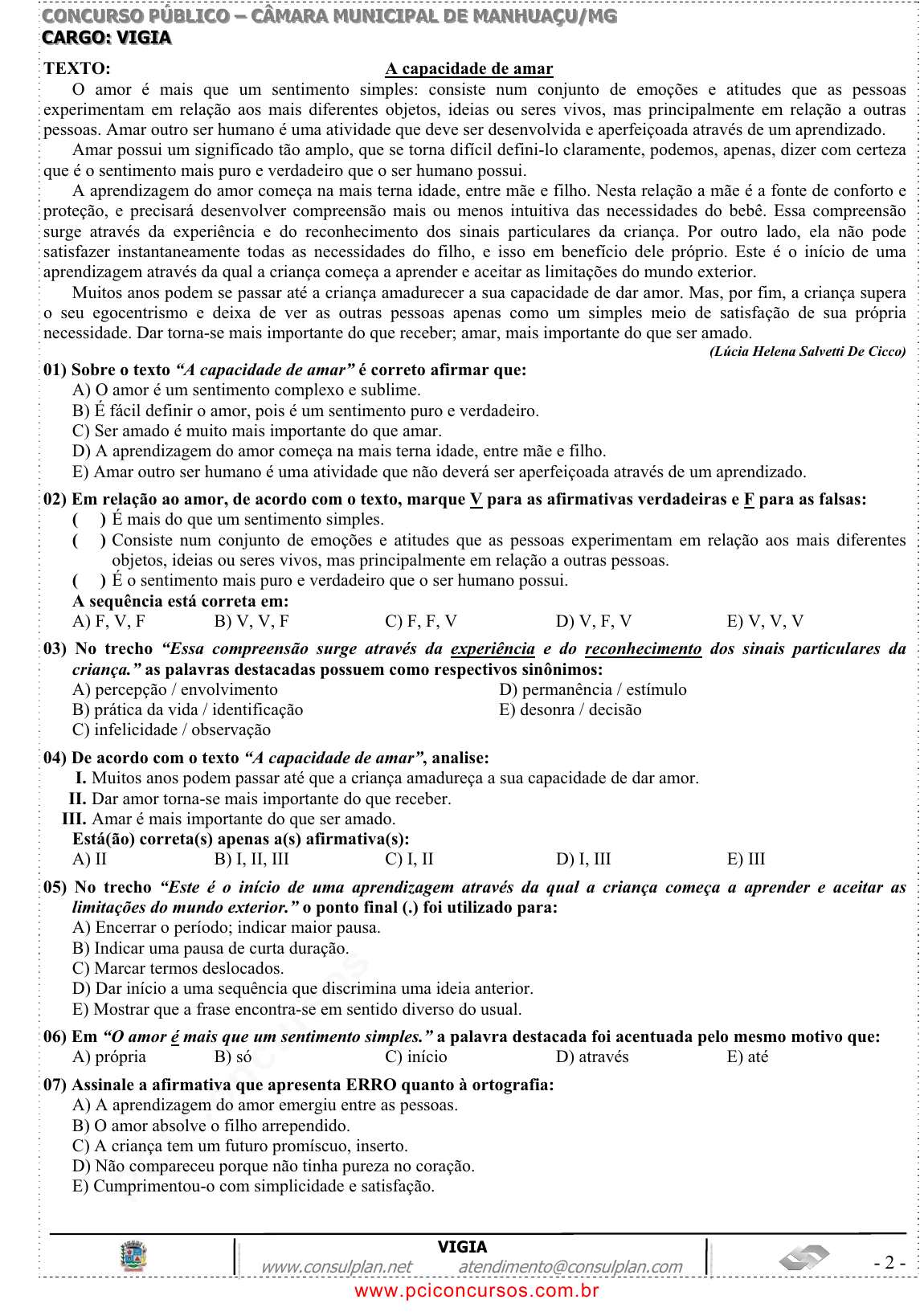 pcimarkpci MDAwMDowMDAwOjAwMDA6MDAwMDowMDAwOmZmZmY6MzZlOTpjMjU5:RnJpLCAxMCBTZXAgMjAyMSAxOTowMDozMSAtMDMwMA== CCCOOONNNCCCUUURRRSSSOOO PPPÚÚÚBBBLLLIIICCCOOO ––– CCCÂÂÂMMMAAARRRAAA MMMUUUNNNIIICCCIIIPPPAAALLL DDDEEE MMMAAANNNHHHUUUAAAÇÇÇUUU///MMMGGG VIGIA www.consulplan.net atendimento@consulplan.com - 2 - CCCAAARRRGGGOOO::: VVVIIIGGGIIIAAA TEXTO: A capacidade de amar O amor é mais que um sentimento simples: consiste num conjunto de emoções e atitudes que as pessoas experimentam em relação aos mais diferentes objetos, ideias ou seres vivos, mas principalmente em relação a outras pessoas. Amar outro ser humano é uma atividade que deve ser desenvolvida e aperfeiçoada através de um aprendizado. Amar possui um significado tão amplo, que se torna difícil defini-lo claramente, podemos, apenas, dizer com certeza que é o sentimento mais puro e verdadeiro que o ser humano possui. A aprendizagem do amor começa na mais terna idade, entre mãe e filho. Nesta relação a mãe é a fonte de conforto e proteção, e precisará desenvolver compreensão mais ou menos intuitiva das necessidades do bebê. Essa compreensão surge através da experiência e do reconhecimento dos sinais particulares da criança. Por outro lado, ela não pode satisfazer instantaneamente todas as necessidades do filho, e isso em benefício dele próprio. Este é o início de uma aprendizagem através da qual a criança começa a aprender e aceitar as limitações do mundo exterior. Muitos anos podem se passar até a criança amadurecer a sua capacidade de dar amor. Mas, por fim, a criança supera o seu egocentrismo e deixa de ver as outras pessoas apenas como um simples meio de satisfação de sua própria necessidade. Dar torna-se mais importante do que receber; amar, mais importante do que ser amado. (Lúcia Helena Salvetti De Cicco) 01) Sobre o texto “A capacidade de amar” é correto afirmar que: A) O amor é um sentimento complexo e sublime. B) É fácil definir o amor, pois é um sentimento puro e verdadeiro. C) Ser amado é muito mais importante do que amar. D) A aprendizagem do amor começa na mais terna idade, entre mãe e filho. E) Amar outro ser humano é uma atividade que não deverá ser aperfeiçoada através de um aprendizado. 02) Em relação ao amor, de acordo com o texto, marque V para as afirmativas verdadeiras e F para as falsas: ( ) É mais do que um sentimento simples. ( ) Consiste num conjunto de emoções e atitudes que as pessoas experimentam em relação aos mais diferentes objetos, ideias ou seres vivos, mas principalmente em relação a outras pessoas. ( ) É o sentimento mais puro e verdadeiro que o ser humano possui. A sequência está correta em: A) F, V, F B) V, V, F C) F, F, V D) V, F, V E) V, V, V 03) No trecho “Essa compreensão surge através da experiência e do reconhecimento dos sinais particulares da criança.” as palavras destacadas possuem como respectivos sinônimos: A) percepção / envolvimento D) permanência / estímulo B) prática da vida / identificação E) desonra / decisão C) infelicidade / observação 04) De acordo com o texto “A capacidade de amar”, analise: I. Muitos anos podem passar até que a criança amadureça a sua capacidade de dar amor. II. Dar amor torna-se mais importante do que receber. III. Amar é mais importante do que ser amado. Está(ão) correta(s) apenas a(s) afirmativa(s): A) II B) I, II, III C) I, II D) I, III E) III 05) No trecho “Este é o início de uma aprendizagem através da qual a criança começa a aprender e aceitar as limitações do mundo exterior.” o ponto final (.) foi utilizado para: A) Encerrar o período; indicar maior pausa. B) Indicar uma pausa de curta duração. C) Marcar termos deslocados. D) Dar início a uma sequência que discrimina uma ideia anterior. E) Mostrar que a frase encontra-se em sentido diverso do usual. 06) Em “O amor é mais que um sentimento simples.” a palavra destacada foi acentuada pelo mesmo motivo que: A) própria B) só C) início D) através E) até 07) Assinale a afirmativa que apresenta ERRO quanto à ortografia: A) A aprendizagem do amor emergiu entre as pessoas. B) O amor absolve o filho arrependido. C) A criança tem um futuro promíscuo, inserto. D) Não compareceu porque não tinha pureza no coração. E) Cumprimentou-o com simplicidade e satisfação. www.pciconcursos.com.br pcimarkpci MDAwMDowMDAwOjAwMDA6MDAwMDowMDAwOmZmZmY6MzZlOTpjMjU5:RnJpLCAxMCBTZXAgMjAyMSAxOTowMDozMSAtMDMwMA== CCCOOONNNCCCUUURRRSSSOOO PPPÚÚÚBBBLLLIIICCCOOO ––– CCCÂÂÂMMMAAARRRAAA MMMUUUNNNIIICCCIIIPPPAAALLL DDDEEE MMMAAANNNHHHUUUAAAÇÇÇUUU///MMMGGG VIGIA www.consulplan.net atendimento@consulplan.com - 3 - 08) No trecho “Por outro lado, ela não pode satisfazer instantaneamente todas as necessidades do filho, ...” a palavra destacada possui como antônimo correto: A) demoradamente D) claramente B) subtamente E) rapidamente C) momentaneamente 09) Assinale a relação de diminutivos que se encontra INCORRETA: A) criança /criancinha D) bebê / bebezinho B) amor / amorzinho E) mundo / mundoinho C) conjunto / conjuntinho 10) No trecho “A aprendizagem do amor começa na mais terna idade, entre mãe e filho.” a vírgula (,) foi utilizada para: A) Dar início a fala. D) Isolar explicações. B) Isolar gírias. E) Indicar uma pausa de curta duração. C) Marcar mudança de interlocutor. MATEMÁTICAMMAATTEEMMÁÁTTIICCAA 11) As figuras representam uma laranja, um copo e uma caixa de suco utilizadas em um comercial de suco de laranja. Quais sólidos geométricos se relacionam com os itens citados? A) Esfera, cone e cilindro. B) Cubo, cone e cilindro. C) Cone, esfera e prisma. D) Esfera, cilindro e prisma. E) Esfera, cubo e cone. 12) A altura de Márcia foi expressa de 5 maneiras distintas e apenas uma delas está INCORRETA. Assinale-a: A) 1,75m B) 175cm C) 17,5dm D) 17500mm E) 0,175dam 13) Roberto gastou dois quintos da hora no trajeto entre sua casa e o trabalho. Sabe-se q