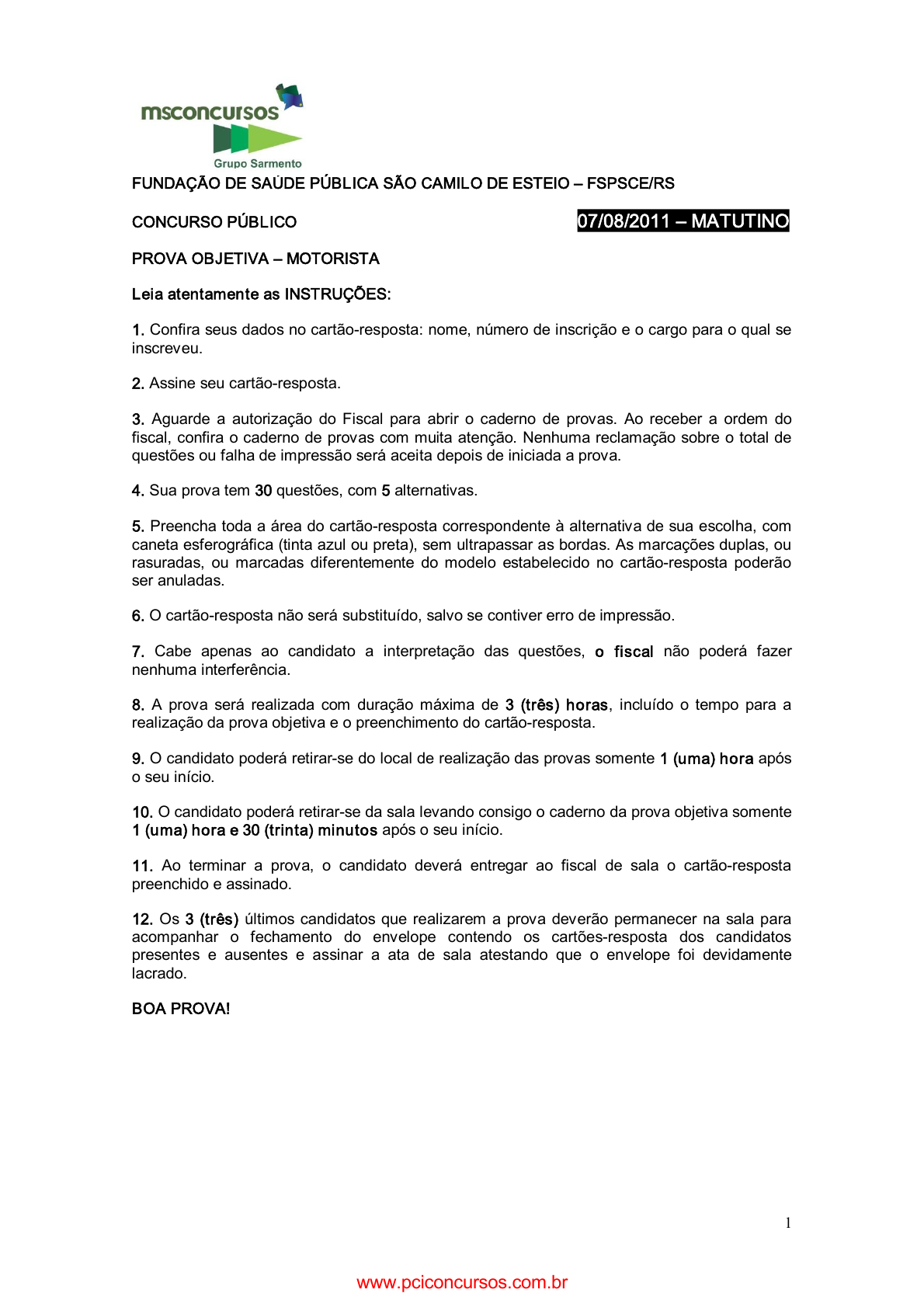 pcimarkpci MDAwMDowMDAwOjAwMDA6MDAwMDowMDAwOmZmZmY6MzZlOTpjMjU5:V2VkLCAxNSBTZXAgMjAyMSAwMDowMToxMiAtMDMwMA== 1 FUNDAÇÃO DE SAÚDE PÚBLICA SÃO CAMILO DE ESTEIO – FSPSCE/RS CONCURSO PÚBLICO 07/08/2011 – MATUTINO PROVA OBJETIVA – MOTORISTA Leia atentamente as INSTRUÇÕES: 1. Confira seus dados no cartãoresposta: nome, número de inscrição e o cargo para o qual se inscreveu. 2. Assine seu cartãoresposta. 3. Aguarde a autorização do Fiscal para abrir o caderno de provas. Ao receber a ordem do fiscal, confira o caderno de provas com muita atenção. Nenhuma reclamação sobre o total de questões ou falha de impressão será aceita depois de iniciada a prova. 4. Sua prova tem 30 questões, com 5 alternativas. 5. Preencha toda a área do cartãoresposta correspondente à alternativa de sua escolha, com caneta esferográfica (tinta azul ou preta), sem ultrapassar as bordas. As marcações duplas, ou rasuradas, ou marcadas diferentemente do modelo estabelecido no cartãoresposta poderão ser anuladas. 6. O cartãoresposta não será substituído, salvo se contiver erro de impressão. 7. Cabe apenas ao candidato a interpretação das questões, o fiscal não poderá fazer nenhuma interferência. 8. A prova será realizada com duração máxima de 3 (três) horas, incluído o tempo para a realização da prova objetiva e o preenchimento do cartãoresposta. 9. O candidato poderá retirarse do local de realização das provas somente 1 (uma) hora após o seu início. 10. O candidato poderá retirarse da sala levando consigo o caderno da prova objetiva somente 1 (uma) hora e 30 (trinta) minutos após o seu início. 11. Ao terminar a prova, o candidato deverá entregar ao fiscal de sala o cartãoresposta preenchido e assinado. 12. Os 3 (três) últimos candidatos que realizarem a prova deverão permanecer na sala para acompanhar o fechamento do envelope contendo os cartõesresposta dos candidatos presentes e ausentes e assinar a ata de sala atestando que o envelope foi devidamente lacrado. BOA PROVA! www.pciconcursos.com.br pcimarkpci MDAwMDowMDAwOjAwMDA6MDAwMDowMDAwOmZmZmY6MzZlOTpjMjU5:V2VkLCAxNSBTZXAgMjAyMSAwMDowMToxMiAtMDMwMA== 2 PROVA OBJETIVA – MOTORISTA LÍNGUA PORTUGUESA 01. “ Naquela escola, ler e aprender é pura diversão.” Acerca do sujeito dessa oração, a afirmativa verdadeira é: a) O sujeito da oração é “Ler e aprender”. b) Essa oração não tem sujeito. c) O sujeito da oração é simples. d) O sujeito da oração está oculto. e) O sujeito da oração é indeterminado. O texto a seguir servirá de base para responde às questões 02 a 05. Logo que pôde andar e falar tornouse um flagelo, quebrava e rasgava tudo que lhe vinha à mão. Tinha uma paixão decidida pelo chapéu armado do Leonardo; se este ____ (1) deixava por esquecimento em algum lugar ao seu alcance, tomava____ (2) imediatamente, espanava com ele todos os móveis, punha____ (3) dentro tudo que encontrava, esfregava____ (4) em uma parede, e acabava por varrer com ele a casa; até que a Maria, exasperada pelo que aquilo lhe havia de custar aos ouvidos, e talvez às costas, arrancava____ (5) das mãos a vítima infeliz. Era, além de traquinas, guloso; quando não traquinava, comia. A Maria não ____ (6) perdoava; trazia____ (7) bem maltratada uma região do corpo; porém ele não se emendava, que era também teimoso, e as travessuras recomeçavam mal acabava a dor das palmadas. (ALMEIDA, M.A.Memórias de um Sargento de Milícias. São Paulo: FTD, 1993.) 02. Foram retirados propositalmente os pronomes do excerto acima. Tendo em mente a regência verbal adequada, assinale a alternativa que completa as lacunas deixadas: a) 1 lhe; 2 lhe; 3 o; 4 lhe; 5 o; 6 lhe; 7 o. b) 1 o; 2 o; 3 o; 4 lhe; 5 o; 6 o; 7 lhe. c) 1 o; 2 o; 3 lhe; 4 o; 5 lhe; 6 lhe; 7 lhe. d) 1 lhe; 2 o; lhe; 4 lhe; 5 lhe; 6 o; 7 o. e) 1 lhe; 2 lhe; 3 lhe; 4 o; 5 o; 6 o; 7 lhe. 03. Podese corretamente deduzir da leitura do texto: a) Embora a criança fosse travessa, destacavase mais pela gulodice. b) Maria iria ter de responder adversamente a alguém pelas traquinagens da criança, se não a contivesse, em relação ao chapéu. c) O chapéu não era um item importante para alguém da família, o que realmente incomodava eram as travessuras da criança. d) Maria tinha um trunfo para lidar com a criança traquinas: uma saúde excelente. e) Além de travessa, a menina era glutona, estava sempre fazendo isto ou aquilo. 04. Uma das funções da maioria dos verbos presentes no texto é mostrar que os acontecimentos relacionados às traquinagens da criança envolvendo o chapéu de Leonardo ocorriam frequentemente. Tais verbos: a) Estão na 3ª pessoa do pretérito maisqueperfeito do Indicativo. b) Estão na 3ª pessoa do pretérito perfeito do Indicativo. c) Estão na 1ª pessoa do pretérito imperfeito do Indicatiivo. d) Estão na 3ª pessoa do pretérito imperfeito do Indicativo. e) Na 3ª pessoa do pretérito imperfeito do Subjuntivo. 05. NÃO pode ser considerado um elemento de coesão do texto a palavra grifada em: a) “Tinha uma paixão decidida pelo chapéu armado do Leonardo”. b) “... espanava com ele todos os móveis”. c) “... exasperada pelo que aquilo lhe havia de custar aos ouvidos”. d) “... porém ele não se emendava”. e) “Era, além de traquinas, guloso; quando não traquinava, comia.” Leia a tirinha abaixo para responder as questões 06 e 07. www.pciconcursos.com.br pcimarkpci MDAwMDowMDAwOjAwMDA6MDAwMDowMDAwOmZmZmY6MzZlOTpjMjU5:V2VkLCAxNSBTZXAgMjAyMSAwMDowMToxMiAtMDMwMA== 3 http://www.monica.com.br/comics/tir inhas/tira192.htm 06. Na tirinha acima, o humor foi construído com base em tipos diferentes de textos, aproveitando características individuais de cada um dos personagens. Sobre a pontuação empregada pelo autor, é CORRETO afirmar: a) Nos três quadrinhos, as reticências servem para indicar uma breve interrupção do pensamento das mães dos personagens. b) No primeiro quadrinho, a vírgula sep