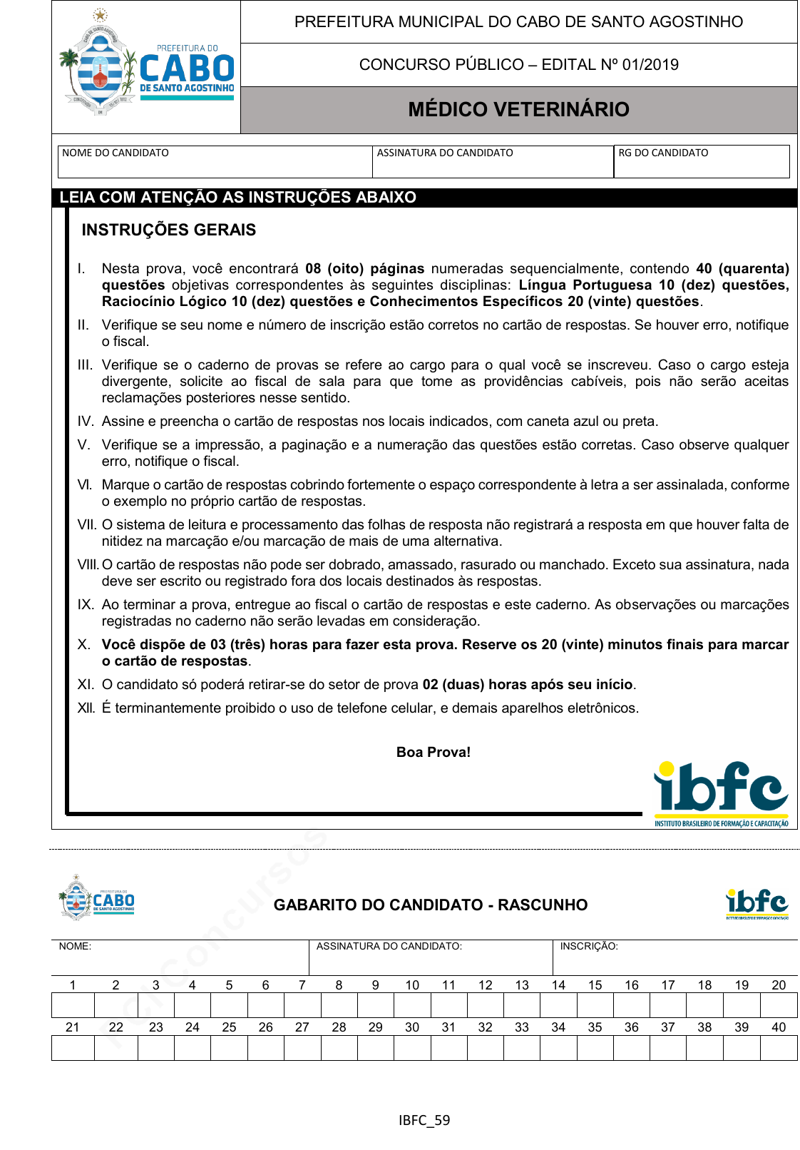 pcimarkpci MDAwMDowMDAwOjAwMDA6MDAwMDowMDAwOmZmZmY6OGE2MTo0MGUy:RnJpLCAxMyBEZWMgMjAxOSAwOTo1NDoyOCAtMDMwMA== IBFC_59 PREFEITURA MUNICIPAL DO CABO DE SANTO AGOSTINHO CONCURSO PÚBLICO – EDITAL Nº 01/2019 MÉDICO VETERINÁRIO LEIA COM ATENÇÃO AS INSTRUÇÕES ABAIXO INSTRUÇÕES GERAIS I. Nesta prova, você encontrará 08 (oito) páginas numeradas sequencialmente, contendo 40 (quarenta) questões objetivas correspondentes às seguintes disciplinas: Língua Portuguesa 10 (dez) questões, Raciocínio Lógico 10 (dez) questões e Conhecimentos Específicos 20 (vinte) questões. II. Verifique se seu nome e número de inscrição estão corretos no cartão de respostas. Se houver erro, notifique o fiscal. III. Verifique se o caderno de provas se refere ao cargo para o qual você se inscreveu. Caso o cargo esteja divergente, solicite ao fiscal de sala para que tome as providências cabíveis, pois não serão aceitas reclamações posteriores nesse sentido. IV. Assine e preencha o cartão de respostas nos locais indicados, com caneta azul ou preta. V. Verifique se a impressão, a paginação e a numeração das questões estão corretas. Caso observe qualquer erro, notifique o fiscal. VI. Marque o cartão de respostas cobrindo fortemente o espaço correspondente à letra a ser assinalada, conforme o exemplo no próprio cartão de respostas. VII. O sistema de leitura e processamento das folhas de resposta não registrará a resposta em que houver falta de nitidez na marcação e/ou marcação de mais de uma alternativa. VIII. O cartão de respostas não pode ser dobrado, amassado, rasurado ou manchado. Exceto sua assinatura, nada deve ser escrito ou registrado fora dos locais destinados às respostas. IX. Ao terminar a prova, entregue ao fiscal o cartão de respostas e este caderno. As observações ou marcações registradas no caderno não serão levadas em consideração. X. Você dispõe de 03 (três) horas para fazer esta prova. Reserve os 20 (vinte) minutos finais para marcar o cartão de respostas. XI. O candidato só poderá retirar-se do setor de prova 02 (duas) horas após seu início. XII. É terminantemente proibido o uso de telefone celular, e demais aparelhos eletrônicos. Boa Prova! GABARITO DO CANDIDATO - RASCUNHO NOME: ASSINATURA DO CANDIDATO: INSCRIÇÃO: 1 2 3 4 5 6 7 8 9 10 11 12 13 14 15 16 17 18 19 20 21 22 23 24 25 26 27 28 29 30 31 32 33 34 35 36 37 38 39 40 NOME DO CANDIDATO ASSINATURA DO CANDIDATO RG DO CANDIDATO pcimarkpci MDAwMDowMDAwOjAwMDA6MDAwMDowMDAwOmZmZmY6OGE2MTo0MGUy:RnJpLCAxMyBEZWMgMjAxOSAwOTo1NDoyOCAtMDMwMA== RASCUNHO pcimarkpci MDAwMDowMDAwOjAwMDA6MDAwMDowMDAwOmZmZmY6OGE2MTo0MGUy:RnJpLCAxMyBEZWMgMjAxOSAwOTo1NDoyOCAtMDMwMA== IBFC_59 1 LÍNGUA PORTUGUESA Leia o texto abaixo para responder às questões de 1 a 8. Tomar decisões nem sempre é algo fácil. Tomar boas decisões, então, pode ser ainda mais difícil. Mas, chegar lá não tem muito segredo: ponderar sobre as diversas possibilidades e ter um senso crítico são caminhos que costumam fazer tudo dar certo. Ainda que isso, vez ou outra, envolva ir de encontro com suas próprias opiniões. Agora, imagine você ter uma autoconfiança muito grande e simplesmente não considerar nada disso? Pois é, cientistas da Universidade de Waterloo, no Canadá, constataram que é exatamente o que acontece com pessoas narcisistas. A origem da palavra “narcisismo” deriva da história de Narciso, o belo jovem da mitologia grega que – spoiler – morre por se apaixonar por sua própria imagem refletida num espelho d’água. Além da crítica óbvia ao culto exagerado à própria imagem, o mito também chama atenção para o individualismo e a autoconfiança. Narcisistas geralmente possuem essas características, o que acaba fazendo com que eles realmente achem que não precisam de nada além de seu próprio ponto de vista para tomar uma decisão acertada. Pessoas narcisistas não costumam fazer isso por mal: elas têm uma convicção clara de que já nasceram pensadores críticos altamente inteligentes – e, por isso, não precisam colocar nada na balança. O problema é que os altos níveis de confiança que eles têm em suas habilidades intelectuais vira e mexe estão equivocados. (Fonte: Superinteressante) 1) De acordo com o sentido do primeiro parágrafo do texto, assinale a alternativa correta. a) Se já é difícil tomar decisões, tomar decisões difíceis nunca é uma tarefa fácil. b) Seguir a intuição, procurando seguir sempre as próprias opiniões, é um caminho seguro para se tomar uma boa decisão. c) Considerar as várias possibilidades com criticidade garante o êxito de um empreendimento. d) Abandonar certas opiniões, quando contrárias à análise crítica, pode resultar em uma boa decisão. 2) A partir da leitura e interpretação do texto, assinale a alternativa correta. a) Por ser um texto jornalístico, cuja função é expositiva, o texto não utiliza sequências explicativas na sua composição. b) Os cientistas da universidade canadense de Waterloo tornaram-se especialistas nas histórias que se relacionam ao mito grego de Narciso. c) A palavra “narcisismo” transformou-se em um conceito utilizado para pensar a sociedade, sendo utilizado em outras áreas do conhecimento, além da mitologia. d) A autoconfiança dos narcisistas oculta um complexo de inferioridade, que eles tentam esconder apresentando-se como pessoas de intelecto acima da média. 3) De acordo com o texto, analise as afirmativas abaixo. I. A palavra “spoiler”, utilizada no terceiro parágrafo, tem função de prevenir o leitor de que o desfecho da narrativa será revelado, no caso, da narrativa mítica. II. Os narcisistas tendem a se achar autossuficientes, devido ao seu individualismo exagerado e à falta de confiança nas pessoas. III. Apesar de serem inteligentes, os narcisistas, tendem a supervalorizar essa qualidade, o que pode, vez ou outra, levá- los ao erro. Assinale a alternativa correta. a) Apenas a a
