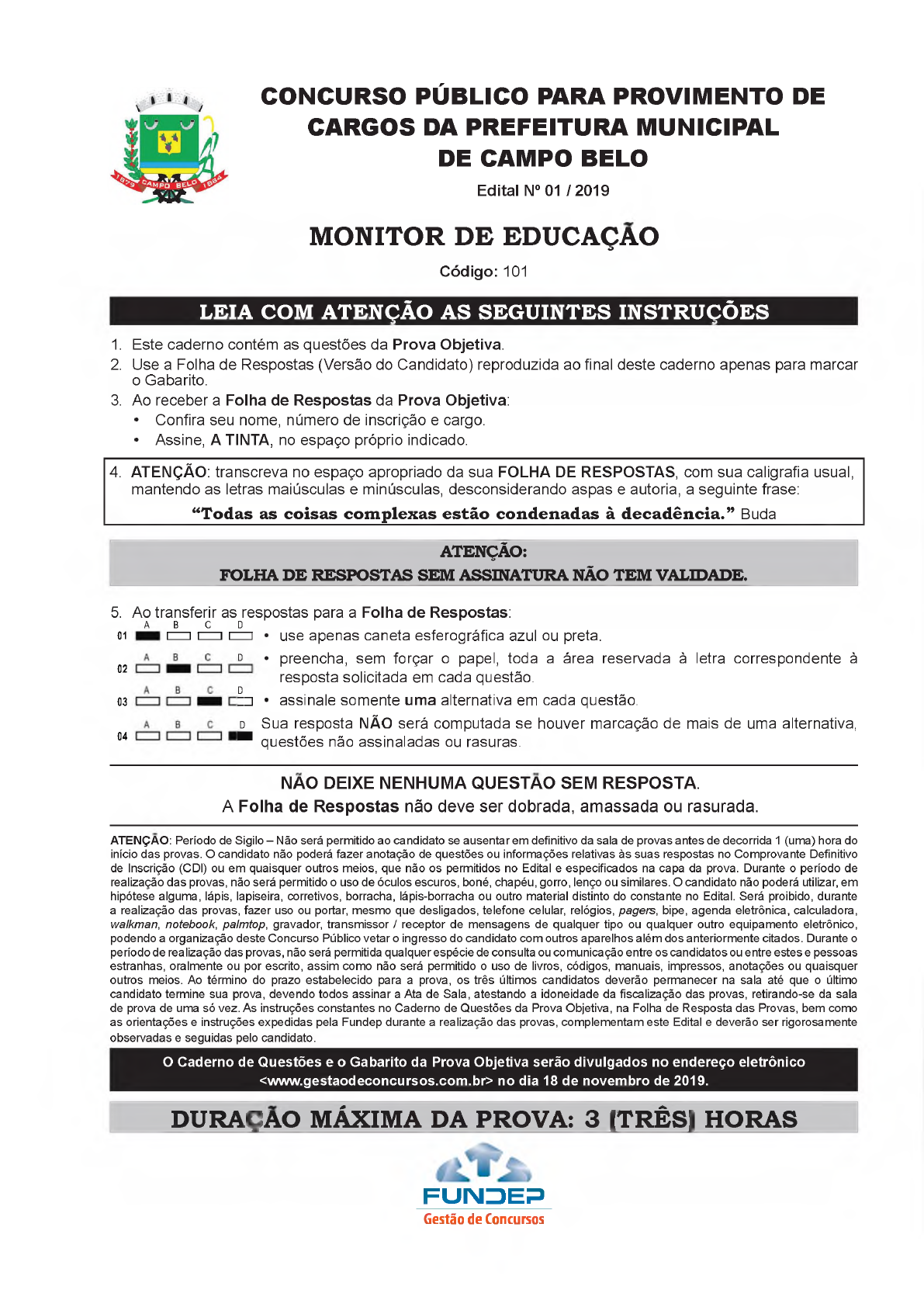 CONCURSO PÚBLICO PARA PROVIMENTO DE CARGOS DA PREFEITURA MUNICIPAL DE CAMPO BELO Edital N° 01 / 2019 M O N IT O R D E E D U C A Ç A O Código: 101 LEIA COM ATENÇAO AS SEGUINTES INSTRUÇÕES 1. Este caderno contém as questões da Prova Objetiva. 2. Use a Folha de Respostas (Versão do Candidato) reproduzida ao final deste caderno apenas para marcar o Gabarito. 3. Ao receber a Folha de Respostas da Prova Objetiva: • Confira seu nome, número de inscrição e cargo. • Assine, A TINTA, no espaço próprio indicado. 4. ATENÇÃO: transcreva no espaço apropriado da sua FOLHA DE RESPOSTAS, com sua caligrafia usual, mantendo as letras maiúsculas e minúsculas, desconsiderando aspas e autoria, a seguinte frase: _______ “Todas as coisas complexas estão condenadas à decadência.” Buda_________ ATENÇAO: fo lh a d e r e s p o s t a s s e m a ssin a tu r a nAo t e m v a lid ad e. 5. Ao transferir as respostas para a Folha de Respostas: A B C____ D_ oi i= i i= i i= i • use apenas caneta esferográfica azul ou preta. 02 03 04 d • preencha, sem forçar o papel, toda a área reservada à letra correspondente à resposta solicitada em cada questão. D =□ • assinale somente uma alternativa em cada questão. d Sua resposta NÃO será computada se houver marcação de mais de uma alternativa, m questões não assinaladas ou rasuras. NAO DEIXE NENHUMA QUESTÃO SEM RESPOSTA. A Folha de Respostas não deve ser dobrada, amassada ou rasurada. ATENÇÃO: Período de Sigilo - Não será permitido ao candidato se ausentar em definitivo da sala de provas antes de decorrida 1 (uma) hora do início das provas. O candidato não poderá fazer anotação de questões ou informações relativas às suas respostas no Comprovante Definitivo de Inscrição (CDI) ou em quaisquer outros meios, que não os permitidos no Edital e especificados na capa da prova. Durante o período de realização das provas, não será permitido o uso de óculos escuros, boné, chapéu, gorro, lenço ou similares. O candidato não poderá utilizar, em hipótese alguma, lápis, lapiseira, corretivos, borracha, lápis-borracha ou outro material distinto do constante no Edital. Será proibido, durante a realização das provas, fazer uso ou portar, mesmo que desligados, telefone celular, relógios, pagers, bipe, agenda eletrônica, calculadora, walkman, notebook, palmtop, gravador, transmissor / receptor de mensagens de qualquer tipo ou qualquer outro equipamento eletrônico, podendo a organização deste Concurso Público vetar o ingresso do candidato com outros aparelhos além dos anteriormente citados. Durante o período de realização das provas, não será permitida qualquer espécie de consulta ou comunicação entre os candidatos ou entre estes e pessoas estranhas, oralmente ou por escrito, assim como não será permitido o uso de livros, códigos, manuais, impressos, anotações ou quaisquer outros meios. Ao término do prazo estabelecido para a prova, os três últimos candidatos deverão permanecer na sala até que o último candidato termine sua prova, devendo todos assinar a Ata de Sala, atestando a idoneidade da fiscalização das provas, retirando-se da sala de prova de uma só vez. As instruções constantes no Caderno de Questões da Prova Objetiva, na Folha de Resposta das Provas, bem como as orientações e instruções expedidas pela Fundep durante a realização das provas, complementam este Edital e deverão ser rigorosamente observadas e seguidas pelo candidato. O Caderno de Questões e o Gabarito da Prova Objetiva serão divulgados no endereço eletrônico <www.gestaodeconcursos.com.br> no dia 18 de novembro de 2019. # A DURA ç AO M Á X IM A DA PROVA: 3 (TRÊS) HO RAS F U N D E P Gestão de Concursos http://www.gestaodeconcursos.com.br ATENÇÃO Sr.(a) Candidato(a), Antes de começar a fazer a prova, confira se este caderno contém, ao todo, 30 (trinta) questões de múltipla escolha, cada uma constituída de 4 (quatro) alternativas de respostas, assim distribuídas: 10 (dez) questões de Língua Portuguesa, 5 (cinco) questões de Atualidades, 5 (cinco) questões de Matemática e 10 (dez) questões de Conhecimentos Específicos, todas perfeitamente legíveis. Havendo algum problema, informe imediatamente ao aplicador de provas para que ele tome as providências necessárias. Caso não observe essa recomendação, não lhe caberá qualquer reclamação ou recursos posteriores. LÍNGUA PORTUGUESA INSTRUÇÃO: Leia o texto a seguir para responder às questões de 1 a 4. Um acento pode mudar todo o sentido da frase? Um acento e tudo muda. A secretária, na secretaria, disse a Antônio, seu chefe, que estava muito gripada. — Não me medico! Vou sim ao médico. E já! - exclamou. Ela, sábia, sabia dos riscos da famosa automedicação. — Meu bebê, por exemplo, seu Antônio, só bebe o que é prescrito! Só come coco do bom; por isso, nunca tem cocô fedido. Rapidamente, Raissa (que odiava ser chamada de Raíssa) ganhou a liberação para ir ao médico. Antes da saída, proclamou o chefe: — Não se acostume! Neste mundo é preciso que se rale para sair da ralé, menina! — Ah! Vou avisar também seus pais! Sabe como anda a violência neste país, né? Ao chegar ao consultório, olhou para o forro do estabelecimento e lembrou a origem dos chatos espirros: o forró agarradinho à pele com o Édson (apelidado de Pelé). — Seu nome? - perguntou o médico. — Raissa! — Raíssa, ... — Ops! É Raissa! Meu nome não tem acento, tem que pronunciar o ditongo ai. É “AI”: Raissa! — Perdão, dona Raissa! Que houve? — Ah! Aqui na Bahia (o senhor sabe, né?), em qualquer baia, a gente dança forró, pele com a pele. Pelé me convidou, trocamos umas palavrazinhas. De repente, eu disse que era secretária. Ele disse que eu era mesmo uma babá muito bonita. Troquei baba com ele, por longos minutos. Para homenagear o momento, pedi à banda um fá maior e ele ficou fã. A única coisa triste, doutor, é