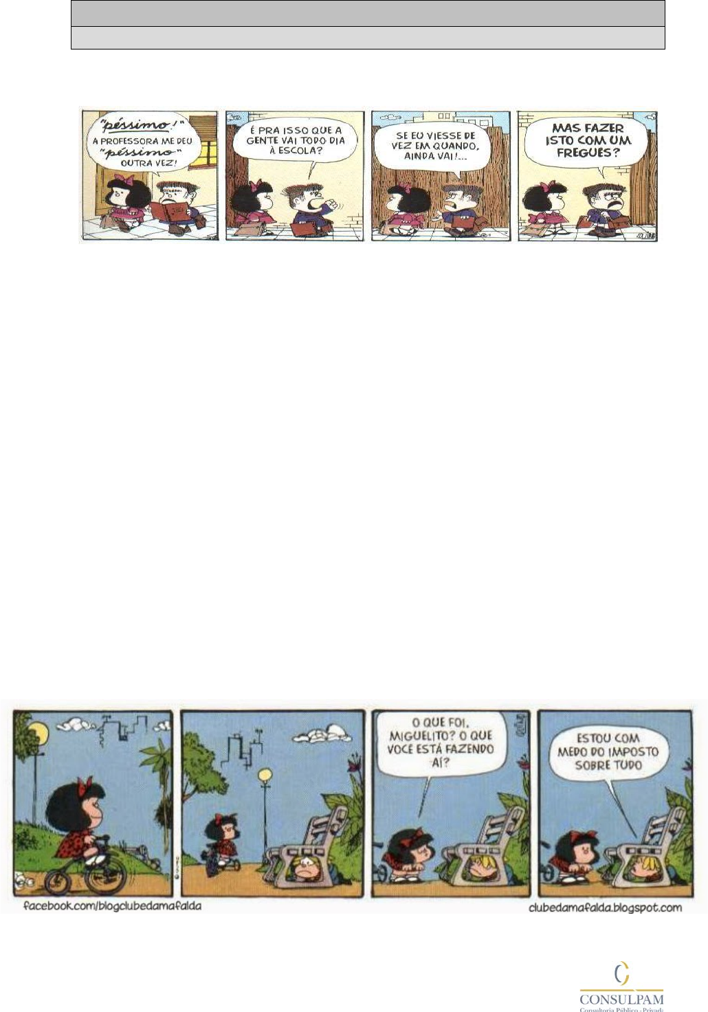 CONCURSO PÚBLICO SURG– 14/09/2014 1 SOLDADOR EM GERAL PROVA DE CONHECIMENTOS GERAIS Leia a tirinha e responda: 1. No primeiro quadrinho,qual o sentimento da expressão “Péssimo!”? a)Espanto b) Indignação c) Surpresa d)Tristeza 2. O que o personagem quis dizer com: “Mas fazer isto com um freguês?” a) O personagem era cliente da professora. b) A professora era vendedora. c) Na escola acontece a mesma relação que vendedor X freguês. d) O personagem nunca falta à aula. 3. A separação silábica das palavras está CORRETO em: a) Pés.si.mo, pro.fes.so.ra, vi.es.se b) Vies.se, ain.da, fre.guês c)Fre.gu.ês. a.in.da. pe.ssi.mo d) Qu.an.do. fre.gu.ês. vi.es.se 4. Passando a expressão “ Se eu viesse” para o plural, temos: a) Se eu viesses. b) Se tu viesseis.c) Se nós viéssemos. d) Se eles viéssem. 5. A palavra FREGUÊS é classificada como: a) Adjetivo b) Substantivo c) Pronome d)Interjeição http://links.lomadee.com/ls/cUxVODtmQWloU1RaWjsyODQyNDU4MjswOzEzNTszMzU5ODIyMjs7QlI7MTs7MA--.html?kw=Mafalda+Quino CONCURSO PÚBLICO SURG– 14/09/2014 2 6. A palavra SOBRE significa: a) Em baixo de alguma coisa b) Em cima de alguma coisa c) Em algumas situações, pode significar EM CIMA e em outras situações pode significar EM BAIXO. d) Todas as alternativas estão corretas. DECLARAÇÃO UNIVERSAL DOS DIREITOS HUMANOS Um dia, uma porção de pessoas se reuniu. Elas vinham de lugares diferentes e eram, elas mesmas, diferentes entre si. Havia homens e mulheres; suas peles, seus cabelos e seus olhos tinham cores diferentes, assim como diferentes eram o formato de seus corpos e de seus rostos. Vinham de países ricos e pobres, de lugares quentes ou frios. Vinham de reinados e de repúblicas. Falavam muitas línguas. Alguns dos países que elas representavam tinham acabado de sair de uma guerra terrível, que tinha deixado muitas cidades destruídas, um número enorme de mortos, muita gente sem lar e sem família. Muitas pessoas tinham sido maltratadas e mortas por causa de sua religião, de sua raça e de suas opiniões políticas. O que reunia aquelas pessoas era o desejo de que nunca mais houvesse uma guerra, de que nunca mais ninguém fosse maltratado e que não se perseguissem mais pessoas que não tinham feito mal a ninguém. Então elas escreveram um papel. Neste documento, elas fizeram um resumo dos direitos que todos os seres humanos têm e que devem ser respeitados por todos os povos. Este documento é chamado Declaração Universal dos Direitos Humanos. (ROCHA, Ruth & ROTH, Otávio. Declaração Universal dos Direitos Humanos. São Paulo: Quinteto, 1986, p. 7-15.). 7. Sobre o texto, marque a alternativa CORRETA: a) Pessoas diferentes se reuniram com interesses diferentes. b) Vinham de países quentes e pobres e países frios e ricos. c) Pessoas diferentes, de países diferentes se juntaram para escrever a Declaração Universal dos Direitos Humanos. d)A Declaração Universal dos Direitos Humanos não teve nenhuma importância pois muitas injustiças continuam acontecendo todos os dias. 8. Assinale a alternativa que contém palavras acentuadas pela mesma razão do acento da palavra NÚMERO. a) países, destruídas, ninguém. b) fúnebre, âncora, límpido. c) ônibus, sótão, anzóis. d) fúnebre, Luís, ninguém. 9. Enumere as frases de acordo com a ordem em que os fatos aconteceram. ( ) Havia homens e mulheres; suas peles, seus cabelos e seus olhos tinham cores diferentes, assim como diferentes eram o formato de seus corpos e de seus rostos. ( ) Então elas escreveram um papel. Neste documento, elas fizeram um resumo dos direitos que todos os seres humanos têm e que devem ser respeitados por todos os povos. CONCURSO PÚBLICO SURG– 14/09/2014 3 ( ) O que reunia aquelas pessoas era o desejo de que nunca mais houvesse uma guerra, de que nunca mais ninguém fosse maltratado e que não se perseguissem mais pessoas que não tinham feito mal a ninguém. ( ) Alguns dos países que elas representavam tinham acabado de sair de uma guerra terrível, que tinha deixado muitas cidades destruídas, um número enorme de mortos, muita gente sem lar e sem família. a) 1, 4, 3, 2 b) 3, 2, 1, 4 c) 2, 4, 1, 3 d) 4, 3, 2, 1 10. Marque a alternativa em que o termo destacado NÃO é um substantivo: a) Um dia, uma porção de PESSOAS se reuniu. b) Seus OLHOS tinham cores diferentes. c) Alguns dos países que elas representavam tinham acabado de sair de uma GUERRA terrível. d) Vinham de países ricos e POBRES. Leia o texto e responda às questões 11 a 13. Até nas flores se vê O destino e a sorte Umas enfeitam a vida Outras enfeitam a morte 11. O texto acima é: a) uma narraçãob) uma dissertação c) uma notícia d) uma poesia 12. Sobre a linguagem do texto, podemos AFIRMAR: a) A linguagem empregada é culta. b) A linguagem empregada retrata a cultura popular. c) É a linguagem empregada em cursos universitários. d) Não há estudos sobre a linguagem do poema por não se tratar da linguagem camponesa. 13. Marque a opção verdadeira: a) O texto é um poema de quatro versos. b) O texto é uma estrofe onde os quatro versos rimam. c) O texto é um verso onde as quatro estrofes rimam. d) O texto é uma estrofe onde nenhum dos quatro versos rima. 14.Estela foi à feira e gastou R$ 373,00. Para efetuar o pagamento entregou ao caixa 3 notas de 100 reais e duas de 50 reais. O caixa pediu R$ 13,00 para facilitar o troco. Qual o valor que Estela recebeu de troco? a) R$ 37,00 b) R$ 33,00 CONCURSO PÚBLICO SURG– 14/09/2014 4 c) R$ 40,00 d) R$ 47,00 15. Edu é pedreiro e, sozinho, conseguiria construir sua casa em 32 dias. Seu irmão se ofereceu para ajudá-lo em meio período do dia. Se os dois trabalharem igualmente, Edu conseguirá construir sua casa em: a) 16 dias b) 20 dias c) 22 dias d) 24 dias 16. Amanda comprou 5 cadeiras pelo preço de R$ 34,60 cada. Pagou a compra com o valor de R$200,00. Recebeu de troco: a) R$ 27,00 b) R$ 37,00 c)R$25,00 d) R$ 35,00 17. João precisa entregar 50 c