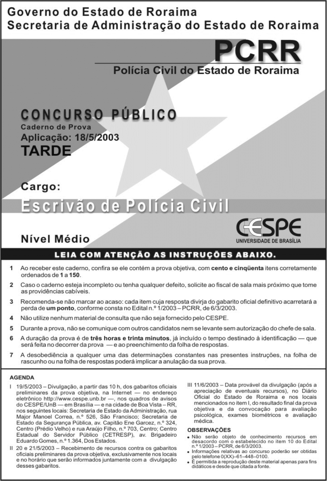 UnB / CESPE – PCRR Concurso Público – Aplicação: 18/5/2003 Nível Médio / Cargo: Escrivão de Polícia Civil – 1 / 7 É permitida a reprodução apenas para fins didáticos e desde que citada a fonte. • De acordo com o comando a que cada um dos itens de 1 a 150 se refira, marque, na folha de respostas, para cada item: o campo designado com o código C, caso julgue o item CERTO; o campo designado com o código E, caso julgue o item ERRADO; ou o campo designado com o código SR, caso desconheça a resposta correta. Marque, obrigatoriamente, para cada item, um, e somente um, dos três campos da folha de respostas, sob pena de arcar com os prejuízos decorrentes de marcações indevidas. A marcação do campo designado com o código SR não implicará apenação. Para as devidas marcações, use a folha de rascunho e, posteriormente, a folha de respostas, que é o único documento válido para a correção da sua prova. • Nos itens que avaliam Conhecimentos de Informática, a menos que seja explicitamente informado o contrário, considere que todos os programas mencionados estão em configuração-padrão, em português, que o mouse está configurado para pessoas destras e que expressões como clicar e clique referem-se a cliques com o botão esquerdo do mouse. Considere também que não há restrições de proteção e de uso em relação aos programas, arquivos, diretórios e equipamentos mencionados. CONHECIMENTOS GERAIS E ESPECÍFICOS A figura acima mostra uma janela do Word 2000, com um texto que está sendo editado por um usuário. Com relação à figura, ao texto nela contido, ao tema por ele abordado e ao Word 2000, julgue os itens de 1 a 9. �� O uso do ponto de vista na primeira pessoa do plural, como em “Todos nós” (R.1) e em “Estamos” (R.2), confere ao texto mais interatividade com o leitor, pois tem como efeito incluí-lo como pessoa que compartilha das mesmas idéias expostas no texto. �� Na linha 6, o pronome “ela” refere-se ao antecedente “estancar”. �� A expressão “das chacinas de crianças e trabalhadores rurais” (R.7-8) é complemento de “em decorrência” (R.7). �� Em algumas partes do país, como, por exemplo, nas regiões metropolitanas do Rio de Janeiro e de São Paulo, a ação de criminosos — organizadamente ou não — caracteriza o quadro que o texto define como de “banalização da morte”. �� Caso o usuário deseje inserir uma linha entre o primeiro e o segundo parágrafos do texto mostrado acima, é suficiente clicar imediatamente à direita do ponto final do primeiro parágrafo e, em seguida, clicar . �� Caso o usuário deseje posicionar o primeiro parágrafo abaixo do segundo parágrafo, é suficiente que ele realize a seguinte seqüência de ações: selecionar o primeiro parágrafo; clicar o menu e, em seguida, na lista de opções que será mostrada, clicar Recortar; pôr o ponto de inserção na linha em branco existente entre o segundo parágrafo e a referência do texto; clicar novamente o menu e, em seguida, clicar Colar. �� Para se centralizar a última linha do texto, mostrado na figura, é suficiente clicar algum ponto dessa linha e, em seguida, pressionar simultaneamente as teclas � e �. � Caso a palavra “chacinas” (R.7) seja selecionada, clicando-se o menu , aparecerá a opção Dicionário de sinônimos, que fornece uma lista de sinônimos para a palavra selecionada. � Para se alterar a fonte utilizada no primeiro parágrafo, é suficiente clicar três vezes sobre esse parágrafo, de modo que todo ele seja selecionado; em seguida, alterar o campo para a fonte desejada. Nos computadores atuais, os dispositivos de armazenamento são de primordial importância e têm evoluído rapidamente, de forma a se tornarem cada vez mais eficientes. Com relação a dispositivos de armazenamento, julgue os itens seguintes. ��� O disco rígido é um dispositivo para armazenamento de dados e programas que realiza a gravação por meio de processos ópticos. ��� O disco flexível de 3½” é um dispositivo de armazenamento de dados que utiliza gravação magnética, capaz de armazenar uma quantidade de bytes superior a 700 mil. UnB / CESPE – PCRR Concurso Público – Aplicação: 18/5/2003 Nível Médio / Cargo: Escrivão de Polícia Civil – 2 / 7 É permitida a reprodução apenas para fins didáticos e desde que citada a fonte. É essencial que as autoridades revejam as providências1 referentes ao tratamento e à custódia de todos os presos, a fim de assegurar que os mesmos sejam tratados com humanidade e em conformidade com a legislação brasileira e o conjunto de4 princípios da Organização das Nações Unidas (ONU) sobre proteção de todo indivíduo sob qualquer forma de detenção ou reclusão, as regras mínimas da ONU sobre o tratamento de7 prisioneiros e o artigo 10 do Acordo Internacional sobre os Direitos Civis e Políticos (ICCPR), que reza que todo indivíduo privado de liberdade deve ser tratado com10 humanidade e respeito pela dignidade inerente à pessoa humana. Anistia Internacional. Tortura e maus-tratos no Brasil, 2001, p. 72 (com adaptações). Tendo o texto acima por referência e considerando o tema por ele tratado, julgue os itens seguintes. ��� Como o texto se refere a várias ações, seria gramaticalmente correto substituir “É essencial” (R.1) por São essenciais. ��� A eliminação do termo referencial “os mesmos” (R.3) prejudicaria a coerência do texto. ��� O verbo rezar tem várias acepções e a forma “reza” (R.9) está sendo utilizada no texto com o sentido de: contém escrito, encerra, prescreve, preceitua, determina. ��� A expressão “dignidade inerente à pessoa humana” (R.11-12) pode ser interpretada como: qualquer pessoa, pelo simples fato de se tratar de um ser humano, possui valor essencial e intrínseco que exige e merece respeito. ��� A lei brasileira, como a de quase todos