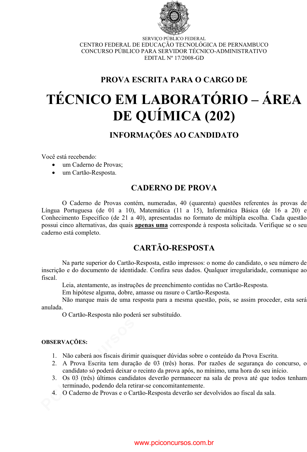 pcimarkpci MDAwMDowMDAwOjAwMDA6MDAwMDowMDAwOmZmZmY6MzZlOTpjMjU5:U2F0LCAxMSBTZXAgMjAyMSAxNjowOTozMSAtMDMwMA== SERVIÇO PÚBLICO FEDERAL CENTRO FEDERAL DE EDUCAÇÃO TECNOLÓGICA DE PERNAMBUCO CONCURSO PÚBLICO PARA SERVIDOR TÉCNICO-ADMINISTRATIVO EDITAL Nº 17/2008-GD PROVA ESCRITA PARA O CARGO DE TÉCNICO EM LABORATÓRIO – ÁREA DE QUÍMICA (202) INFORMAÇÕES AO CANDIDATO Você está recebendo: • um Caderno de Provas; • um Cartão-Resposta. CADERNO DE PROVA O Caderno de Provas contém, numeradas, 40 (quarenta) questões referentes às provas de Língua Portuguesa (de 01 a 10), Matemática (11 a 15), Informática Básica (de 16 a 20) e Conhecimento Específico (de 21 a 40), apresentadas no formato de múltipla escolha. Cada questão possui cinco alternativas, das quais apenas uma corresponde à resposta solicitada. Verifique se o seu caderno está completo. CARTÃO-RESPOSTA Na parte superior do Cartão-Resposta, estão impressos: o nome do candidato, o seu número de inscrição e do documento de identidade. Confira seus dados. Qualquer irregularidade, comunique ao fiscal. Leia, atentamente, as instruções de preenchimento contidas no Cartão-Resposta. Em hipótese alguma, dobre, amasse ou rasure o Cartão-Resposta. Não marque mais de uma resposta para a mesma questão, pois, se assim proceder, esta será anulada. O Cartão-Resposta não poderá ser substituído. OBSERVAÇÕES: 1. Não caberá aos fiscais dirimir quaisquer dúvidas sobre o conteúdo da Prova Escrita. 2. A Prova Escrita tem duração de 03 (três) horas. Por razões de segurança do concurso, o candidato só poderá deixar o recinto da prova após, no mínimo, uma hora do seu início. 3. Os 03 (três) últimos candidatos deverão permanecer na sala de prova até que todos tenham terminado, podendo dela retirar-se concomitantemente. 4. O Caderno de Provas e o Cartão-Resposta deverão ser devolvidos ao fiscal da sala. www.pciconcursos.com.br pcimarkpci MDAwMDowMDAwOjAwMDA6MDAwMDowMDAwOmZmZmY6MzZlOTpjMjU5:U2F0LCAxMSBTZXAgMjAyMSAxNjowOTozMSAtMDMwMA== LÍNGUA PORTUGUESA (201, 202, 203, 204 e 205) Os Textos 1 e 2 servem de base para as questões 1 a 5. TEXTO 1 Meses e meses recolhida e murcha, sai de casa, liberta-se da estufa, A flor guardada (o guarda-chuva). Agora cresce na mão pluvial, cresce. Na rua sustento o caule de uma grande rosa negra Que se abre sobre mim na chuva. (Mauro Mota) TEXTO 2 Na Av. Dantas Barreto, empilham-se camelôs que exibem, aos gritos, seus produtos. Eles vendem de tudo. Nas tardes nubladas de maio, entretanto, o mais procurado é o guarda-chuva. Durante o inverno, volta ao mercado, como se fora fruta de época. Quem se arrisca pelas ruas do Recife sem essa proteção perde a pose e chega molhado ao encontro. (adaptado de uma notícia de jornal) 01. Comparando os dois textos, é possível afirmar que a) foram produzidos para público-alvo do mesmo nível. b) mostram características semelhantes quanto ao gênero. c) apontam a intertextualidade quanto a uma referência. d) apresentam traços formais e estruturais semelhantes. e) aproximam-se quanto à forma e quanto à função poética. 02. Analise as proposições sobre o Texto 2. I. O emprego da forma verbal “empilham-se” sugere elogio à profissão de camelô. II. O pronome “Eles” tem função anafórica porque retoma um termo já enunciado. III. O conector “entretanto” indica oposição porque contraria a noção de totalidade. IV. No texto, o autor se vale de uma comparação entre o guarda-chuva e uma rosa. V. O jornalista fere o princípio da verossimilhança quando diz “exibem aos gritos”. VI. O hiperônimo “proteção” retoma e substitui um termo de sentido mais restrito. Estão CORRETAS, apenas a) I, II e III. b) I, III e IV. c) II, III e V. d) II, III e VI. e) III, V e VI. 03. Volte ao Texto 1 para resolver esta questão. Pelo contexto, entende-se por “mão pluvial” uma mão a) imersa na água. b) encolhida de frio. c) exposta à chuva. d) suja de lama. e) ensopada de suor. 04. Volte ao Texto 2 para marcar a única alternativa em que o comentário NÃO atende à norma culta escrita, no que diz respeito à concordância verbo-nominal. a) Em “empilham-se camelôs” (linha 1), tem-se uma construção na passiva pronominal, e o verbo concorda com o sujeito posposto, que está no plural. b) O adjetivo verbal “procurado” aparece no masculino singular, para concordar com o termo “produto”, que está subentendido. c) As formas “volta” (linha 2) e “fora” (linha 2), se flexionadas no plural, estariam concordando com um termo implícito, sem risco de infringir a norma culta escrita. d) No último período, há três verbos na terceira pessoa do singular: o primeiro concorda com o sujeito representado pelo pronome “Quem”, e os outros seguem a mesma flexão número-pessoal. e) O adjetivo “molhado”, na última linha, está no masculino singular, para atender ao gênero neutro que, na nossa língua, assume sempre essa forma. 1 5 1 www.pciconcursos.com.br pcimarkpci MDAwMDowMDAwOjAwMDA6MDAwMDowMDAwOmZmZmY6MzZlOTpjMjU5:U2F0LCAxMSBTZXAgMjAyMSAxNjowOTozMSAtMDMwMA== 05. Analise as proposições referentes ao emprego da regência verbal a serviço da construção do sentido. I. Em “sai de casa, liberta-se da estufa” (Texto 1), temos o emprego estilístico da regência verbal, com dois objetos diretos preposicionados. II. No fragmento “empilham-se camelôs que exibem aos gritos seus produtos” (Texto 2), o autor empregou dois verbos intransitivos, para indicar movimento. III. A regência verbal, no sintagma “vendem de tudo” (Texto 2), embora esteja na variante coloquial, não constitui problema para a coerência. IV. Em “Agora cresce na mão pluvial, cresce.” (Texto 1), o verbo é repetido, mas com regência diferente, para dar mais ênfase ao novo fato. V. O emprego do verbo de ligação no mais-que-perfeito, em “como se fora fruta de época.” (Texto 2), realça o segmento compar