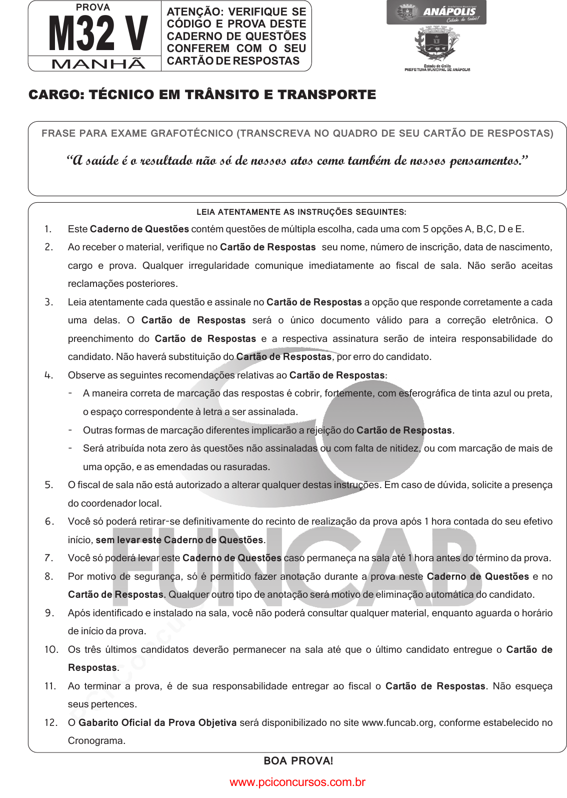 pcimarkpci MDAwMDowMDAwOjAwMDA6MDAwMDowMDAwOmZmZmY6MzZlOTpjMjU5:U2F0LCAxMSBTZXAgMjAyMSAyMDozMToyMyAtMDMwMA== CARGO: TÉCNICO EM TRÂNSITO E TRANSPORTE FRASE PARA EXAME GRAFOTÉCNICO (TRANSCREVA NO QUADRO DE SEU CARTÃO DE RESPOSTAS) “A saúde é o resultado não só de nossos atos como também de nossos pensamentos.” M32 V ATENÇÃO: VERIFIQUE SE CÓDIGO E PROVA DESTE CADERNO DE QUESTÕES CONFEREM COM O SEU CARTÃO DE RESPOSTAS PROVA MANHÃ 1. Este contém questões de múltipla escolha, cada uma com 5 opções A, B,C, D e E. 2. Ao receber o material, verifique no seu nome, número de inscrição, data de nascimento, cargo e prova. Qualquer irregularidade comunique imediatamente ao fiscal de sala. Não serão aceitas reclamações posteriores. 3. Leia atentamente cada questão e assinale no a opção que responde corretamente a cada uma delas. O será o único documento válido para a correção eletrônica. O preenchimento do e a respectiva assinatura serão de inteira responsabilidade do candidato. Não haverá substituição do , por erro do candidato. 4. Observe as seguintes recomendações relativas ao : - A maneira correta de marcação das respostas é cobrir, fortemente, com esferográfica de tinta azul ou preta, o espaço correspondente à letra a ser assinalada. - Outras formas de marcação diferentes implicarão a rejeição do . - Será atribuída nota zero às questões não assinaladas ou com falta de nitidez, ou com marcação de mais de uma opção, e as emendadas ou rasuradas. 5. O fiscal de sala não está autorizado a alterar qualquer destas instruções. Em caso de dúvida, solicite a presença do coordenador local. 6. Você só poderá retirar-se definitivamente do recinto de realização da prova após 1 hora contada do seu efetivo início, . 7. Você só poderá levar este caso permaneça na sala até 1 hora antes do término da prova. 8. Por motivo de segurança, só é permitido fazer anotação durante a prova neste e no . Qualquer outro tipo de anotação será motivo de eliminação automática do candidato. 9. Após identificado e instalado na sala, você não poderá consultar qualquer material, enquanto aguarda o horário de início da prova. 10. Os três últimos candidatos deverão permanecer na sala até que o último candidato entregue o . 11. Ao terminar a prova, é de sua responsabilidade entregar ao fiscal o . Não esqueça seus pertences. 12. O será disponibilizado no site www.funcab.org, conforme estabelecido no Cronograma. Caderno de Questões Cartão de Respostas Cartão de Respostas Cartão de Respostas Cartão de Respostas Cartão de Respostas Cartão de Respostas Cartão de Respostas sem levar este Caderno de Questões Caderno de Questões Caderno de Questões Cartão de Respostas Cartão de Respostas Cartão de Respostas Gabarito Oficial da Prova Objetiva LEIA ATENTAMENTE AS INSTRUÇÕES SEGUINTES: BOA PROVA! www.pciconcursos.com.br pcimarkpci MDAwMDowMDAwOjAwMDA6MDAwMDowMDAwOmZmZmY6MzZlOTpjMjU5:U2F0LCAxMSBTZXAgMjAyMSAyMDozMToyMyAtMDMwMA== 02 Leia o texto abaixo e responda às questões propostas. Acredita-se que a leitura é uma aprendizagem desde os primeiros dias de vida. Ler a uma criança, ainda que no útero, pode ser benéfico, mesmo que a ciência não consiga provar que espécie de benefício possa ser esse. Sabemos, isso sim, que, em qualquer dos casos, ler é um alimento do espírito sem o qual ficamos incompletos. Ler às crianças durante os seus primeiros anos de vida ajuda-as a crescer, não só intelectualmente como do ponto de vista da compreensão do mundo. A medida da imaginação de cada um na vida adulta, a meta que cada um de nós consegue atingir no exercício da mais espantosa e complexa das nossas capacidades – o ser capaz de pensar – é determinada pela forma como nos moldaram a nossa imaginação durante os primeiros anos de vida. Somos o que lemos. Quem nunca leu ou quem leu muito pouco, não conhece nem o mundo em que vive nem os mundos com que podemos sonhar. Quem lê vê mais; quem lê sonha mais; quem lê decide melhor; quem lê governa melhor; quem lê escreve melhor. Poucos são os atos que valorizamos e que praticamos que não possam ser melhorados com mais leitura. (...) Ler é um remédio santo para a mais complexa das doenças que é a solidão. Ninguém está só, havendo um livro para ler. E, se tivermos um livro para escrever, então somos muitos. DA IMPORTÂNCIA DE LER E ESCREVER (CEIA, Carlos. In: http://www2.fcsh.unl.pt/docentes/cceia/lerescrever.htm. acesso em 20/11/2011. adaptado) LÍNGUA PORTUGUESA FUNCAB - Fundação Professor Carlos Augusto Bittencourt De acordo com o texto, “a leitura é uma aprendizagem desde os primeiros dias de vida”. Assinale a alternativa em cujo trecho o autor reitera essa afirmação inicial. A) “Quem nunca leu ou quem leu muito pouco, não conhece nem o mundo em que vive nem os mundos com que podemos sonhar.” (parágrafo 2) B) “Ler a uma criança, ainda que no útero, pode ser benéfico, mesmo que a ciência não consiga provar que espécie de benefício possa ser esse.” (parágrafo 1) C) “Ler é um remédio santo para a mais complexa das doenças que é a solidão.” (parágrafo 4) D) “... ler é um alimento do espírito sem o qual ficamos incompletos.” (parágrafo 1) E) “E, se tivermos um livro para escrever, então somos muitos.” (parágrafo 4) Questão 01 Assinale a alternativa correta em relação à leitura do texto. A) A pessoa que lê muito se isola do mundo e se torna antissocial. B) A leitura promove a solidão do homem no mundo contemporâneo. C) Com a prática de leitura, o homem se torna muito materialista. D) Ler proporciona mais conhecimento e compreensão do mundo. E) O isolamento do homem moderno é causado pela leitura frequente. Questão 02 A opção em que o vocábulo O tem a mesma classificação gramatical que em “Somos O que lemos” (parágrafo 2) é: A) Depois que passou a ler muito, ninguém O reconhece mais.