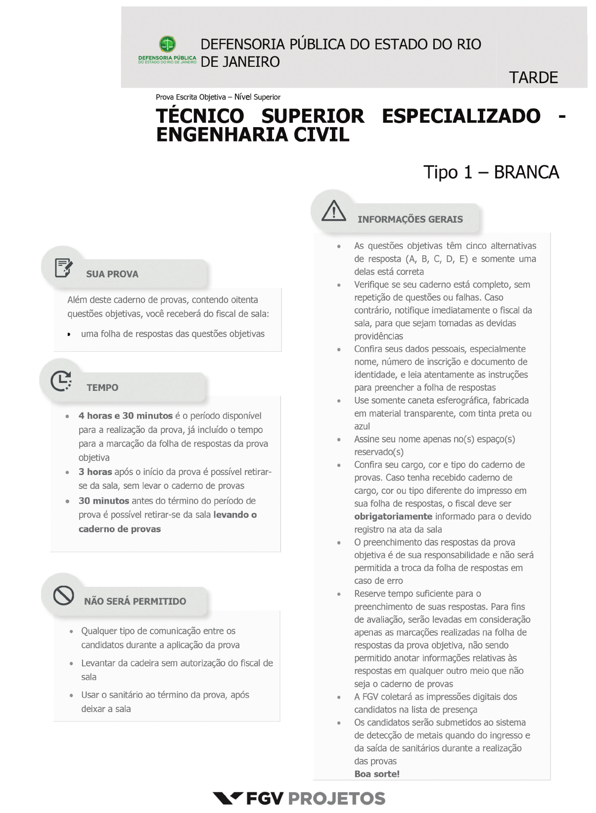 www.pciconcursos.com.br www.pciconcursos.com.br DEFENSORIA PÚBLICA DO ESTADO DO RIO DE JANEIRO FGV – Projetos TÉCNICO SUPERIOR ESPECIALIZADO - ENGENHARIA CIVIL Tipo 1 – Cor BRANCA – Página 3 LÍNGUA PORTUGUESA Texto 1 Uma revista de Educação mostrava o seguinte segmento: “Os modelos pedagógicos de nossas escolas ainda são muito mais direcionados ao ensino teórico para passar no funil do vestibular, obrigando os alunos a decorar fórmulas matemáticas, afluentes de rios ou a morfologia dos insetos para ter depois seus conhecimentos testados e avaliados por notas que não diferenciam as vocações ou interesses individuais. É uma avaliação cruel, que prioriza a inteligência da decoreba ao invés da inteligência criativa”. 1 Entre as ideias defendidas no texto 1, a única que NÃO está presente é: (A) a criatividade deve ser priorizada nos modelos pedagógicos; (B) as notas dadas às provas não visam aos interesses pessoais; (C) o ensino teórico é uma decorrência dos exames vestibulares; (D) os exames vestibulares não avaliam com critérios válidos; (E) alguns tópicos tradicionais do ensino são inúteis nos exames vestibulares. 2 “Os modelos pedagógicos de nossas escolas ainda são muito mais direcionados ao ensino teórico para passar no funil do vestibular, obrigando os alunos a decorar fórmulas matemáticas...”; o gerúndio “obrigando” (texto 1) poderia ser adequadamente substituído pela seguinte forma desenvolvida: (A) e obrigam; (B) e para obrigar; (C) mesmo que obriguem; (D) quando obrigam; (E) à medida que obrigam. 3 “Os modelos pedagógicos de nossas escolas ainda são muito mais direcionados ao ensino teórico para passar no funil do vestibular...”; esse segmento (texto 1) mostra uma forma de voz passiva - “são direcionados” - sem que haja menção do agente dessa ação. O pensamento abaixo em que há uma forma de voz passiva com a indicação do agente é: (A) “A natureza só é comandada se é obedecida”; (B) “Dada a causa, a natureza produz o efeito no modo mais breve em que pode ser produzido”; (C) “O mundo será julgado pelas crianças. O espírito da infância julgará o mundo”; (D) “Existe alguma religião cujos fiéis possam ser apontados como nitidamente mais amáveis e dignos de confiança do que os de qualquer outra?”; (E) “A sabedoria não pode ser transmitida. A sabedoria que um sábio tenta transmitir soa mais como loucura”. 4 “É uma avaliação cruel, que prioriza a inteligência da decoreba ao invés da inteligência criativa”. Nesse segmento do texto 1, há a correta utilização da expressão “ao invés de”, que é muitas vezes confundida com “em vez de”. A frase abaixo em que se deveria empregar “em vez de” em lugar de “ao invés de” é: (A) O pai decidiu matricular o filho numa escola pública ao invés de uma privada; (B) Não é de hoje que as escolas brasileiras preferem o retrocesso ao invés do progresso; (C) Muitos professores dão destaque à teoria ao invés de priorizar a prática; (D) Os livros didáticos utilizam imagens ao invés de textos; (E) As escolas utilizam processos de avaliação rápidos ao invés de processos mais lentos e mais eficientes. Texto 2 “Nós conhecemos você tanto quanto você nos conhece. E não há nada melhor que isso: confiança. O que nos move é você. Seu jeito de ser, o que valoriza. Faz sentido pra você, faz sentido pra gente. A gente veste a sua camisa”. Esse texto está fixado na parede de uma loja de roupas masculinas e funciona como um texto publicitário da loja. 5 A finalidade principal do texto 2 é: (A) indicar a sofisticação dos produtos da loja por meio de uma linguagem formal; (B) mostrar a preocupação da loja com o que o cliente veste; (C) demonstrar a informalidade no atendimento; (D) produzir proximidade social entre loja e cliente; (E) destacar o fácil acesso do cliente à loja. 6 Sobre a estruturação geral do texto 2, a afirmação INADEQUADA é: (A) os pronomes “Nós” e “você” (linha 1) se referem, respectivamente, à loja e ao cliente potencial; (B) na linha 2, o pronome “isso” deveria ser substituído por “isto”; (C) o vocábulo “confiança” mostra a referência do pronome “isso”; (D) a frase final do texto mostra ambiguidade intencional; (E) a expressão “a gente” equivale perfeitamente ao pronome “nós”. www.pciconcursos.com.br DEFENSORIA PÚBLICA DO ESTADO DO RIO DE JANEIRO FGV – Projetos TÉCNICO SUPERIOR ESPECIALIZADO - ENGENHARIA CIVIL Tipo 1 – Cor BRANCA – Página 4 7 Uma editora paulista mostra o seguinte texto publicitário na agenda que entrega a clientes e amigos: DA SEMENTE AO LIVRO Sustentabilidade por todo o caminho Plantar florestas – A madeira que serve de matéria-prima para nosso papel vem de plantio renovável, ou seja, não é fruto de desmatamento. Essa prática gera milhares de empregos para agricultores e recupera áreas ambientais degradadas. Sobre esse pequeno texto, é correto afirmar que: (A) o “caminho” presente no título é o que vai “da semente ao livro”; (B) o segmento “Plantar florestas” mostra a finalidade da editora; (C) a expressão “ou seja” corrige um possível erro de interpretação; (D) o termo “Essa prática” se refere ao “desmatamento”; (E) a editora mostra preocupação com a poluição e o desemprego. 8 Na orelha do livro “A Bíblia: uma biografia” (Rio de Janeiro: Jorge Zahar. Ed., 2007), aparece o seguinte texto: “A principal função da Bíblia, no entanto, ao longo de sua demorada gestação, não foi apoiar doutrinas e crenças particulares [....]. A produção de uma escritura sagrada consistiu antes em atividade contínua, um processo que buscava introduzir milhares de pessoas à transcendência”. A informação abaixo que NÃO pode ser depreendida da leitura desse texto é: (A) o termo “no entanto” indica que esse segmento não é a parte inicial do texto; (B) o text