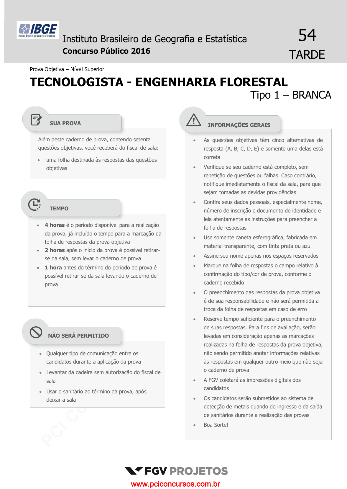 pcimarkpci MDAwMDowMDAwOjAwMDA6MDAwMDowMDAwOmZmZmY6MzZlOTpjMjU5:U2F0LCAxMSBTZXAgMjAyMSAyMzoyMjozNSAtMDMwMA== Instituto Brasileiro de Geografia e Estatística 54 Concurso Público 2016 TARDE Prova Objetiva – Nível Superior TECNOLOGISTA - ENGENHARIA FLORESTAL Tipo 1 – BRANCA Além deste caderno de prova, contendo setenta questões objetivas, você receberá do fiscal de sala: uma folha destinada às respostas das questões objetivas As questões objetivas têm cinco alternativas de resposta (A, B, C, D, E) e somente uma delas está correta Verifique se seu caderno está completo, sem repetição de questões ou falhas. Caso contrário, notifique imediatamente o fiscal da sala, para que sejam tomadas as devidas providências Confira seus dados pessoais, especialmente nome, número de inscrição e documento de identidade e leia atentamente as instruções para preencher a folha de respostas Use somente caneta esferográfica, fabricada em material transparente, com tinta preta ou azul Assine seu nome apenas nos espaços reservados Marque na folha de respostas o campo relativo à confirmação do tipo/cor de prova, conforme o caderno recebido O preenchimento das respostas da prova objetiva é de sua responsabilidade e não será permitida a troca da folha de respostas em caso de erro Reserve tempo suficiente para o preenchimento de suas respostas. Para fins de avaliação, serão levadas em consideração apenas as marcações realizadas na folha de respostas da prova objetiva, não sendo permitido anotar informações relativas às respostas em qualquer outro meio que não seja o caderno de prova A FGV coletará as impressões digitais dos candidatos Os candidatos serão submetidos ao sistema de detecção de metais quando do ingresso e da saída de sanitários durante a realização das provas Boa Sorte! 4 horas é o período disponível para a realização da prova, já incluído o tempo para a marcação da folha de respostas da prova objetiva 2 horas após o início da prova é possível retirar- se da sala, sem levar o caderno de prova 1 hora antes do término do período de prova é possível retirar-se da sala levando o caderno de prova Qualquer tipo de comunicação entre os candidatos durante a aplicação da prova Levantar da cadeira sem autorização do fiscal de sala Usar o sanitário ao término da prova, após deixar a sala SUA PROVA TEMPO NÃO SERÁ PERMITIDO INFORMAÇÕES GERAIS www.pciconcursos.com.br pcimarkpci MDAwMDowMDAwOjAwMDA6MDAwMDowMDAwOmZmZmY6MzZlOTpjMjU5:U2F0LCAxMSBTZXAgMjAyMSAyMzoyMjozNSAtMDMwMA== www.pciconcursos.com.br pcimarkpci MDAwMDowMDAwOjAwMDA6MDAwMDowMDAwOmZmZmY6MzZlOTpjMjU5:U2F0LCAxMSBTZXAgMjAyMSAyMzoyMjozNSAtMDMwMA== Instituto Brasileiro de Geografia e Estatística FGV Projetos Tecnologista - Engenharia Florestal Tipo 1 – Cor BRANCA – Página 3 Conhecimentos Básicos Texto – A eficácia das palavras certas Havia um cego sentado numa calçada em Paris. A seus pés, um boné e um cartaz em madeira escrito com giz branco gritava: “Por favor, ajude-me. Sou cego”. Um publicitário da área de criação, que passava em frente a ele, parou e viu umas poucas moedas no boné. Sem pedir licença, pegou o cartaz e com o giz escreveu outro conceito. Colocou o pedaço de madeira aos pés do cego e foi embora. Ao cair da tarde, o publicitário voltou a passar em frente ao cego que pedia esmola. Seu boné, agora, estava cheio de notas e moedas. O cego reconheceu as pegadas do publicitário e perguntou se havia sido ele quem reescrevera o cartaz, sobretudo querendo saber o que ele havia escrito. O publicitário respondeu: “Nada que não esteja de acordo com o conceito original, mas com outras palavras”. E, sorrindo, continuou o seu caminho. O cego nunca soube o que estava escrito, mas seu novo cartaz dizia: “Hoje é primavera em Paris e eu não posso vê-la”. (Produção de Texto, Maria Luíza M. Abaurre e Maria Bernadete M. Abaurre) 1 O título dado ao texto: (A) resume a história narrada no corpo do texto; (B) afirma algo que é contrariado pela narrativa; (C) indica um princípio que é demonstrado no texto; (D) mostra um pensamento independente do texto; (E) denuncia um princípio negativo de convencimento. 2 A frase abaixo que exemplifica uma incoerência é: (A) “O que vem fácil, vai fácil”. (Geoffrey Chaucer); (B) “Se você deseja atingir o ponto mais alto, comece pelo mais baixo”. (Ciro, o Jovem); (C) “Perseverança não é uma corrida longa, são muitas corridas curtas, uma após a outra”. (Walter Elliot); (D) “Nossa maior glória não é nunca cair, mas sim levantar toda vez que caímos”. (Oliver Goldsmith); (E) “Seja breve, não importa quanto tempo isto leve”. (Saul Gorn). 3 “Havia um cego sentado numa calçada em Paris. A seus pés, um boné e um cartaz em madeira escrito com giz branco gritava: “Por favor, ajude-me. Sou cego”. Um publicitário da área de criação, que passava em frente a ele, parou e viu umas poucas moedas no boné. Sem pedir licença, pegou o cartaz e com o giz escreveu outro conceito. Colocou o pedaço de madeira aos pés do cego e foi embora”. O texto pertence ao modo narrativo de organização discursiva, caracterizado pela evolução cronológica das ações. O segmento que comprova essa evolução é: (A) “Havia um cego sentado numa calçada em Paris. A seus pés, um boné e um cartaz em madeira escrito com giz branco gritava”; (B) “Por favor, ajude-me. Sou cego”; (C) “Um publicitário da área de criação, que passava em frente a ele”; (D) “parou e viu umas poucas moedas no boné”; (E) “Sem pedir licença, pegou o cartaz”. 4 A frase abaixo em que o emprego do demonstrativo sublinhado está inadequado é: (A) “As capas deste livro que você leva são muito separadas”. (Ambrose Bierce); (B) “Quando alguém pergunta a um autor o que este quis dizer, é porque um dos dois é burro”. (Mário Quintana); (C) “Claro que a vida é bizarra. O único modo d