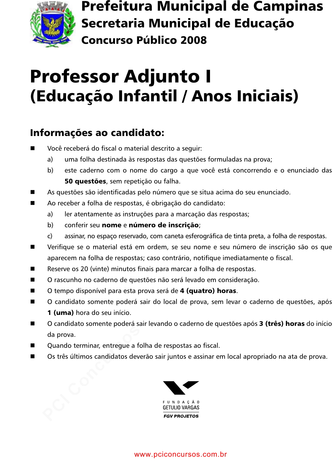 pcimarkpci MDAwMDowMDAwOjAwMDA6MDAwMDowMDAwOmZmZmY6MzZlOTpjMjU5:U3VuLCAxMiBTZXAgMjAyMSAwOTo0NToyMCAtMDMwMA== Informações ao candidato: Você receberá do fiscal o material descrito a seguir: a) uma folha destinada às respostas das questões formuladas na prova; b) este caderno com o nome do cargo a que você está concorrendo e o enunciado das 50 questões, sem repetição ou falha. As questões são identificadas pelo número que se situa acima do seu enunciado. Ao receber a folha de respostas, é obrigação do candidato: a) ler atentamente as instruções para a marcação das respostas; b) conferir seu nome e número de inscrição; c) assinar, no espaço reservado, com caneta esferográfica de tinta preta, a folha de respostas. Verifique se o material está em ordem, se seu nome e seu número de inscrição são os que aparecem na folha de respostas; caso contrário, notifique imediatamente o fiscal. Reserve os 20 (vinte) minutos finais para marcar a folha de respostas. O rascunho no caderno de questões não será levado em consideração. O tempo disponível para esta prova será de 4 (quatro) horas. O candidato somente poderá sair do local de prova, sem levar o caderno de questões, após 1 (uma) hora do seu início. O candidato somente poderá sair levando o caderno de questões após 3 (três) horas do início da prova. Quando terminar, entregue a folha de respostas ao fiscal. Os três últimos candidatos deverão sair juntos e assinar em local apropriado na ata de prova. Professor Adjunto I (Educação Infantil / Anos Iniciais) Prefeitura Municipal de Campinas Secretaria Municipal de Educação Concurso Público 2008 www.pciconcursos.com.br pcimarkpci MDAwMDowMDAwOjAwMDA6MDAwMDowMDAwOmZmZmY6MzZlOTpjMjU5:U3VuLCAxMiBTZXAgMjAyMSAwOTo0NToyMCAtMDMwMA== Professor Adjunto I – (Educação Infantil / Anos Iniciais) 2 | Concurso Público 2008 – Prefeitura Municipal de Campinas – Secretaria Municipal de Educação LÍNGUA PORTUGUESA Mundo pós-americano Finalmente, o establishment intelectual norte-americano rendeu-se à realidade! Depois de quase duas décadas de um debate interminável sobre os contornos do mundo pós-Guerra Fria – hegemonia norte-americana ou multipolaridade –, intelectuais de peso do país decidiram que a era em que vivemos já tem um nome definido: o mundo pós-americano. Na última edição da Foreign Affairs, a mais importante e mais lida revista de política internacional do mundo, o artigo- destaque é o de Fareed Zakaria, editor da Newsweek Internacional e autor do mais comentado livro do momento, The post-american world (W.W. Norton, 2008). Zakaria aborda o mesmo tema desenvolvido em seu último livro, que pode ser resumido da seguinte forma: a ascensão de poderes como Brasil, Rússia, Índia e China no cenário internacional irá, necessariamente, abalar a proeminência político-econômica norte-americana. Contudo, afirma o autor, isso não deve ser motivo para preocupações exageradas em Washington. O país ainda tem condições de manter os newcomers sob sua liderança por meio de políticas de engajamento nas instituições criadas no pós-guerra, como a ONU e a OMC (antigo GATT). Elas foram responsáveis pela estabilidade política e econômica a que o mundo assistiu nas últimas décadas e que possibilitou a ascensão de novas potências emergentes. Em The post-american world, Zakaria nos convida a olhar em volta e perceber o quanto símbolos de poder outrora imediatamente identificados com os Estados Unidos hoje enchem os olhos de cidadãos no “resto” do globo: o maior prédio do mundo fica em Taipei e o próximo será erguido no Dubai; a maior empresa pública de comércio fica em Beijing; a maior refinaria do mundo está sendo construída na Índia – o maior avião de passageiros, na Europa; o maior fundo de investimentos do planeta fica em Abu Dhabi; a grande indústria cinematográfica é Bollywood, não Hollywood; a maior montanha-russa fica em Cingapura, e o maior cassino, em Macau; e, na lista dos dez maiores shopping centers do mundo, nenhum é norte-americano; por fim, nos mais recentes rankings, apenas duas das pessoas mais ricas do mundo são norte-americanas. Como alguém que acaba se dando conta de um óbvio silencioso, Zakaria inverte algumas premissas da atualidade e sentencia: “Enquanto nos perguntamos por que eles nos odeiam, eles seguem em frente, muito mais interessados em partes mais dinâmicas do globo. O mundo mudou do anti-americanismo para o pós- americanismo.” (...) (Sílvia Ferabolli, Cláudio César Dutra de Souza. Le Monde Diplomatique Brasil. outubro de 2008) 1 Com base na leitura do texto I, analise as afirmativas a seguir: I. O texto apresenta uma visão imparcial do cenário da inserção dos Estados Unidos na contemporaneidade. II. É possível inferir que os símbolos de grandiosidade dos Estados Unidos se deslocaram pelo mundo, construindo uma descentralização da esfera de influência e poder. III. O texto aponta para o encerramento do debate acerca do cenário mundial no pós-Guerra Fria sem ter concluído por qualquer dos pólos da discussão. Assinale: (A) se apenas as afirmativas I e II estiverem corretas. (B) se apenas as afirmativas I e III estiverem corretas. (C) se apenas as afirmativas II e III estiverem corretas. (D) se nenhuma afirmativa estiver correta. (E) se todas as afirmativas estiverem corretas. 2 “Em The post-american world, Zakaria nos convida a olhar em volta e perceber o quanto símbolos de poder outrora imediatamente identificados com os Estados Unidos hoje enchem os olhos de cidadãos no ‘resto’ do globo...” (L.25-28) A palavra resto foi colocada entre aspas no trecho acima com o intuito de: (A) caracterizar a fala de Zakaria. (B) indicar a inadequação social da palavra em relação às demais usadas no texto. (C) enfatizar o uso da palavra com sentido hiperbólico ao que se quis dizer. (D) destacar a palavra para atribuir-lhe um valor eufêmico no contexto