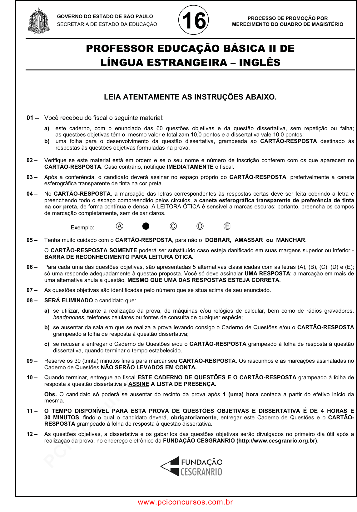 pcimarkpci MDAwMDowMDAwOjAwMDA6MDAwMDowMDAwOmZmZmY6MzZlOTpjMjU5:TW9uLCAxMyBTZXAgMjAyMSAwNTo0NDoxMCAtMDMwMA== GOVERNO DO ESTADO DE SÃO PAULO SECRETARIA DE ESTADO DA EDUCAÇÃO PROCESSO DE PROMOÇÃO POR MERECIMENTO DO QUADRO DE MAGISTÉRIO PROFESSOR EDUCAÇÃO BÁSICA II DE LÍNGUA ESTRANGEIRA – INGLÊS LEIA ATENTAMENTE AS INSTRUÇÕES ABAIXO. 01 – Você recebeu do fiscal o seguinte material: a) este caderno, com o enunciado das 60 questões objetivas e da questão dissertativa, sem repetição ou falha; as questões objetivas têm o mesmo valor e totalizam 10,0 pontos e a dissertativa vale 10,0 pontos; b) uma folha para o desenvolvimento da questão dissertativa, grampeada ao CARTÃO-RESPOSTA destinado às respostas às questões objetivas formuladas na prova. 02 – Verifique se este material está em ordem e se o seu nome e número de inscrição conferem com os que aparecem no CARTÃO-RESPOSTA. Caso contrário, notifique IMEDIATAMENTE o fiscal. 03 – Após a conferência, o candidato deverá assinar no espaço próprio do CARTÃO-RESPOSTA, preferivelmente a caneta esferográfica transparente de tinta na cor preta. 04 – No CARTÃO-RESPOSTA, a marcação das letras correspondentes às respostas certas deve ser feita cobrindo a letra e preenchendo todo o espaço compreendido pelos círculos, a caneta esferográfica transparente de preferência de tinta na cor preta, de forma contínua e densa. A LEITORA ÓTICA é sensível a marcas escuras; portanto, preencha os campos de marcação completamente, sem deixar claros. Exemplo: 05 – Tenha muito cuidado com o CARTÃO-RESPOSTA, para não o DOBRAR, AMASSAR ou MANCHAR. O CARTÃO-RESPOSTA SOMENTE poderá ser substituído caso esteja danificado em suas margens superior ou inferior - BARRA DE RECONHECIMENTO PARA LEITURA ÓTICA. 06 – Para cada uma das questões objetivas, são apresentadas 5 alternativas classificadas com as letras (A), (B), (C), (D) e (E); só uma responde adequadamente à questão proposta. Você só deve assinalar UMA RESPOSTA: a marcação em mais de uma alternativa anula a questão, MESMO QUE UMA DAS RESPOSTAS ESTEJA CORRETA. 07 – As questões objetivas são identificadas pelo número que se situa acima de seu enunciado. 08 – SERÁ ELIMINADO o candidato que: a) se utilizar, durante a realização da prova, de máquinas e/ou relógios de calcular, bem como de rádios gravadores, headphones, telefones celulares ou fontes de consulta de qualquer espécie; b) se ausentar da sala em que se realiza a prova levando consigo o Caderno de Questões e/ou o CARTÃO-RESPOSTA grampeado à folha de resposta à questão dissertativa; c) se recusar a entregar o Caderno de Questões e/ou o CARTÃO-RESPOSTA grampeado à folha de resposta à questão dissertativa, quando terminar o tempo estabelecido. 09 – Reserve os 30 (trinta) minutos finais para marcar seu CARTÃO-RESPOSTA. Os rascunhos e as marcações assinaladas no Caderno de Questões NÃO SERÃO LEVADOS EM CONTA. 10 – Quando terminar, entregue ao fiscal ESTE CADERNO DE QUESTÕES E O CARTÃO-RESPOSTA grampeado à folha de resposta à questão dissertativa e ASSINE A LISTA DE PRESENÇA. Obs. O candidato só poderá se ausentar do recinto da prova após 1 (uma) hora contada a partir do efetivo início da mesma. 11 – O TEMPO DISPONÍVEL PARA ESTA PROVA DE QUESTÕES OBJETIVAS E DISSERTATIVA É DE 4 HORAS E 30 MINUTOS, findo o qual o candidato deverá, obrigatoriamente, entregar este Caderno de Questões e o CARTÃO- RESPOSTA grampeado à folha de resposta à questão dissertativa. 12 – As questões objetivas, a dissertativa e os gabaritos das questões objetivas serão divulgados no primeiro dia útil após a realização da prova, no endereço eletrônico da FUNDAÇÃO CESGRANRIO (http://www.cesgranrio.org.br). 16 www.pciconcursos.com.br pcimarkpci MDAwMDowMDAwOjAwMDA6MDAwMDowMDAwOmZmZmY6MzZlOTpjMjU5:TW9uLCAxMyBTZXAgMjAyMSAwNTo0NDoxMCAtMDMwMA== � www.pciconcursos.com.br pcimarkpci MDAwMDowMDAwOjAwMDA6MDAwMDowMDAwOmZmZmY6MzZlOTpjMjU5:TW9uLCAxMyBTZXAgMjAyMSAwNTo0NDoxMCAtMDMwMA== � � �3 PEB�II�–�PARTE�GERAL� PEB II PARTE GERAL 1 De modo mais abrangente, o que se espera que o aluno demonstre, ao término da escolaridade básica, (A) competências e habilidades para leitura de diferentes mídias. (B) domínio de algoritmos computacionais e de uma língua estrangeira. (C) competências para transformar informação em conhecimento e saber utilizá-lo em diferentes contextos. (D) domínio das novas tecnologias exigidas pelo mundo do trabalho. (E) domínio das técnicas de comunicação e expressão. 2 Com base no princípio da centralidade atribuída ao desenvolvimento da competência leitora e escritora na Proposta Curricular do Estado de São Paulo, espera- se que os professores das diferentes disciplinas compreendam que apenas I os professores de Língua Portuguesa são os responsáveis por favorecer o desenvolvimento desta competência. II os professores das disciplinas da área de Ciências Humanas contribuem para o desenvolvimento desta competência por meio de interpretação de textos. III os professores de Matemática estão dispensados desta atribuição, pois só utilizam textos científicos. IV os professores das disciplinas da área de Ciências da Natureza estão habilitados a favorecer o desenvolvimento dessa competência por meio de textos científicos, entre outros. Estão corretas (A) I, apenas. (B) I, II e IV apenas. (C) I, III e IV apenas. (D) II, III e IV apenas. (E) I, II, III e IV. 3 Quando Luzia começou a trabalhar na escola estadual em que é professora, tinha muita dificuldade em identificar os papéis e funções dos diferentes profissionais. Hoje, depois de alguns anos na escola e de muitas reuniões, ela já compreende como se estabelecem as relações entre os diferentes agentes e suas responsabilidades. Assim, Luzia deve entender que (A) o professor coordenador é um profissional com autonomia para modificar o projeto pedag
