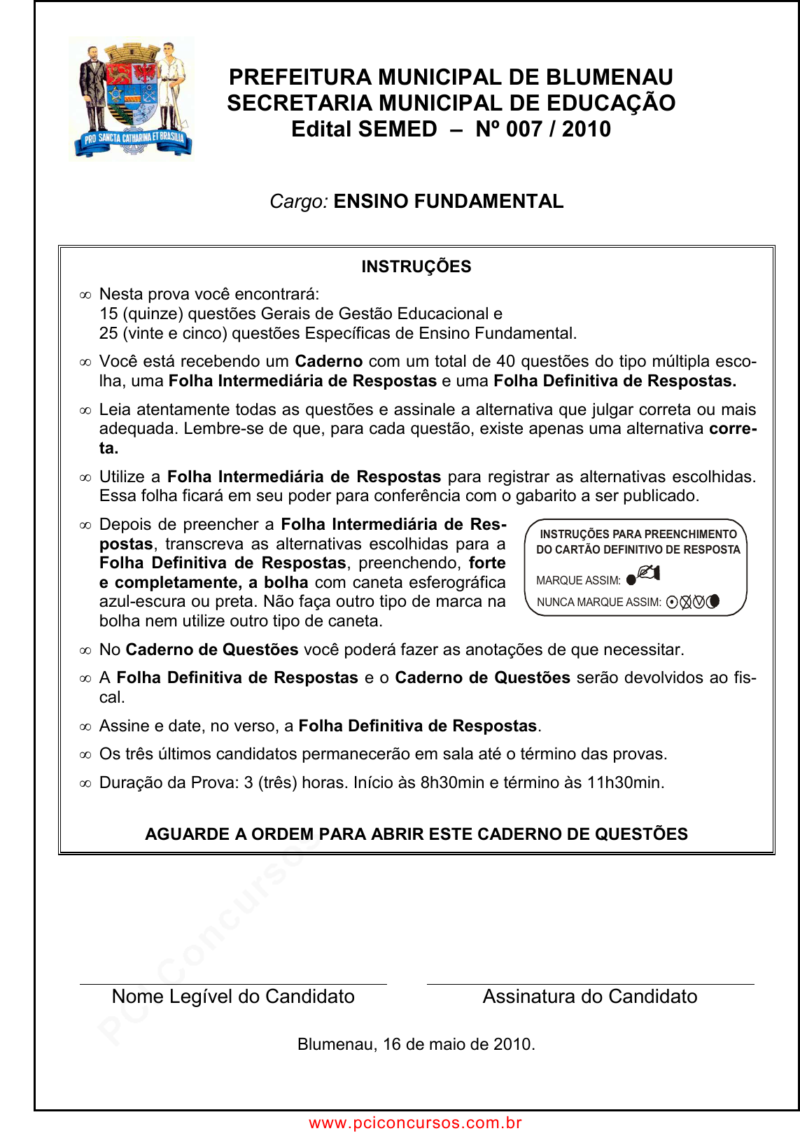 pcimarkpci MDAwMDowMDAwOjAwMDA6MDAwMDowMDAwOmZmZmY6MzZlOTpjMjU5:TW9uLCAxMyBTZXAgMjAyMSAwNjowODowOCAtMDMwMA== PREFEITURA MUNICIPAL DE BLUMENAU SECRETARIA MUNICIPAL DE EDUCAÇÃO Edital SEMED – Nº 007 / 2010 Cargo: ENSINO FUNDAMENTAL INSTRUÇÕES • Nesta prova você encontrará: 15 (quinze) questões Gerais de Gestão Educacional e 25 (vinte e cinco) questões Específicas de Ensino Fundamental. • Você está recebendo um Caderno com um total de 40 questões do tipo múltipla esco- lha, uma Folha Intermediária de Respostas e uma Folha Definitiva de Respostas. • Leia atentamente todas as questões e assinale a alternativa que julgar correta ou mais adequada. Lembre-se de que, para cada questão, existe apenas uma alternativa corre- ta. • Utilize a Folha Intermediária de Respostas para registrar as alternativas escolhidas. Essa folha ficará em seu poder para conferência com o gabarito a ser publicado. • Depois de preencher a Folha Intermediária de Res- postas , transcreva as alternativas escolhidas para a Folha Definitiva de Respostas , preenchendo, forte e completamente, a bolha com caneta esferográfica azul-escura ou preta. Não faça outro tipo de marca na bolha nem utilize outro tipo de caneta. • No Caderno de Questões você poderá fazer as anotações de que necessitar. • A Folha Definitiva de Respostas e o Caderno de Questões serão devolvidos ao fis- cal. • Assine e date, no verso, a Folha Definitiva de Respostas . • Os três últimos candidatos permanecerão em sala até o término das provas. • Duração da Prova: 3 (três) horas. Início às 8h30min e término às 11h30min. AGUARDE A ORDEM PARA ABRIR ESTE CADERNO DE QUESTÕES Nome Legível do Candidato Assinatura do Candidato Blumenau, 16 de maio de 2010. INSTRUÇÕES PARA PREENCHIMENTO DO CARTÃO DEFINITIVO DE RESPOSTA MARQUE ASSIM: NUNCA MARQUE ASSIM: www.pciconcursos.com.br pcimarkpci MDAwMDowMDAwOjAwMDA6MDAwMDowMDAwOmZmZmY6MzZlOTpjMjU5:TW9uLCAxMyBTZXAgMjAyMSAwNjowODowOCAtMDMwMA== Secretaria Municipal de Educação - Blumenau - Edi tal SEMED Nº 07/2010 Página 2 de 13 QUESTÕES GERAIS DE GESTÃO EDUCACIONAL 1- A Constituição Brasileira atual determina, em seu Artigo 211, parágrafos 2º e 3º, a responsabilidade de Esta- dos, Distrito Federal e Municípios na oferta da Educação Básica definindo a prioridade de atendimento em ca- da um de seus níveis. Com base no que determina este artigo, é correto afirmar que: (A) O Estado e o Distrito Federal atuam, prioritariamente, no Ensino Fundamental e na Educação Infantil, e os municípios, no Fundamental e Médio. (B) Os municípios atuam, prioritariamente, no Ensino Fundamental e na Educação Infantil, e os Estados e Dis- trito Federal, no Fundamental e Médio. (C) Os Estados e os Municípios determinam a prioridade de sua atuação nos níveis da Educação Básica, con- forme as necessidades de sua região, levando, para isso, em conta os resultados dos censos educacio- nais. (D) Estados e Distrito Federal atuam na Educação Superior, e os municípios, no Ensino Fundamental, no En- sino Médio e na Educação Infantil, priorizando o atendimento da Educação Infantil. (E) Estados e Distrito Federal atuam na Educação Superior, e os municípios, no Ensino Fundamental, no En- sino Médio e na Educação Infantil, priorizando o atendimento no Ensino Fundamental. 2- O Artigo 3º, da Lei Federal nº 8.069/1990, estabelece que as crianças e adolescentes gozam de todos os direi- tos fundamentais inerentes à pessoa humana, assegurando-lhes, por lei ou por outros meios, todas as oportu- nidades e facilidades, a fim de lhes facultar o desenvolvimento físico, mental, moral, espiritual e social, em condições de liberdade e de dignidade. Para os efeitos dessa lei, considera-se: (A) Criança a pessoa até doze anos de idade incompletos, e adolescente aquela entre doze e dezoito anos de idade, sendo que, nos casos em que a lei expressar, aplica-se, excepcionalmente, também às pessoas entre dezoito e vinte e um anos de idade. (B) Criança a pessoa até doze anos de idade completos, e adolescente aquela entre doze e dezoito anos de idade. (C) Criança a pessoa até dez anos de idade incompletos, e adolescente a pessoa até vinte anos de idade completos. (D) Criança a pessoa até doze anos de idade incompletos, e adolescente aquele acima de doze anos de ida- de completos. (E) Criança a pessoa até doze anos de idade completos, e adolescente aquele acima de doze anos de idade até vinte e cinco anos completos. 3- Segundo a Constituição Federal, Artigo 213, os recursos públicos são destinados às escolas públicas, poden- do, também, ser dirigidos a escolas comunitárias, confessionais ou filantrópicas que: (A) Comprovem finalidade não-lucrativa e apliquem seus excedentes financeiros em educação, além de asse- gurarem a destinação de seu patrimônio a outra escola comunitária, filantrópica, ou ao poder público, no caso de encerramento de suas atividades. (B) Tenham explicitado, em seu Projeto Político-Pedagógico, atuação comunitária enunciando os avanços co- munitários que poderão gerar. (C) Independentemente do Projeto Político-Pedagógico, comprovem atuação comunitária de modo a promover avanços comunitários. (D) Garantam, em sua organização, programas suplementares de alimentação e assistência à saúde. (E) Recolham tributos compatíveis com a média de arrecadação das empresas da região. 4- A LDB nº 9.394/96, em seu título V, Dos Níveis e Modalidades de Educação e Ensino, define a composição da Educação Escolar em Educação Básica e Educação Superior. Por modalidades de ensino, designa a Educa- ção de Jovens e Adultos, a Educação Profissional e Tecnológica e a Educação Especial. O Plano Nacional de Educação, aprovado pela Lei nº 10.172, em 2001, por sua vez, define: (A) Como objetivos, a elevação global do nível de escolaridade da população; a melhoria da qualidade de en- sino em t
