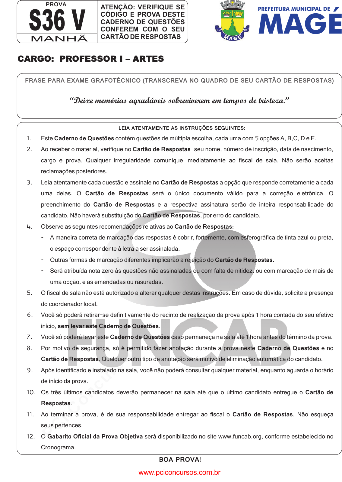 pcimarkpci MDAwMDowMDAwOjAwMDA6MDAwMDowMDAwOmZmZmY6MzZlOTpjMjU5:TW9uLCAxMyBTZXAgMjAyMSAwNjo0MTowMiAtMDMwMA== CARGO: PROFESSOR I – ARTES FRASE PARA EXAME GRAFOTÉCNICO (TRANSCREVA NO QUADRO DE SEU CARTÃO DE RESPOSTAS) “Deixe memórias agradáveis sobreviverem em tempos de tristeza.” S36 V ATENÇÃO: VERIFIQUE SE CÓDIGO E PROVA DESTE CADERNO DE QUESTÕES CONFEREM COM O SEU CARTÃO DE RESPOSTAS PROVA MANHÃ 1. Este contém questões de múltipla escolha, cada uma com 5 opções A, B,C, D e E. 2. Ao receber o material, verifique no seu nome, número de inscrição, data de nascimento, cargo e prova. Qualquer irregularidade comunique imediatamente ao fiscal de sala. Não serão aceitas reclamações posteriores. 3. Leia atentamente cada questão e assinale no a opção que responde corretamente a cada uma delas. O será o único documento válido para a correção eletrônica. O preenchimento do e a respectiva assinatura serão de inteira responsabilidade do candidato. Não haverá substituição do , por erro do candidato. 4. Observe as seguintes recomendações relativas ao : - A maneira correta de marcação das respostas é cobrir, fortemente, com esferográfica de tinta azul ou preta, o espaço correspondente à letra a ser assinalada. - Outras formas de marcação diferentes implicarão a rejeição do . - Será atribuída nota zero às questões não assinaladas ou com falta de nitidez, ou com marcação de mais de uma opção, e as emendadas ou rasuradas. 5. O fiscal de sala não está autorizado a alterar qualquer destas instruções. Em caso de dúvida, solicite a presença do coordenador local. 6. Você só poderá retirar-se definitivamente do recinto de realização da prova após 1 hora contada do seu efetivo início, . 7. Você só poderá levar este caso permaneça na sala até 1 hora antes do término da prova. 8. Por motivo de segurança, só é permitido fazer anotação durante a prova neste e no . Qualquer outro tipo de anotação será motivo de eliminação automática do candidato. 9. Após identificado e instalado na sala, você não poderá consultar qualquer material, enquanto aguarda o horário de início da prova. 10. Os três últimos candidatos deverão permanecer na sala até que o último candidato entregue o . 11. Ao terminar a prova, é de sua responsabilidade entregar ao fiscal o . Não esqueça seus pertences. 12. O será disponibilizado no site www.funcab.org, conforme estabelecido no Cronograma. Caderno de Questões Cartão de Respostas Cartão de Respostas Cartão de Respostas Cartão de Respostas Cartão de Respostas Cartão de Respostas Cartão de Respostas sem levar este Caderno de Questões Caderno de Questões Caderno de Questões Cartão de Respostas Cartão de Respostas Cartão de Respostas Gabarito Oficial da Prova Objetiva LEIA ATENTAMENTE AS INSTRUÇÕES SEGUINTES: BOA PROVA! PREFEITURA MUNICIPAL DE MAGÉ www.pciconcursos.com.br pcimarkpci MDAwMDowMDAwOjAwMDA6MDAwMDowMDAwOmZmZmY6MzZlOTpjMjU5:TW9uLCAxMyBTZXAgMjAyMSAwNjo0MTowMiAtMDMwMA== 02 Leia o texto abaixo e responda às questões propostas. Tenho sempre certa inibição em tratar do tema das crianças e de seu sofrimento. Temo cair no sentimentalismo banal, que alimenta as piedosas almas, burguesas ou não. Sei, pela própria experiência, o quanto há de honrado e o quanto há de hipocrisia nesse proclamado interesse pelos menores abandonados. Devo confessar que sou suspeito e nada imparcial ao tratar do tema, porque, como milhares e milhares de outros brasileiros, também fui um deles, em um tempo em que o mundo era bem melhor. Segunda-feira, reuniram-se fiéis e sacerdotes de todas as crenças para lembrar os meninos mortos há 13 anos no adro da igreja da Candelária. Centenas de discursos, volumosos trabalhos acadêmicos, milhares e milhares de trabalhos jornalísticos tentam explicar esse drama social. Mas há poucos esforços coerentes da sociedade a fim de resolvê-lo. A razão é simples: o abandono dos menores é um assunto dos pobres. E os pobres são pobres. Não se incluem entre os bem nascidos. Se não são bem nascidos, o melhor seria que não tivessem nascido, é o que muitos pensam e proclamam. Parte-se da ideia de que a pobreza deve ser eliminada no ventre, com o ligamento de trompas, em nome da paternidade responsável, quando não a esterilização mediante agentes químicos misturados aos alimentos, doados pelos países ricos às populações miseráveis. Sabe-se que muitas mulheres foram esterilizadas contra a própria vontade. Se os meninos mortos na Candelária tivessem sido eliminados no ventre, os que foram orar em sua memória estariam dispensados desse sacrifício. Se os chefes do PCC e dos outros comandos não tivessem nascido, não estariam hoje assaltando bancos, nem matando policiais. E poderíamos seguir a mesma lógica, para afirmar que se os policiais que mataram essas crianças não tivessem nascido, elas não teriam morrido. Este pode ser o raciocínio de grande parte da classe média − e de muitos ricos. É uma posição de classe. Os pobres, que pensam, embora muitos acreditem que não contam com essa faculdade mental, pensam de outra maneira. Há muitos que vivem das crianças abandonadas. São os que se ocupam delas, criando e administrando organizações não governamentais, os que escrevem livros e os que se elegem prometendo resolver o problema. Só delas não se ocupa, e como deveria ocupar, o Estado. O Estado tem outras prioridades, como a de colocar mais policiais nas ruas para caçar essas crianças quando cometem crimes e eliminá-las de qualquer forma, quando se tornam adultas e criminosas. Falta aos LÍNGUA PORTUGUESA FUNCAB - Fundação Professor Carlos Augusto Bittencourt Na argumentação desenvolvida ao longo do texto, o conteúdo do enunciado em: “É certo que se todas as crianças pudessem só frequentar boas escolas e passar o resto do tempo brincando felizes, seria ótimo.” (parágrafo 5) deve ser visto como: A) conces