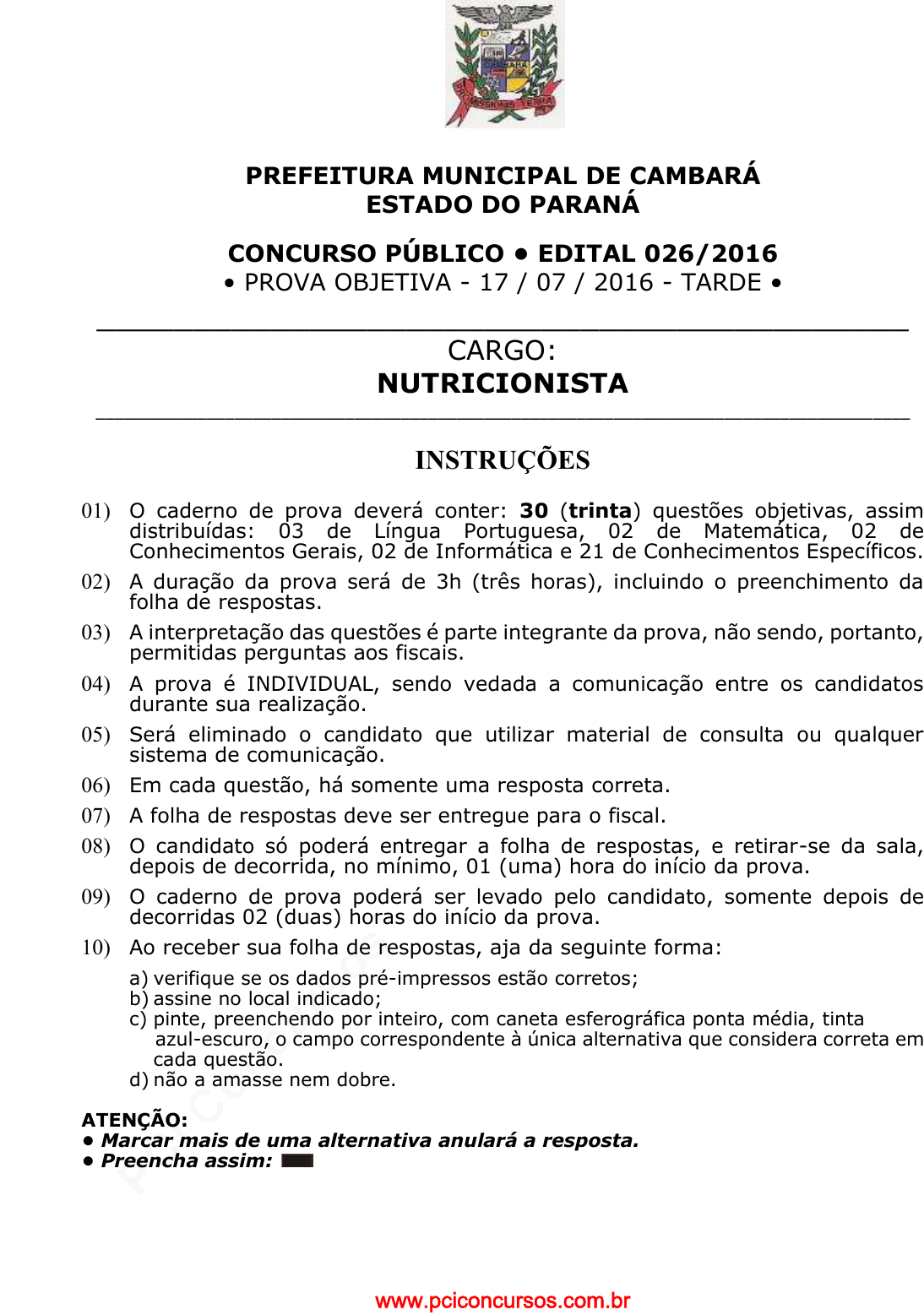 pcimarkpci MDAwMDowMDAwOjAwMDA6MDAwMDowMDAwOmZmZmY6MzZlOTpjMjU5:TW9uLCAxMyBTZXAgMjAyMSAxNjo1MTo1NiAtMDMwMA== PREFEITURA MUNICIPAL DE CAMBARÁ ESTADO DO PARANÁ CONCURSO PÚBLICO • EDITAL 026/2016 • PROVA OBJETIVA - 17 / 07 / 2016 - TARDE • __________________________________________ CARGO: NUTRICIONISTA ________________________________________________________________________________________ INSTRUÇÕES 01) O caderno de prova deverá conter: 30 (trinta) questões objetivas, assim distribuídas: 03 de Língua Portuguesa, 02 de Matemática, 02 de Conhecimentos Gerais, 02 de Informática e 21 de Conhecimentos Específicos. 02) A duração da prova será de 3h (três horas), incluindo o preenchimento da folha de respostas. 03) A interpretação das questões é parte integrante da prova, não sendo, portanto, permitidas perguntas aos fiscais. 04) A prova é INDIVIDUAL, sendo vedada a comunicação entre os candidatos durante sua realização. 05) Será eliminado o candidato que utilizar material de consulta ou qualquer sistema de comunicação. 06) Em cada questão, há somente uma resposta correta. 07) A folha de respostas deve ser entregue para o fiscal. 08) O candidato só poderá entregar a folha de respostas, e retirar-se da sala, depois de decorrida, no mínimo, 01 (uma) hora do início da prova. 09) O caderno de prova poderá ser levado pelo candidato, somente depois de decorridas 02 (duas) horas do início da prova. 10) Ao receber sua folha de respostas, aja da seguinte forma: a) verifique se os dados pré-impressos estão corretos; b) assine no local indicado; c) pinte, preenchendo por inteiro, com caneta esferográfica ponta média, tinta azul-escuro, o campo correspondente à única alternativa que considera correta em cada questão. d) não a amasse nem dobre. ATENÇÃO: • Marcar mais de uma alternativa anulará a resposta. • Preencha assim: www.pciconcursos.com.br pcimarkpci MDAwMDowMDAwOjAwMDA6MDAwMDowMDAwOmZmZmY6MzZlOTpjMjU5:TW9uLCAxMyBTZXAgMjAyMSAxNjo1MTo1NiAtMDMwMA== Nutricionista – 2 LÍNGUA PORTUGUESA Texto base para as questões 01 a 03. A execrável política de Saçarico Em Saçarico, não se educa para a arte política da liderança em favor da coletividade. Bem pelo contrário, até a simples menção da palavra política 5 em sala de aula, se depender dos que estão no poder, pode reverter em penalidade. Ai daquela escola que ousar desenvolver educação para a política, com o conhecimento 10 dos “políticos”! É comunidade ao descaso, é escola sem benfeitorias. Por esse, entre outros motivos, para a maioria dos saçaricanos, política é o que quase todos os seus políticos 15 representam: partidarismo, vale tudo pelo poder, roubalheira, falta de escrúpulos, enganação, corrupção, enriquecimento rápido. E ser político é, salvo raríssimas exceções, ser 20 capaz de fazer acordos até com o demo para vencer as eleições. E uma vez eleito, governar prioritariamente em causa própria e daqueles com quem fez acordos para se eleger, ter 25 como remuneração valores exorbitantes e ainda se apropriar de gordas quantias por fora, amoitando- as em paraísos fiscais, mesmo que isso detone o patrimônio de Saçarico. 30 E tem mais: passar a receber grana extra para uma porção de privilégios e mordomias, e aposentar-se com uma polpuda remuneração, segundo regras brandas, diferentes daquelas 35 impostas ao povo. Ah, e os saçaricanos, como ficam? O povo não tem sequer a liberdade de se negar a votar. Afinal, é preciso garantir votos para legitimar o circo 40 político. Assim, vai sobrevivendo a duras custas à alta carga tributária, às consequências da inflação, à falta de emprego, ao sistema de saúde deficiente, à falta de segurança até 45 mesmo para trabalhar, à educação cerceada por restrições... E embora uma parte dos saçaricanos, indignada, saiba que a mudança pode ser possível, a outra 50 parte deles, a maior, continua saçaricando sem consciência da força que teria se fosse politizada, educada para o exercício da verdadeira política. 55 Questão 01) “E embora uma parte dos saçaricanos, indignada, saiba que a mudança pode ser possível, a outra parte deles, a maior, continua saçaricando sem consciência da força que teria se fosse politizada, educada para o exercício da verdadeira política.” (Linhas 48-55) Marque a alternativa em que a reescrita do trecho acima está corretamente pontuada e com o sentido que tem no texto. www.pciconcursos.com.br pcimarkpci MDAwMDowMDAwOjAwMDA6MDAwMDowMDAwOmZmZmY6MzZlOTpjMjU5:TW9uLCAxMyBTZXAgMjAyMSAxNjo1MTo1NiAtMDMwMA== Nutricionista – 3 A) E embora uma parte dos saçaricanos, saiba que a mudança pode ser possível, a outra parte deles, a maior, continua saçaricando indignada sem consciência da força que teria se fosse politizada, educada para o exercício da verdadeira política. B) Indignada, uma parte dos saçaricanos sabe que saçaricando a mudança pode ser possível enquanto a outra parte deles, a maior, continuar sem consciência da força que teria se fosse politizada, educada para o exercício da verdadeira política. C) E mesmo indignada, uma parte dos saçaricanos sabe que a mudança pode ser possível, sem consciência da força que teria se fosse politizada, educada para o exercício da verdadeira política, a outra parte deles, a maior, continua saçaricando. D) Indignada, uma parte dos saçaricanos sabe que mesmo sem consciência da força que teria se fosse politizada, a mudança pode ser possível. Educada para o exercício da verdadeira política, a outra parte deles, a maior, continua saçaricando. E) Apesar de uma parte dos saçaricanos continuar saçaricando sem consciência da força que teria se fosse politizada, educada para o exercício da verdadeira política, indignada, a outra parte deles, a menor, sabe que a mudança pode ser possível. Questão 02) Julgue as afirmações e atribua (V) para as verdadeiras e (F) para as falsas. ( ) O trecho 