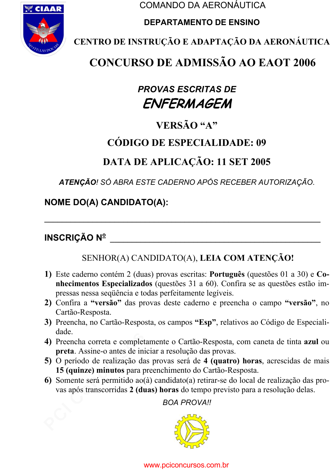pcimarkpci MDAwMDowMDAwOjAwMDA6MDAwMDowMDAwOmZmZmY6MzZlOTpjMjU5:TW9uLCAxMyBTZXAgMjAyMSAyMDo0NTo1NyAtMDMwMA== COMANDO DA AERONÁUTICA DEPARTAMENTO DE ENSINO CENTRO DE INSTRUÇÃO E ADAPTAÇÃO DA AERONÁUTICA CONCURSO DE ADMISSÃO AO EAOT 2006 PROVAS ESCRITAS DE ENFERMAGEM VERSÃO “A” CÓDIGO DE ESPECIALIDADE: 09 DATA DE APLICAÇÃO: 11 SET 2005 ATENÇÃO! SÓ ABRA ESTE CADERNO APÓS RECEBER AUTORIZAÇÃO. NOME DO(A) CANDIDATO(A): _______________________________________________________________ INSCRIÇÃO No ________________________________________________ SENHOR(A) CANDIDATO(A), LEIA COM ATENÇÃO! 1) Este caderno contém 2 (duas) provas escritas: Português (questões 01 a 30) e Co- nhecimentos Especializados (questões 31 a 60). Confira se as questões estão im- pressas nessa seqüência e todas perfeitamente legíveis. 2) Confira a “versão” das provas deste caderno e preencha o campo “versão”, no Cartão-Resposta. 3) Preencha, no Cartão-Resposta, os campos “Esp”, relativos ao Código de Especiali- dade. 4) Preencha correta e completamente o Cartão-Resposta, com caneta de tinta azul ou preta. Assine-o antes de iniciar a resolução das provas. 5) O período de realização das provas será de 4 (quatro) horas, acrescidas de mais 15 (quinze) minutos para preenchimento do Cartão-Resposta. 6) Somente será permitido ao(à) candidato(a) retirar-se do local de realização das pro- vas após transcorridas 2 (duas) horas do tempo previsto para a resolução delas. BOA PROVA!! www.pciconcursos.com.br pcimarkpci MDAwMDowMDAwOjAwMDA6MDAwMDowMDAwOmZmZmY6MzZlOTpjMjU5:TW9uLCAxMyBTZXAgMjAyMSAyMDo0NTo1NyAtMDMwMA== 2 Língua Portuguesa INSTRUÇÃO: As questões de 01 a 10 relacionam-se com o texto abaixo. Leia atenta- mente todo o texto antes de responder a elas. CEM ANOS DE EINSTEIN 5 10 15 O físico alemão Albert Einstein dispensa apresentações. Mesmo quem não compreende o que seja a teoria da relatividade reconhece o velhinho de cabeleira branca, olhos marotos e língua de fora. A famosa língua e a não menos famosa fórmula E = mc2 decoraram mais ca- misetas e pôsteres do que seria possível ima- ginar, considerando-se a complexidade do que representam. No ano que vem, completa-se um século desde o “ano milagroso” de Einstein, centená- rio que deve ser comemorado no mundo intei- ro. Em 1905, fora da Universidade, que era seu grande sonho, e ainda trabalhando como analista do escritório de patentes da Suíça, o jovem físico desenvolveu três de seus artigos seminais. Publicados no Annalen der Physik, apresentavam a teoria da relatividade espe-ci- al, o conceito dos quanta de luz e hipóteses 20 25 30 35 sobre a movimentação das moléculas. Além desses, escreveu mais dois artigos no mesmo ano. E, claro, continuou a escrevê-los. A equação E = mc2 surgiu em 1907, reformulada de um trabalho também do ano milagroso, e a teoria da relatividade geral foi apresentada em 1916. Cientistas já declararam 2005 o “Ano da Física”, resolução aceita pela ONU e que deve ser seguida por outras entidades. ..................................................................................................................................... Einstein não se limitava a elaborar hipóteses científicas. Era um homem do mundo. Gênio raro e preocupado com as questões de seu tempo, usou seu prestígio e influência para protestar contra o militarismo e pedir por justiça. Deixou marcas muito além dos limites da ciência, modificando também a história mundial. Ainda que indiretamente, foi um dos responsáveis pelo Projeto Manhattan e a conseqüente fabricação da bomba atômica. Revoltado, teria dito que, se soubesse que suas teo- rias causariam o terror que foi Hiroshima, teria preferido ser sapateiro. Transformou-se em ícone de cientista. Muito além dos traços caricatos, reco- nhecíveis pelos cabelos sempre em estado de choque, evoca a imagem do ser pro- fundamente imerso em suas hipóteses e elucubrações, sem deixar de lado a gentile- za e a atenção com o resto do mundo. KNAPP, Laura. Scientific American Brasil, ano 3, n. 29, out. 2004, p.5. (Texto adaptado) www.pciconcursos.com.br pcimarkpci MDAwMDowMDAwOjAwMDA6MDAwMDowMDAwOmZmZmY6MzZlOTpjMjU5:TW9uLCAxMyBTZXAgMjAyMSAyMDo0NTo1NyAtMDMwMA== 3 Questão 01 Considerando-se as informações do texto, é CORRETO afirmar que, em 2005, se come- mora o centenário A) da criação da famosa equação E = mc2. B) da entrada de Einstein numa Universidade. C) do chamado ano milagroso de Einstein. D) do nascimento do físico Einstein. Questão 02 Considerando-se as informações do texto, é CORRETO afirmar que Einstein A) era unicamente um elaborador de teorias. B) evitou envolver-se em questões sociais. C) publicava artigos científicos considerados valiosos. D) trabalhou sempre em instituições universitárias. Questão 03 “A famosa língua e a não menos famosa fórmula E = mc2 decoraram mais camisetas e pôsteres do que seria possível imaginar...” (linhas 5-8) Considerando-se as informações desse trecho, é CORRETO afirmar que Einstein e sua criação A) encarnavam a revolta popular. B) ilustravam uma corrente estética. C) representavam o poder jovem. D) se tornaram muito conhecidos. www.pciconcursos.com.br pcimarkpci MDAwMDowMDAwOjAwMDA6MDAwMDowMDAwOmZmZmY6MzZlOTpjMjU5:TW9uLCAxMyBTZXAgMjAyMSAyMDo0NTo1NyAtMDMwMA== 4 Questão 04 Considerando-se as informações do texto, é CORRETO afirmar que o Projeto Manhattan se relacionou com A) a criação do ano da Física. B) a fabricação da bomba atômica. C) o prestígio político de Einstein. D) o protesto contra injustiças. Questão 05 “... teria dito que, se soubesse que suas teorias causariam o terror que foi Hiroshima, teria preferido ser sapateiro.” (linhas 31-32) É CORRETO afirmar que, nesse trecho, Einstein é mostrado como um homem A) alienado. B) atento. C) inconformado. D) irredutível. Questão 06 “Transformou-se em ícone de cientista.” (linh