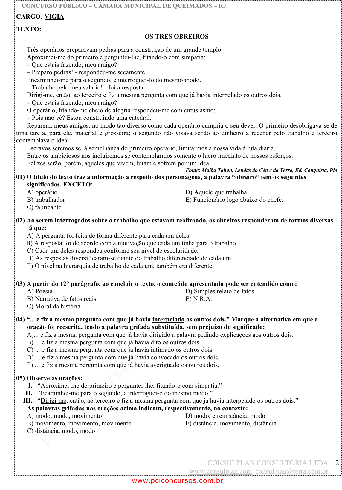 pcimarkpci MDAwMDowMDAwOjAwMDA6MDAwMDowMDAwOmZmZmY6MzZlOTpjMjU5:RnJpLCAxMCBTZXAgMjAyMSAxOTowNzozMCAtMDMwMA== CONCURSO PÚBLICO – CÂMARA MUNICIPAL DE QUEIMADOS – RJ CONSULPLAN CONSULTORIA LTDA www.consulplan.com consulplan@terra.com.br 2 CARGO: VIGIA TEXTO: OS TRÊS OBREIROS Três operários preparavam pedras para a construção de um grande templo. Aproximei-me do primeiro e perguntei-lhe, fitando-o com simpatia: – Que estais fazendo, meu amigo? – Preparo pedras! - respondeu-me secamente. Encaminhei-me para o segundo, e interroguei-lo do mesmo modo. – Trabalho pelo meu salário! - foi a resposta. Dirigi-me, então, ao terceiro e fiz a mesma pergunta com que já havia interpelado os outros dois. – Que estais fazendo, meu amigo? O operário, fitando-me cheio de alegria respondeu-me com entusiasmo: – Pois não vê? Estou construindo uma catedral. Reparem, meus amigos, no modo tão diverso como cada operário cumpria o seu dever. O primeiro desobrigava-se de uma tarefa, para ele, material e grosseira; o segundo não visava senão ao dinheiro a receber pelo trabalho e terceiro contemplava o ideal. Escravos seremos se, à semelhança do primeiro operário, limitarmos a nossa vida à luta diária. Entre os ambiciosos nos incluiremos se contemplarmos somente o lucro imediato de nossos esforços. Felizes serão, porém, aqueles que vivem, lutam e sofrem por um ideal. Fonte: Malba Tahan, Lendas do Céu e da Terra, Ed. Conquista, Rio 01) O título do texto traz a informação a respeito dos personagens, a palavra “obreiro” tem os seguintes significados, EXCETO: A) operário D) Aquele que trabalha. B) trabalhador E) Funcionário logo abaixo do chefe. C) fabricante 02) Ao serem interrogados sobre o trabalho que estavam realizando, os obreiros responderam de formas diversas já que: A) A pergunta foi feita de forma diferente para cada um deles. B) A resposta foi de acordo com a motivação que cada um tinha para o trabalho. C) Cada um deles respondeu conforme seu nível de escolaridade. D) As respostas diversificaram-se diante do trabalho diferenciado de cada um. E) O nível na hierarquia de trabalho de cada um, também era diferente. 03) A partir do 12° parágrafo, ao concluir o texto, o conteúdo apresentado pode ser entendido como: A) Poesia D) Simples relato de fatos. B) Narrativa de fatos reais. E) N.R.A. C) Moral da história. 04) “... e fiz a mesma pergunta com que já havia interpelado os outros dois.” Marque a alternativa em que a oração foi reescrita, tendo a palavra grifada substituída, sem prejuízo do significado: A)... e fiz a mesma pergunta com que já havia dirigido a palavra pedindo explicações aos outros dois. B) ... e fiz a mesma pergunta com que já havia dito os outros dois. C) ... e fiz a mesma pergunta com que já havia intimado os outros dois. D) ... e fiz a mesma pergunta com que já havia convocado os outros dois. E) ... e fiz a mesma pergunta com que já havia averigüado os outros dois. 05) Observe as orações: I. “Aproximei-me do primeiro e perguntei-lhe, fitando-o com simpatia.” II. “Ecaminhei-me para o segundo, e interroguei-o do mesmo modo.” III. “Dirigi-me, então, ao terceiro e fiz a mesma pergunta com que já havia interpelado os outros dois.” As palavras grifadas nas orações acima indicam, respectivamente, no contexto: A) modo, modo, movimento D) modo, circunstância, modo B) movimento, movimento, movimento E) distância, movimento, distância C) distância, modo, modo www.pciconcursos.com.br pcimarkpci MDAwMDowMDAwOjAwMDA6MDAwMDowMDAwOmZmZmY6MzZlOTpjMjU5:RnJpLCAxMCBTZXAgMjAyMSAxOTowNzozMCAtMDMwMA== CONCURSO PÚBLICO – CÂMARA MUNICIPAL DE QUEIMADOS – RJ CONSULPLAN CONSULTORIA LTDA www.consulplan.com consulplan@terra.com.br 3 06) “Escravos seremos se, à semelhança do primeiro operário, limitarmos a nossa vida à luta diária.” A respeito desta afirmação do autor, é CORRETO dizer: A) A luta diária pela sobrevivência é importante contudo, é preciso realizar trabalhos variados para não cair na monotonia do cotidiano. B) As pessoas devem ter prioridades na vida, sendo assim, o lazer deve estar em primeiro lugar para que ninguém se torne escravo do trabalho. C) Quanto mais disciplinado é um operário, maior produção ele atinge. D) Todo trabalho deve ser feito tendo-se em vista um ideal e não apenas ser feito mecanicamente. E) Todo cidadão tem direito a um trabalho digno. 07) Sabe-se que são acentuadas as palavras paroxítonas terminadas em ditongo. Marque a opção que apresenta a palavra que está CORRETAMENTE acentuada por este motivo: A) três B) operário C) já D) vê E) porém 08) As palavras que estão na forma do diminutivo transmitem a idéia de pequenez. Todas as palavras abaixo têm esta idéia. EXCETO: A) cozinha B) cafezinho C) bonezinho D) operariozinho E) vovozinha 09) As palavras que possuem a mesma raiz pertencem à mesma família. Com esta informação, assinale a palavra em que a ortografia está INCORRETA: A) crescer B) decrescer C) crescimento D) crescido E) cresça 10) A pontuação referente às palavras que indicam estados de alma, sentimentos e emoções súbitos; está CORRETA em: A) – Ora, não precisa disfarçar! D) – Você é um ótimo funcionário, parabéns?! B) – Puxa, que coisa estranha. E) – Rua. Você desrespeitou o chefe. C) – Ué, eu não posso trabalhar amanhã, 11) Abaixo estão pares de frases. Assinale a alternativa onde a palavra grifada na frase I foi substituída por seu antônimo correto na frase II. A) I – A maior parte dos operários luta com dificuldades. II – A pequena parte dos operários luta com dificuldades. B) I – Vem chegando um novo ano, é tempo de começar . II – Vem chegando um novo ano, é tempo de renovar . C) I – Como gostava de trabalhar! II – Como detestava trabalhar! D) I – Nenhum trabalho lhe parecia melhor. II – Nenhum trabalho lhe parecia inferior . E) I – Na construção, eles estavam sempre em movimento. I
