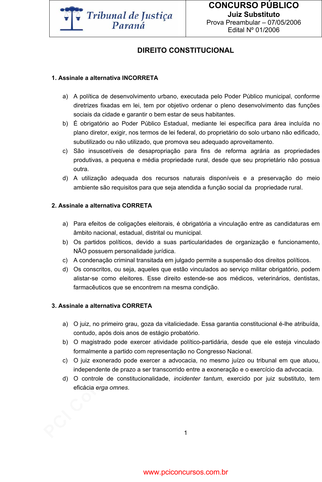 pcimarkpci MDAwMDowMDAwOjAwMDA6MDAwMDowMDAwOmZmZmY6MzZlOTpjMjU5:V2VkLCAxNSBTZXAgMjAyMSAwNToyMDoxNSAtMDMwMA== CONCURSO PÚBLICO Juiz Substituto Prova Preambular – 07/05/2006 Edital Nº 01/2006 1 DIREITO CONSTITUCIONAL 1. Assinale a alternativa INCORRETA a) A política de desenvolvimento urbano, executada pelo Poder Público municipal, conforme diretrizes fixadas em lei, tem por objetivo ordenar o pleno desenvolvimento das funções sociais da cidade e garantir o bem estar de seus habitantes. b) É obrigatório ao Poder Público Estadual, mediante lei específica para área incluída no plano diretor, exigir, nos termos de lei federal, do proprietário do solo urbano não edificado, subutilizado ou não utilizado, que promova seu adequado aproveitamento. c) São insuscetíveis de desapropriação para fins de reforma agrária as propriedades produtivas, a pequena e média propriedade rural, desde que seu proprietário não possua outra. d) A utilização adequada dos recursos naturais disponíveis e a preservação do meio ambiente são requisitos para que seja atendida a função social da propriedade rural. 2. Assinale a alternativa CORRETA a) Para efeitos de coligações eleitorais, é obrigatória a vinculação entre as candidaturas em âmbito nacional, estadual, distrital ou municipal. b) Os partidos políticos, devido a suas particularidades de organização e funcionamento, NÃO possuem personalidade jurídica. c) A condenação criminal transitada em julgado permite a suspensão dos direitos políticos. d) Os conscritos, ou seja, aqueles que estão vinculados ao serviço militar obrigatório, podem alistar-se como eleitores. Esse direito estende-se aos médicos, veterinários, dentistas, farmacêuticos que se encontrem na mesma condição. 3. Assinale a alternativa CORRETA a) O juiz, no primeiro grau, goza da vitaliciedade. Essa garantia constitucional é-lhe atribuída, contudo, após dois anos de estágio probatório. b) O magistrado pode exercer atividade político-partidária, desde que ele esteja vinculado formalmente a partido com representação no Congresso Nacional. c) O juiz exonerado pode exercer a advocacia, no mesmo juízo ou tribunal em que atuou, independente de prazo a ser transcorrido entre a exoneração e o exercício da advocacia. d) O controle de constitucionalidade, incidenter tantum, exercido por juiz substituto, tem eficácia erga omnes. www.pciconcursos.com.br pcimarkpci MDAwMDowMDAwOjAwMDA6MDAwMDowMDAwOmZmZmY6MzZlOTpjMjU5:V2VkLCAxNSBTZXAgMjAyMSAwNToyMDoxNSAtMDMwMA== CONCURSO PÚBLICO Juiz Substituto Prova Preambular – 07/05/2006 Edital Nº 01/2006 2 4. Assinale a alternativa CORRETA a) A súmula vinculante – aprovada mediante dois terços dos membros do STF, reiteradas as discussões sobre a matéria constitucional, e publicada na imprensa oficial – poderá ter o seu cancelamento provocado por entidade de classe de âmbito nacional. b) NÃO cabe reclamação ao STF, na hipótese de ato administrativo ou decisão judicial, contrariar súmula vinculante elaborada e publicada de acordo com a designação constitucional. c) Há prejuízo à competência disciplinar e correicional dos Tribunais, na hipótese de o Conselho Nacional de Justiça avocar processos disciplinares em curso, determinar a remoção, a disponibilidade ou a aposentadoria de membros do poder judiciário, ainda que assegurada a ampla defesa. d) A composição híbrida do Conselho Nacional de Justiça determina que o julgamento de seus membros, na hipótese de crime de responsabilidade, dependerá do cargo de origem. Dessa forma, o Juiz estadual, no exercício das competências do CNJ, será julgado por Tribunal de Justiça. 5. Assinale a alternativa INCORRETA a) O Congresso Nacional, quando deixa de converter medida provisória em lei, exerce controle de constitucionalidade sobre ato normativo do chefe do poder executivo, mediante pressupostos constitucionais formais e materiais. b) Na hipótese de o STF julgar inconstitucional uma medida provisória que trate de matéria penal em sede de Ação Declaratória de Inconstitucionalidade, o Congresso Nacional pode elaborar Lei Complementar que trate da mesma matéria contida na referida medida provisória. c) Os Estados podem legislar sobre direito civil, em questões específicas, desde que Lei Complementar Federal, editada pelo Congresso Nacional e aprovada por maioria absoluta, autorize. d) Governador de Estado NÃO pode propor iniciativa de Lei estadual que crie cargos, funções ou empregos públicos, na administração direta ou autárquica, ou o aumento de sua remuneração, visto que essa competência é privativa do Presidente da República. 6. Dispõe o artigo 5º, VIII, da Constituição Federal, que “ninguém será privado de direitos por motivo de crença religiosa ou de convicção filosófica ou política, salvo se as invocar para eximir-se de obrigação legal a todos imposta e recusar-se a cumprir prestação alternativa, fixada em lei”. Esse dispositivo configura: a) norma constitucional de eficácia plena e aplicabilidade imediata; b) norma constitucional de eficácia contida e aplicabilidade imediata; c) norma programática da Constituição Federal de aplicabilidade mediata; d) norma constitucional de eficácia limitada e aplicabilidade imediata. www.pciconcursos.com.br pcimarkpci MDAwMDowMDAwOjAwMDA6MDAwMDowMDAwOmZmZmY6MzZlOTpjMjU5:V2VkLCAxNSBTZXAgMjAyMSAwNToyMDoxNSAtMDMwMA== CONCURSO PÚBLICO Juiz Substituto Prova Preambular – 07/05/2006 Edital Nº 01/2006 3 7. Assinale a alternativa INCORRETA a) A interpretação conforme a Constituição, com ou sem redução de texto, proferida pelo Supremo Tribunal Federal, tem efeito vinculante e eficácia contra todos. b) Interpretação conforme a Constituição é uma técnica de controle de constitucionalidade que encontra o limite de sua utilização, no âmbito das possibilidades hermenêuticas de extrair do texto uma significação normativa harmônica com a Cons