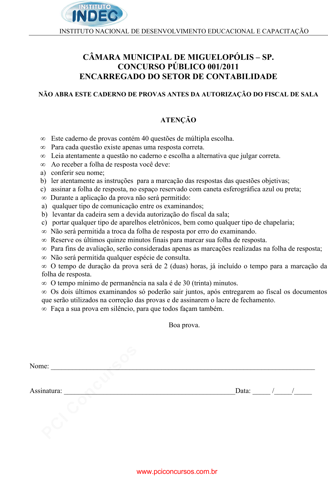pcimarkpci MDAwMDowMDAwOjAwMDA6MDAwMDowMDAwOmZmZmY6MzZlOTpjMjU5:V2VkLCAxNSBTZXAgMjAyMSAxMDozNjowNiAtMDMwMA== INSTITUTO NACIONAL DE DESENVOLVIMENTO EDUCACIONAL E CAPACITAÇÃO CÂMARA MUNICIPAL DE MIGUELOPÓLIS – SP. CONCURSO PÚBLICO 001/2011 ENCARREGADO DO SETOR DE CONTABILIDADE NÃO ABRA ESTE CADERNO DE PROVAS ANTES DA AUTORIZAÇÃ O DO FISCAL DE SALA ATENÇÃO • Este caderno de provas contém 40 questões de múltipla escolha. • Para cada questão existe apenas uma resposta correta. • Leia atentamente a questão no caderno e escolha a alternativa que julgar correta. • Ao receber a folha de resposta você deve: a) conferir seu nome; b) ler atentamente as instruções para a marcação das respostas das questões objetivas; c) assinar a folha de resposta, no espaço reservado com caneta esferográfica azul ou preta; • Durante a aplicação da prova não será permitido: a) qualquer tipo de comunicação entre os examinandos; b) levantar da cadeira sem a devida autorização do fiscal da sala; c) portar qualquer tipo de aparelhos eletrônicos, bem como qualquer tipo de chapelaria; • Não será permitida a troca da folha de resposta por erro do examinando. • Reserve os últimos quinze minutos finais para marcar sua folha de resposta. • Para fins de avaliação, serão consideradas apenas as marcações realizadas na folha de resposta; • Não será permitida qualquer espécie de consulta. • O tempo de duração da prova será de 2 (duas) horas, já incluído o tempo para a marcação da folha de resposta. • O tempo mínimo de permanência na sala é de 30 (trinta) minutos. • Os dois últimos examinandos só poderão sair juntos, após entregarem ao fiscal os documentos que serão utilizados na correção das provas e de assinarem o lacre de fechamento. • Faça a sua prova em silêncio, para que todos façam também. Boa prova. Nome: __________________________________________________________________________ Assinatura: ________________________________________________Data: _____ /_____/_____ www.pciconcursos.com.br pcimarkpci MDAwMDowMDAwOjAwMDA6MDAwMDowMDAwOmZmZmY6MzZlOTpjMjU5:V2VkLCAxNSBTZXAgMjAyMSAxMDozNjowNiAtMDMwMA== ENCARREGADO DO SETOR DE CONTABILIDADE PORTUGUÊS 01. Indique a única alternativa a seguir, em que a palavra presente deve ser completada corretamente com a letra “Z”. a) ( ) avi....ar c) ( ) setori....ar b) ( ) anali...ar d) ( ) improvi....ar 02. Muitas palavras da Língua Portuguesa, em certos momentos nos geram algumas dúvidas quanto ao seu significado e muitas vezes cometemos algum erro na escrita dessas palavras. Em apenas uma das alternativas a seguir, na oração presente, há uma palavra com erro de grafia. Aponte tal alternativa: a) ( ) Fomos a um jantar beneficiente, ontem à noite. b) ( ) As ruas por que passamos estavam sujas. c) ( ) Não reagi à provocação, porque tenho bom senso. d) ( ) O mal que Ana nos causou foi imenso. 03. Nas alternativas abaixo, apenas uma, das palavras presentes, deve ser acentuada graficamente. Aponte a palavra que contém acento gráfico: a) ( ) refens c) ( ) item b) ( ) jovens d) ( ) sutil 04. A palavra: “anormalidade” é formada por um processo denominado: a) ( ) Derivação parassintética. c) ( ) Derivação prefixal. b) ( ) Derivação prefixal e sufixal. d) ( ) Derivação sufixal. 05. Aponte a alternativa em que a oração apresenta a flexão do substantivo composto flexionado incorretamente: a) ( ) Às quartas-feiras sempre há feira livre. b) ( ) Havia na festa pés-de-moleque deliciosos. c) ( ) Giravam tristes e vazias as roda-gigantes do parque. d) ( ) Sempre-vivas enfeitavam o jardim do casarão. 06. Leia atentamente o seguinte fragmento de texto da obra de Guimarães Rosa: “O polvo se embrenha em seu despenteado: desmedusa-se. O polvo aos pulos: negregado, o oitopatas, seus olinhos imensamente defensivos, sua barriga muito movemente.” Percebemos que o autor, em sua peculiar linguagem, fez uso de um texto: a) ( ) Narrativo c) ( ) Argumentativo b) ( ) Descritivo d) ( ) Dissertativo 07. No período: “Mariana se indignou com a presença de Hilário, porém manteve a sua classe”. A oração em destaque no período classifica-se como oração: a) ( ) Coordenada assindética c) ( ) Coordenada sindética conclusiva b) ( ) Coordenada sindética aditiva d) ( ) Coordenada sindética adversativa 08. No período: “Se faltarem à minha festa de casamento, vocês se haverão comigo!” O verbo haver em destaque no período possui o significado de: a) ( ) julgar c) ( ) ajustar contas b) ( ) agir d) ( ) existir 09. Nas alternativas a seguir há um período em que a Concordância Verbal está inadequada quanto às regras gramaticais. Indique a alternativa em que se encontra tal período: a) ( ) Os jogos da seleção começará todos ao meio-dia. b) ( ) Não houve meios de fazê-la mudar de idéia. c) ( ) Amanhã fará onze anos que me casei. d) ( ) Amanhã iremos a uma comemoração na Câmara Municipal. www.pciconcursos.com.br pcimarkpci MDAwMDowMDAwOjAwMDA6MDAwMDowMDAwOmZmZmY6MzZlOTpjMjU5:V2VkLCAxNSBTZXAgMjAyMSAxMDozNjowNiAtMDMwMA== 10. Nas alternativas a seguir há um período em que a Regência Verbal está inadequada quanto às regras gramaticais. Indique a alternativa em que se encontra tal período: a) ( ) Todo nós aspiramos a um futuro melhor. b) ( ) O prêmio não agradou o melhor aluno da classe. c) ( ) Eu me lembro muito bem do fato. d) ( ) O direito de votar assiste ao povo. MATEMÁTICA 11. As coordenadas do ponto mínimo da função de 2o grau f(x) = x2 – 4x são: a) ( ) (-2,-4) b) ( ) (2,-4) c) ( ) (3,4) d) ( ) (1,-4) 12. Considere os seguintes conjuntos numéricos: A = 90 elementos B = 50 elementos A B = 30 elementos Portanto o conjunto A ∪ B contém: a) ( ) 100 elementos b) ( ) 110 elementos c) ( ) 170 elementos d) ( ) 80 elementos 13. O resultado da racionalização do denominador da fração é: a) ( ) 1 - b) ( ) c) ( ) 2 d) ( ) - 3 - 2 14. Considerando o gráfico da 