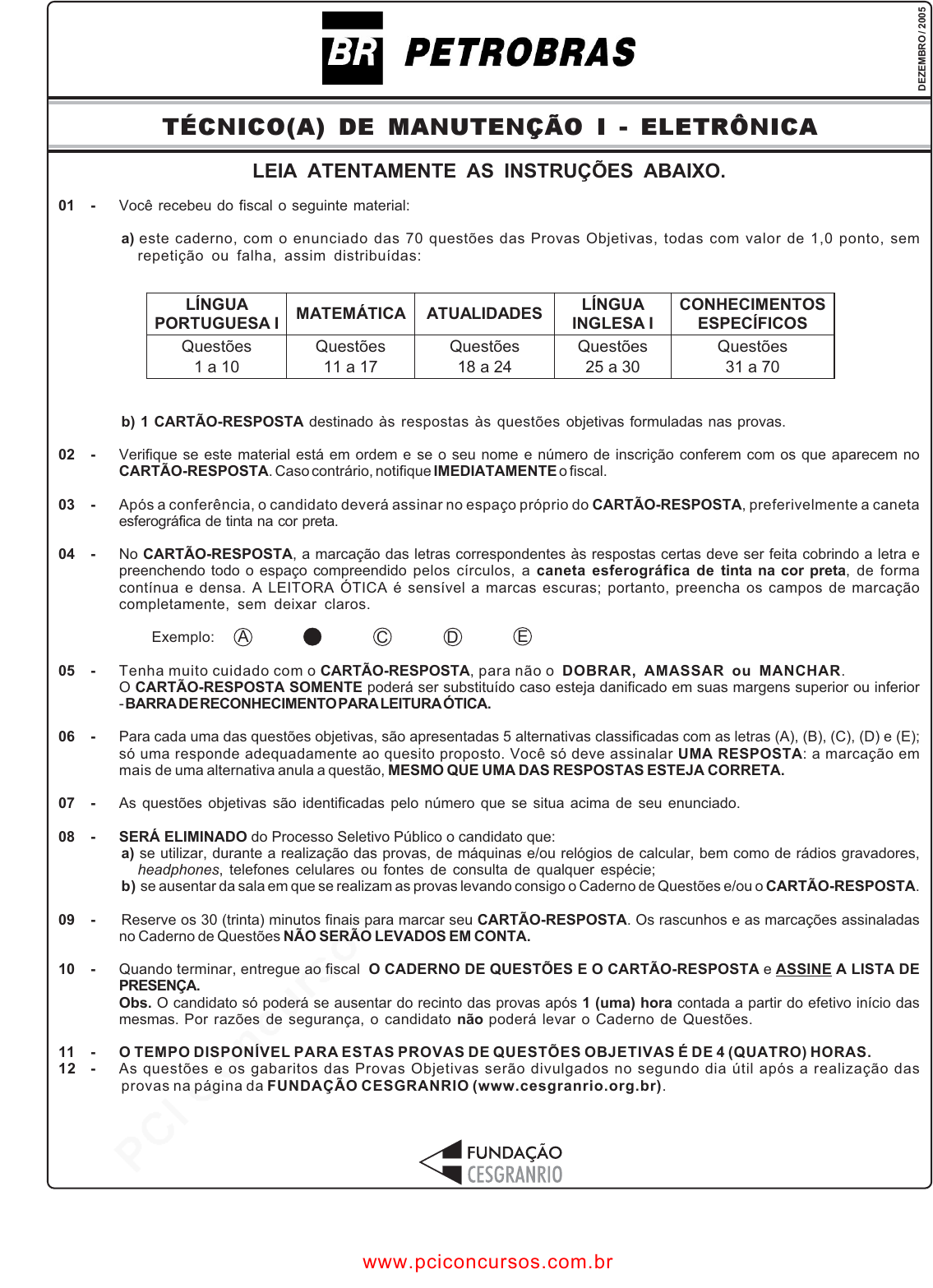 pcimarkpci MDAwMDowMDAwOjAwMDA6MDAwMDowMDAwOmZmZmY6MzZlOTpjMjU5:U2F0LCAxMSBTZXAgMjAyMSAwNToyMToyNCAtMDMwMA== LÍNGUA PORTUGUESA I MATEMÁTICA ATUALIDADES LÍNGUA INGLESA I CONHECIMENTOS ESPECÍFICOS Questões 1 a 10 Questões 11 a 17 Questões 18 a 24 Questões 25 a 30 Questões 31 a 70 TÉCNICO(A) DE MANUTENÇÃO I - ELETRÔNICA D E Z E M B R O / 20 05 LEIA ATENTAMENTE AS INSTRUÇÕES ABAIXO. 01 - Você recebeu do fiscal o seguinte material: a) este caderno, com o enunciado das 70 questões das Provas Objetivas, todas com valor de 1,0 ponto, sem repetição ou falha, assim distribuídas: b) 1 CARTÃO-RESPOSTA destinado às respostas às questões objetivas formuladas nas provas. 02 - Verifique se este material está em ordem e se o seu nome e número de inscrição conferem com os que aparecem no CARTÃO-RESPOSTA. Caso contrário, notifique IMEDIATAMENTE o fiscal. 03 - Após a conferência, o candidato deverá assinar no espaço próprio do CARTÃO-RESPOSTA, preferivelmente a caneta esferográfica de tinta na cor preta. 04 - No CARTÃO-RESPOSTA, a marcação das letras correspondentes às respostas certas deve ser feita cobrindo a letra e preenchendo todo o espaço compreendido pelos círculos, a caneta esferográfica de tinta na cor preta, de forma contínua e densa. A LEITORA ÓTICA é sensível a marcas escuras; portanto, preencha os campos de marcação completamente, sem deixar claros. Exemplo: 05 - Tenha muito cuidado com o CARTÃO-RESPOSTA, para não o DOBRAR, AMASSAR ou MANCHAR. O CARTÃO-RESPOSTA SOMENTE poderá ser substituído caso esteja danificado em suas margens superior ou inferior -BARRA DE RECONHECIMENTO PARA LEITURA ÓTICA. 06 - Para cada uma das questões objetivas, são apresentadas 5 alternativas classificadas com as letras (A), (B), (C), (D) e (E); só uma responde adequadamente ao quesito proposto. Você só deve assinalar UMA RESPOSTA: a marcação em mais de uma alternativa anula a questão, MESMO QUE UMA DAS RESPOSTAS ESTEJA CORRETA. 07 - As questões objetivas são identificadas pelo número que se situa acima de seu enunciado. 08 - SERÁ ELIMINADO do Processo Seletivo Público o candidato que: a) se utilizar, durante a realização das provas, de máquinas e/ou relógios de calcular, bem como de rádios gravadores, headphones, telefones celulares ou fontes de consulta de qualquer espécie; b) se ausentar da sala em que se realizam as provas levando consigo o Caderno de Questões e/ou o CARTÃO-RESPOSTA. 09 - Reserve os 30 (trinta) minutos finais para marcar seu CARTÃO-RESPOSTA. Os rascunhos e as marcações assinaladas no Caderno de Questões NÃO SERÃO LEVADOS EM CONTA. 10 - Quando terminar, entregue ao fiscal O CADERNO DE QUESTÕES E O CARTÃO-RESPOSTA e ASSINE A LISTA DE PRESENÇA. Obs. O candidato só poderá se ausentar do recinto das provas após 1 (uma) hora contada a partir do efetivo início das mesmas. Por razões de segurança, o candidato não poderá levar o Caderno de Questões. 11 - O TEMPO DISPONÍVEL PARA ESTAS PROVAS DE QUESTÕES OBJETIVAS É DE 4 (QUATRO) HORAS. 12 - As questões e os gabaritos das Provas Objetivas serão divulgados no segundo dia útil após a realização das provas na página da FUNDAÇÃO CESGRANRIO (www.cesgranrio.org.br). A C D E www.pciconcursos.com.br pcimarkpci MDAwMDowMDAwOjAwMDA6MDAwMDowMDAwOmZmZmY6MzZlOTpjMjU5:U2F0LCAxMSBTZXAgMjAyMSAwNToyMToyNCAtMDMwMA== TÉCNICO(A) DE MANUTENÇÃO I - ELETRÔNICA 2 LÍNGUA PORTUGUESA I Eleições pelo computador Em 2004, os cidadãos de Miraflores, na região metropolitana de Lima, no Peru, elegeram os represen- tantes locais pela web. Os eleitores faziam um registro na prefeitura e recebiam um endereço eletrônico e uma senha, que permitia votar uma única vez. Quem tinha computador pôde votar de casa. Quem não tinha podia usar cabines instaladas em ruas, parques e outros espa- ços públicos. A experiência deu certo e foi repetida em outra eleição este ano. [...] A cidade não foi pioneira por acaso. É 100% wireless. Oferece acesso gratuito à internet sem fio a seus 90.000 habitantes. Além de votarem on- line, os miraflorinos têm à disposição uma série de servi- ços. Podem, por exemplo, solicitar documentos de iden- tidade pela internet ou assistir ao vivo a concertos musi- cais e casamentos. Miraflores é um bom exemplo, mas não o único, de como as novas tecnologias podem ampliar o acesso da população à cidadania. [...] O uso da internet para a rea- lização de eleições desperta interesse na Europa há al- gum tempo. O Brasil, que desde a década de 90 possui um siste- ma de votação eletrônica, não está alheio a essas pes- quisas. No ano passado, um projeto batizado de Eleição Eletrônica do Futuro foi testado em Florianópolis. Trata- se de um possível embrião do que seria a votação pela internet no país. A identidade do eleitor seria conferida pelo uso de cartões inteligentes – que substituiriam o título eleitoral – e de leitores de impressões digitais. [...] Votações pela internet não são a única forma de de- mocracia digital. A disseminação da rede já impulsiona a cidadania de outras maneiras – seja por um acesso mais transparente aos números da administração pública, seja pelo fenômeno dos blogs, que na China se tornaram saí- da para driblar o controle da informação pelo governo co- munista. [...] Ao democratizar o acesso ao conhecimento, a web se torna aliada na luta pela igualdade social. “A televisão foi um fenômeno que levou informações a populações ca- rentes que de outra forma nunca teriam acesso a elas. O potencial da internet é ainda maior”, afirma uma repre- sentante da força-tarefa da Organização das Nações Unidas para tecnologias de comunicação. O motivo é sim- ples. Na internet, diferentemente da televisão, o usuário não é um mero espectador passivo. Pode procurar a in- formação que deseja e difundir suas opiniões. Um estudo feito num cibercafé gratuito da Favela da Roci