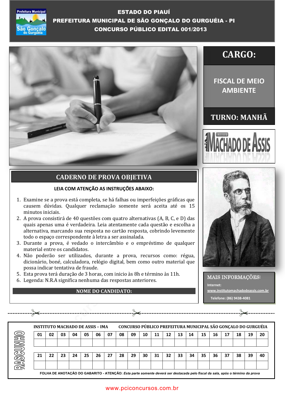 pcimarkpci MDAwMDowMDAwOjAwMDA6MDAwMDowMDAwOmZmZmY6MzZlOTpjMjU5:VGh1LCAxNiBTZXAgMjAyMSAwMzo0MjoxOCAtMDMwMA== INSTITUTO MACHADO DE ASSIS – IMA CONCURSO PÚBLICO PREFEITURA MUNICIPAL SÃO GONÇALO DO GURGUÉIA . 01 02 03 04 05 06 07 08 09 10 11 12 13 14 15 16 17 18 19 20 21 22 23 24 25 26 27 28 29 30 31 32 33 34 35 36 37 38 39 40 MAIS INFORMAÇÕES: Internet: www.institutomachadodeassis.com.br Telefone: (86) 9438-4081 ESTADO DO PIAUÍ PREFEITURA MUNICIPAL DE SÃO GONÇALO DO GURGUÉIA - PI CONCURSO PÚBLICO EDITAL 001/2013 CARGO: FISCAL DE MEIO AMBIENTE TURNO: MANHÃ LEIA COM ATENÇÃO AS INSTRUÇÕES ABAIXO: 1. Examine se a prova está completa, se há falhas ou imperfeições gráficas que causem dúvidas. Qualquer reclamação somente será aceita até os 15 minutos iniciais. 2. A prova consistirá de 40 questões com quatro alternativas (A, B, C, e D) das quais apenas uma é verdadeira. Leia atentamente cada questão e escolha a alternativa, marcando sua resposta no cartão resposta, cobrindo levemente todo o espaço correspondente à letra a ser assinalada. 3. Durante a prova, é vedado o intercâmbio e o empréstimo de qualquer material entre os candidatos. 4. Não poderão ser utilizados, durante a prova, recursos como: régua, dicionário, boné, calculadora, relógio digital, bem como outro material que possa indicar tentativa de fraude. 5. Esta prova terá duração de 3 horas, com inicio às 8h e término às 11h. 6. Legenda: N.R.A significa nenhuma das respostas anteriores. NOME DO CANDIDATO: _____________________________________________________________________________ CADERNO DE PROVA OBJETIVA FOLHA DE ANOTAÇÃO DO GABARITO - ATENÇÃO: Esta parte somente deverá ser destacada pelo fiscal da sala, após o término da prova www.pciconcursos.com.br pcimarkpci MDAwMDowMDAwOjAwMDA6MDAwMDowMDAwOmZmZmY6MzZlOTpjMjU5:VGh1LCAxNiBTZXAgMjAyMSAwMzo0MjoxOCAtMDMwMA== In st it u to M a ch a d o d e A ss is PREFEITURA MUNICIPAL DE SÃO GONÇALO DO GURGUÉIA - PI Cargo: Fiscal de Meio Ambiente LÍNGUA PORTUGUESA QUESTÕES DE 1 A 14 INSTRUÇÃO: Para responder a essas questões, assinale APENAS UMA ÚNICA alternativa correta e marque o número correspondente na Folha de Respostas. TEXTO I Decadência Iguais às linhas perpendiculares Caíram, como cruéis e hórridas hastas, Nas suas 33 vértebras gastas Quase todas as pedras tumulares! A frialdade dos círculos polares, Em sucessivas atuações nefastas, Penetrara-lhe os próprios neuroplastas, Estragara-lhe os centros medulares! Como quem quebra o objeto mais querido E começa a apanhar piedosamente Todas as microscópicas partículas, Ele hoje vê que, após tudo perdido, Só lhe restam agora o último dente E a armação funerária das clavículas! Augusto dos Anjos. Eu e outras poesias. Com relação à organização semântica do texto 01, assinale a alternativa correta quanto às ideias apresentadas: A) Infere-se do poema um tom sombrio e pessimista por parte do autor, pois ao se descrever num estado degradante, revela trechos mortificantes. B) O poeta revela o medo de morrer que aflige a humanidade, e o faz por meio de uma descrição de um corpo decadente. C) Pela organização semântica, pode-se afirmar que o poema foi dividido em duas partes, sendo as duas primeiras estrofes centradas no passado e as duas últimas no presente. D) Embora o poema seja de caráter lúgubre, percebe-se certa esperança para a pessoa descrita nos versos acima, conforme se verifica na última estrofe, em que se diz que após tudo perdido, ao menos restam o dente e a armação das clavículas. Ainda com relação ao texto I – o poema Decadência - assinale a única alternativa que analisa corretamente os aspectos gramaticais: A) Na construção “Iguais às linhas perpendiculares”, a crase deve-se à regência nominal da palavra “Iguais”, e introduz o complemento nominal, que sempre deve ser regido por preposição. B) O sujeito do verbo “Caíram” – na primeira estrofe – é “linhas”, sendo, portanto , classificado como sujeito simples. C) O termo destacado em “A frialdade dos círculos polares” não possui a mesma função sintática que o termo destacado em “pedras tumulares”. D) A expressão “Nas suas 33 vértebras gastas” exerce função sintática de adjunto adnominal. No trecho “Hoje você prometeu consertar o telhado, capinar o jardim, cortar lenha, construir um galpão e limpar o curral...”, a sequência “capinar o jardim, cortar lenha, construir um galpão...” é formada por orações: A) coordenadas sindéticas explicativas B) subordinadas adjetivas explicativas C) coordenadas sindéticas aditivas D) coordenadas assindéticas QUESTÃO 01 QUESTÃO 02 QUESTÃO 03 www.pciconcursos.com.br pcimarkpci MDAwMDowMDAwOjAwMDA6MDAwMDowMDAwOmZmZmY6MzZlOTpjMjU5:VGh1LCAxNiBTZXAgMjAyMSAwMzo0MjoxOCAtMDMwMA== In st it u to M a ch a d o d e A ss is PREFEITURA MUNICIPAL DE SÃO GONÇALO DO GURGUÉIA - PI Cargo: Fiscal de Meio Ambiente TEXTO II BRASILEIROS E BRASILIANOS Por 500 anos mentiram para nós. Esconderam um dado muito importante sobre o Brasil. Disseram-nos que éramos brasileiros. Que éramos cidadãos brasileiros, que deveríamos ajudar os outros, pagando impostos sem reclamar nem esperar muito em troca. Esconderam todo esse tempo o fato de que o termo brasileiro não é sinônimo de cidadania, e sim o nome de uma profissão. Brasileiro rima com padeiro, pedreiro, ferreiro. Brasileiro era a profissão daqueles portugueses que viajavam para o Brasil, ficavam alguns meses e voltavam com ouro, prata e pau- brasil, tiravam tudo o que podiam, sem nada deixar em troca. Brasileiros não vêem o Brasil como uma nação, mas uma terra a ser explorada, o mais rápido possível. Investir no país é considerado uma burrice; constituir uma família e mantê-la saudável, um atraso de vida. São esses brasileiros que viraram os bandidos e salafrários de hoje, que sonham com uma boquinha pública ou privada, que só querem tir