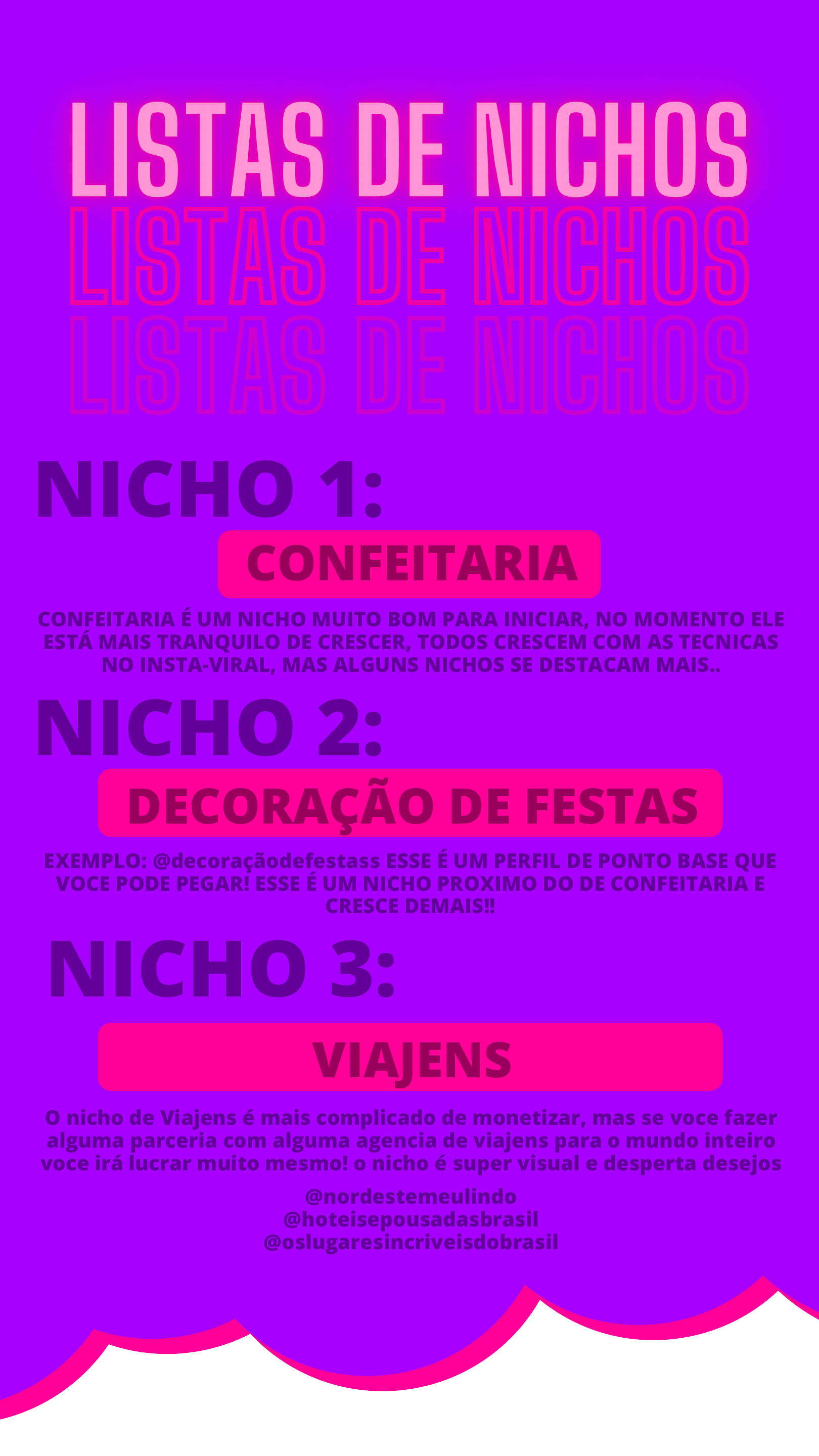 LISTAS DE NICHOSLISTAS DE NICHOS LISTAS DE NICHOSLISTAS DE NICHOS NICHO 1:NICHO 1: CONFEITARIACONFEITARIA CONFEITARIA É UM NICHO MUITO BOM PARA INICIAR, NO MOMENTO ELECONFEITARIA É UM NICHO MUITO BOM PARA INICIAR, NO MOMENTO ELE ESTÁ MAIS TRANQUILO DE CRESCER, TODOS CRESCEM COM AS TECNICASESTÁ MAIS TRANQUILO DE CRESCER, TODOS CRESCEM COM AS TECNICAS NO INSTA-VIRAL, MAS ALGUNS NICHOS SE DESTACAM MAIS..NO INSTA-VIRAL, MAS ALGUNS NICHOS SE DESTACAM MAIS.. NICHO 2:NICHO 2: DECORAÇÃO DE FESTASDECORAÇÃO DE FESTAS EXEMPLO: @decoraçãodefestass ESSE É UM PERFIL DE PONTO BASE QUEEXEMPLO: @decoraçãodefestass ESSE É UM PERFIL DE PONTO BASE QUE VOCE PODE PEGAR! ESSE É UM NICHO PROXIMO DO DE CONFEITARIA EVOCE PODE PEGAR! ESSE É UM NICHO PROXIMO DO DE CONFEITARIA E CRESCE DEMAIS!!CRESCE DEMAIS!! VIAJENSVIAJENS NICHO 3:NICHO 3: O nicho de Viajens é mais complicado de monetizar, mas se voce fazerO nicho de Viajens é mais complicado de monetizar, mas se voce fazer alguma parceria com alguma agencia de viajens para o mundo inteiroalguma parceria com alguma agencia de viajens para o mundo inteiro voce irá lucrar muito mesmo! o nicho é super visual e desperta desejosvoce irá lucrar muito mesmo! o nicho é super visual e desperta desejos @nordestemeulindo@nordestemeulindo @hoteisepousadasbrasil@hoteisepousadasbrasil @oslugaresincriveisdobrasil@oslugaresincriveisdobrasil CROCHE, UNHAS, MAQUIAGENSCROCHE, UNHAS, MAQUIAGENS NICHO 4:NICHO 4: ESSES NICHOS SÃO OTIMOS TAMBEM, SUPER VISUAIS COM AS TECNICASESSES NICHOS SÃO OTIMOS TAMBEM, SUPER VISUAIS COM AS TECNICAS VOCE CONSEGUE CRESCER RAPIDO SIM, E ESSES NICHOS SÃO FACEIS DEVOCE CONSEGUE CRESCER RAPIDO SIM, E ESSES NICHOS SÃO FACEIS DE FAZER SUAS PRIMEIRAS VENDAS COMO AFILIADO TAMBEM, EU FATURAVAFAZER SUAS PRIMEIRAS VENDAS COMO AFILIADO TAMBEM, EU FATURAVA 1400 REAIS POR MES COM UM INSTAGRAM DO NICHO DE UNHAS.1400 REAIS POR MES COM UM INSTAGRAM DO NICHO DE UNHAS. MAS ELE INFELIZMENTE FOI BLOQUEADO!MAS ELE INFELIZMENTE FOI BLOQUEADO! ORQUIDEASORQUIDEAS NICHO 5:NICHO 5: ESSE NICHO ESTÁ MUITO FACIL DE CRESCER TAMBEM E COM AS TECNICASESSE NICHO ESTÁ MUITO FACIL DE CRESCER TAMBEM E COM AS TECNICAS DO TREINAMENTO IRÁ CRESCER RAPIDINHO E VENDAS RAPIDAS TAMBEM!!DO TREINAMENTO IRÁ CRESCER RAPIDINHO E VENDAS RAPIDAS TAMBEM!! IREMOS COLOCAR MAIS NICHOS, ASSIM QUEIREMOS COLOCAR MAIS NICHOS, ASSIM QUE TESTARMOS!TESTARMOS!