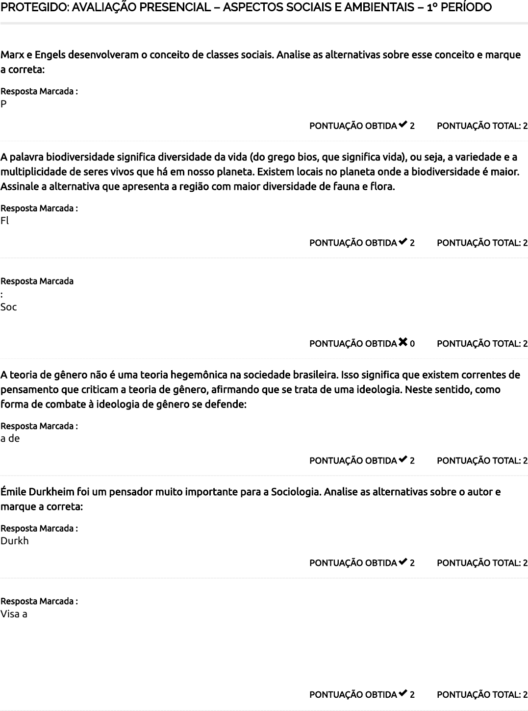 26/01/2023 11:06 Course Status – AVA Saúde Unifaveni https://ava.saude.unifaveni.com.br/course-status/ 1/4 PROTEGIDO: AVALIAÇÃO PRESENCIAL – ASPECTOS SOCIAIS E AMBIENTAIS – 1º PERÍODO PONTUAÇÃO TOTAL: 2PONTUAÇÃO OBTIDA 2 Marx e Engels desenvolveram o conceito de classes sociais. Analise as alternativas sobre esse conceito e marque a correta: Resposta Marcada : Para categorizar as classes sociais existentes, os critérios econômicos, como a renda, são utilizados. PONTUAÇÃO TOTAL: 2PONTUAÇÃO OBTIDA 2 A palavra biodiversidade signi�ca diversidade da vida (do grego bios, que signi�ca vida), ou seja, a variedade e a multiplicidade de seres vivos que há em nosso planeta. Existem locais no planeta onde a biodiversidade é maior. Assinale a alternativa que apresenta a região com maior diversidade de fauna e �ora. Resposta Marcada : Florestas tropicais. PARA CASTELLS (2015), AS CONEXÕES QUE A SOCIEDADE PROPORCIONA DEVEM CONTRIBUIR PARA FORTALECER O DIÁLOGO, O RESPEITO E A TOLERÂNCIA ENTRE AS DIFERENTES CULTURAS. QUAL É O CONCEITO-CHAVE QUE O AUTOR FALA, E O QUE PODE AUXILIAR NO OBJETIVO PROPOSTO? PONTUAÇÃO TOTAL: 2PONTUAÇÃO OBTIDA 0 Resposta Marcada : Sociedade das conexões e meios de comunicação podem auxiliar. PONTUAÇÃO TOTAL: 2PONTUAÇÃO OBTIDA 2 A teoria de gênero não é uma teoria hegemônica na sociedade brasileira. Isso significa que existem correntes de pensamento que criticam a teoria de gênero, afirmando que se trata de uma ideologia. Neste sentido, como forma de combate à ideologia de gênero se defende: Resposta Marcada : a defesa da família como patrimônio na humanidade. PONTUAÇÃO TOTAL: 2PONTUAÇÃO OBTIDA 2 Émile Durkheim foi um pensador muito importante para a Sociologia. Analise as alternativas sobre o autor e marque a correta: Resposta Marcada : Durkheim acreditava que a sociedade é o conjunto de normas, regras e procedimentos, sentimentos e ideias. EM 2005, A UNESCO ABRIU A CONVENÇÃO SOBRE A PROTEÇÃO E A PROMOÇÃO DA DIVERSIDADE DAS EXPRESSÕES CULTURAIS NOS PAÍSES. O BRASIL, COMO SIGNATÁRIO DA UNESCO, ADERIU ÀS DIRETRIZES DA CONVENÇÃO. EM 2018, FOI LANÇADO UM RELATÓRIO MUNDIAL DOS AVANÇOS DA CONVENÇÃO. NESTE SENTIDO, O QUE A CONVENÇÃO DE 2005 VISA APOIAR? PONTUAÇÃO TOTAL: 2PONTUAÇÃO OBTIDA 2 Resposta Marcada : Visa apoiar a legislação relacionada aos direitos culturais, reforçando os direitos humanos e liberdades fundamentais, acesso aos bens e serviços culturais e apoio aos pro�ssionais da cultura. 26/01/2023 11:06 Course Status – AVA Saúde Unifaveni https://ava.saude.unifaveni.com.br/course-status/ 2/4 EXTINÇÃO É A MORTE, O DESAPARECIMENTO TOTAL DAS ESPÉCIES, COMO ANIMAIS E PLANTAS, PODENDO OCORRER DE DIVERSAS MANEIRAS, ALGUMAS INEVITÁVEIS E OUTRAS COM UMA CAUSA ESPECÍFICA. QUANDO HOUVER CHANCE DE EXTINÇÃO MAIOR QUE 10%, EM 100 ANOS, DIZ-SE QUE A ESPÉCIE ESTÁ: PONTUAÇÃO TOTAL: 2PONTUAÇÃO OBTIDA 2 Resposta Marcada : vulnerável. A DIGNIDADE DA PESSOA HUMANA NO DIREITO BRASILEIRO CONSTITUI? PONTUAÇÃO TOTAL: 2PONTUAÇÃO OBTIDA 2 Resposta Marcada : Um dos fundamentos da Constituição Federal. O PRINCÍPIO DA ISONOMIA DERIVA DE UM DOS FUNDAMENTOS CONSTITUCIONALMENTE EXPRESSOS DA CONSTITUIÇÃO FEDERAL. QUAL? PONTUAÇÃO TOTAL: 2PONTUAÇÃO OBTIDA 2 Resposta Marcada : Dignidade da pessoa humana, pois a dignidade é o que diferencia o ser humano das outras espécies vivas e, como tal, deve ser tratado sem distinção. TANTO A LEI Nº 10.639/2003 QUANTO A LEI Nº 11.645/2008 (NA SUA ATUALIZAÇÃO, NA QUAL AS MESMAS ORIENTAÇÕES FORAM DESTINADAS ÀS TEMÁTICAS INDÍGENAS) PODEM SER CONSIDERADAS POLÍTICAS PÚBLICAS EDUCACIONAIS DE AÇÃO AFIRMATIVA POR TEREM A SEGUINTE FINALIDADE: PONTUAÇÃO TOTAL: 2PONTUAÇÃO OBTIDA 2 Resposta Marcada : Promover a reparação, o reconhecimento e a valorização de diferentes grupos que foram subjugados por meio, dentre outras medidas, da discriminação, da exclusão ou da marginalização da história desses povos. A CRISE AMBIENTAL ATUAL PODE SER RELACIONADA À FORMA COMO O HOMEM COMPREENDE SUA RELAÇÃO COM O AMBIENTE. SOBRE ESSA AFIRMAÇÃO, ASSINALE A ALTERNATIVA CORRETA. PONTUAÇÃO TOTAL: 2PONTUAÇÃO OBTIDA 2 Resposta Marcada : A crise ambiental atual tende a aumentar, pois o homem tem como prioridade dominar os recursos naturais. PONTUAÇÃO TOTAL: 2PONTUAÇÃO OBTIDA 2 Os Estudos Culturais fazem parte de uma investigação da área das humanidades e tem atuação em diversos âmbitos como a economia política, a teoria da comunicação, a sociologia, a teoria social, a antropologia cultural etc. Em relação aos Estudos Culturais, é correto afirmar que se trata de: Resposta Marcada : uma crítica à cultura elitista e tradicional. PONTUAÇÃO TOTAL: 2PONTUAÇÃO OBTIDA 2 Lineu, em 1735, publicou um trabalho — Systema Naturae —, no qual apresentava um plano para classi�cação de seres vivos. Nele, estavam propostos o emprego de palavras latinas e o uso de categorias de classi�cação hierarquizadas. Deve-se também a Linneu a regra de nomenclatura binominal para identi�car cada organismo.Nessa regra, entre outras recomendações, �ca estabelecido que devemos escrever: Resposta Marcada : em primeiro lugar, o gênero e depois a espécie. 26/01/2023 11:06 Course Status – AVA Saúde Unifaveni https://ava.saude.unifaveni.com.br/course-status/ 3/4 A MANUTENÇÃO DA IDENTIDADE DE UM GRUPO ESTÁ RELACIONADA COM O CULTIVO DE ASPECTOS CULTURAIS. DESSE MODO, PODE-SE AFIRMAR QUE UMA(ALGUMAS) DAS FORMAS DE MANUTENÇÃO DO CONSTRUTO DE UMA ETNIA É(SÃO): PONTUAÇÃO TOTAL: 2PONTUAÇÃO OBTIDA 2 Resposta Marcada : Os costumes e as tradições, como comemorações que evocam as memórias coletivas ou reforçam mitos que constituem o arcabouço interpretativo do grupo. PONTUAÇÃO TOTAL: 2PONTUAÇÃO OBTIDA 2 Para a Sociologia, o conceito de fato social é de grande importância. Sobre esse conceito, marque a alternativa correta: Resposta
