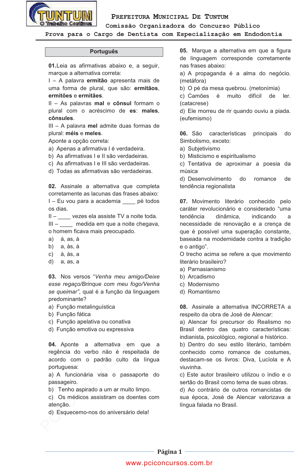 pcimarkpci MDAwMDowMDAwOjAwMDA6MDAwMDowMDAwOmZmZmY6MzZlOTpjMjU5:VGh1LCAxNiBTZXAgMjAyMSAxODowMzozOSAtMDMwMA== PREFEITURA MUNICIPAL DE TUNTUM Comissão Organizadora do Concurso Público Prova para o Cargo de Dentista com Especialização em Endodontia Página 1 Português 01. Leia as afirmativas abaixo e, a seguir, marque a alternativa correta: I – A palavra ermitão apresenta mais de uma forma de plural, que são: ermitãos, ermitões e ermitães. II – As palavras mal e cônsul formam o plural com o acréscimo de es: males, cônsules. III – A palavra mel admite duas formas de plural: méis e meles. Aponte a opção correta: a) Apenas a afirmativa I é verdadeira. b) As afirmativas I e II são verdadeiras. c) As afirmativas I e III são verdadeiras. d) Todas as afirmativas são verdadeiras. 02. Assinale a alternativa que completa corretamente as lacunas das frases abaixo: I – Eu vou para a academia ____ pé todos os dias. II – ____ vezes ela assiste TV a noite toda. III – ____ medida em que a noite chegava, o homem ficava mais preocupado. a) à, as, à b) a, às, à c) à, às, a d) a, as, a 03. Nos versos “Venha meu amigo/Deixe esse regaço/Brinque com meu fogo/Venha se queimar”, qual é a função da linguagem predominante? a) Função metalinguística b) Função fática c) Função apelativa ou conativa d) Função emotiva ou expressiva 04. Aponte a alternativa em que a regência do verbo não é respeitada de acordo com o padrão culto da língua portuguesa: a) A funcionária visa o passaporte do passageiro. b) Tenho aspirado a um ar muito limpo. c) Os médicos assistiram os doentes com atenção. d) Esquecemo-nos do aniversário dela! 05. Marque a alternativa em que a figura de linguagem corresponde corretamente nas frases abaixo: a) A propaganda é a alma do negócio. (metáfora) b) O pé da mesa quebrou. (metonímia) c) Camões é muito difícil de ler. (catacrese) d) Ele morreu de rir quando ouviu a piada. (eufemismo) 06. São características principais do Simbolismo, exceto: a) Subjetivismo b) Misticismo e espiritualismo c) Tentativa de aproximar a poesia da música d) Desenvolvimento do romance de tendência regionalista 07. Movimento literário conhecido pelo caráter revolucionário e considerado “uma tendência dinâmica, indicando a necessidade de renovação e a crença de que é possível uma superação constante, baseada na modernidade contra a tradição e o antigo”. O trecho acima se refere a que movimento literário brasileiro? a) Parnasianismo b) Arcadismo c) Modernismo d) Romantismo 08. Assinale a alternativa INCORRETA a respeito da obra de José de Alencar: a) Alencar foi precursor do Realismo no Brasil dentro das quatro características: indianista, psicológico, regional e histórico. b) Dentro do seu estilo literário, também conhecido como romance de costumes, destacam-se os livros: Diva, Lucíola e A viuvinha. c) Este autor brasileiro utilizou o índio e o sertão do Brasil como tema de suas obras. d) Ao contrário de outros romancistas de sua época, José de Alencar valorizava a língua falada no Brasil. www.pciconcursos.com.br pcimarkpci MDAwMDowMDAwOjAwMDA6MDAwMDowMDAwOmZmZmY6MzZlOTpjMjU5:VGh1LCAxNiBTZXAgMjAyMSAxODowMzozOSAtMDMwMA== PREFEITURA MUNICIPAL DE TUNTUM Comissão Organizadora do Concurso Público Prova para o Cargo de Dentista com Especialização em Endodontia Página 2 Após a leitura do poema de Vinícius de Moraes, responda a questão a seguir: Soneto da Separação De repente do riso fez-se o pranto Silencioso e branco como a bruma E das bocas unidas fez-se a espuma E das mãos espalmadas fez-se o espanto. De repente da calma fez-se o vento Que dos olhos desfez a última chama E da paixão fez-se o pressentimento E do momento imóvel fez-se o drama. De repente, não mais que de repente Fez-se de triste o que se fez amante E de sozinho o que se fez contente. Fez-se do amigo próximo o distante Fez-se da vida uma aventura errante De repente, não mais que de repente. 09. Aponte a alternativa que NÃO corresponde às características de um soneto: a) O soneto possui quatro estrofes, sendo dois quartetos seguidos de dois tercetos. b) O assunto do soneto não deve percorrer as quatro estrofes, podendo-se dividir o tema do soneto em partes, tratando uma nos dois quartetos e outra nos dois tercetos. c) O exemplo clássico de soneto, denominado também Camoniano, segue versos decassílabos, rima abraçada nos quartetos e rima cruzada nos tercetos. d) As rimas podem ser perfeitas ou imperfeitas e, entre outras, destacam-se as rimas ricas (entre palavras de categorias gramaticais diferentes), rimas pobres (entre palavras da mesma categoria gramatical) e rimas raras (com terminações não comuns, de pouca oferta de rima). Após a leitura do poema de Arnaldo Antunes, responda a questão a seguir: Inclassificáveis que preto, que branco, que índio o quê? que branco, que índio, que preto o quê? que índio, que preto, que branco o quê? que preto branco índio o quê? branco índio preto o quê? índio preto branco o quê? aqui somos mestiços mulatos cafuzos pardos mamelucos sararás crilouros guaranisseis e judárabes orientupis orientupis ameriquítalos luso nipo caboclos orientupis orientupis iberibárbaros indo ciganagôs somos o que somos inclassificáveis não tem um, tem dois, não tem dois, tem três, não tem lei, tem leis, não tem vez, tem vezes, não tem deus, tem deuses, não há sol a sós aqui somos mestiços mulatos cafuzos pardos tapuias tupinamboclos americarataís yorubárbaros. somos o que somos inclassificáveis [...] egipciganos tupinamboclos yorubárbaros carataís caribocarijós orientapuias mamemulatos tropicaburés chibarrosados mesticigenados oxigenados debaixo do sol www.pciconcursos.com.br pcimarkpci MDAwMDowMDAwOjAwMDA6MDAwMDowMDAwOmZmZmY6MzZlOTpjMjU5:VGh1LCAxNiBTZXAgMjAyMSAxODowMzozOSAtMDMwMA== PREFEITURA MUNICIPAL DE TUNTUM Comissão Organizadora do Concurso Público Prova para o Cargo de Dentista
