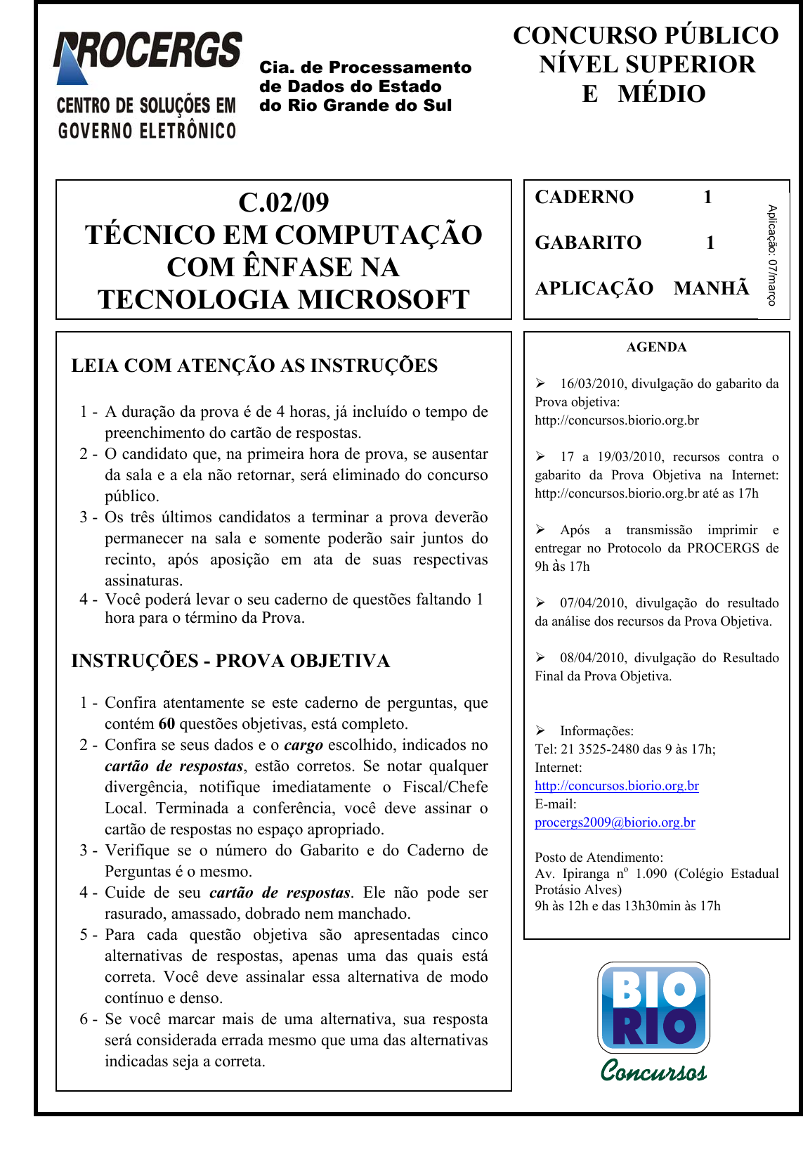pcimarkpci MDAwMDowMDAwOjAwMDA6MDAwMDowMDAwOmZmZmY6MzZlOTpjMjU5:U2F0LCAxMSBTZXAgMjAyMSAwODo0MDoyOSAtMDMwMA== CADERNO 1 GABARITO 1 APLICAÇÃO MANHÃ Cia. de Processamento de Dados do Estado do Rio Grande do Sul C.02/09 TÉCNICO EM COMPUTAÇÃO COM ÊNFASE NA TECNOLOGIA MICROSOFT LEIA COM ATENÇÃO AS INSTRUÇÕES 1 - A duração da prova é de 4 horas, já incluído o tempo de preenchimento do cartão de respostas. 2 - O candidato que, na primeira hora de prova, se ausentar da sala e a ela não retornar, será eliminado do concurso público. 3 - Os três últimos candidatos a terminar a prova deverão permanecer na sala e somente poderão sair juntos do recinto, após aposição em ata de suas respectivas assinaturas. 4 - Você poderá levar o seu caderno de questões faltando 1 hora para o término da Prova. INSTRUÇÕES - PROVA OBJETIVA 1 - Confira atentamente se este caderno de perguntas, que contém 60 questões objetivas, está completo. 2 - Confira se seus dados e o cargo escolhido, indicados no cartão de respostas, estão corretos. Se notar qualquer divergência, notifique imediatamente o Fiscal/Chefe Local. Terminada a conferência, você deve assinar o cartão de respostas no espaço apropriado. 3 - Verifique se o número do Gabarito e do Caderno de Perguntas é o mesmo. 4 - Cuide de seu cartão de respostas. Ele não pode ser rasurado, amassado, dobrado nem manchado. 5 - Para cada questão objetiva são apresentadas cinco alternativas de respostas, apenas uma das quais está correta. Você deve assinalar essa alternativa de modo contínuo e denso. 6 - Se você marcar mais de uma alternativa, sua resposta será considerada errada mesmo que uma das alternativas indicadas seja a correta. AGENDA 16/03/2010, divulgação do gabarito da Prova objetiva: http://concursos.biorio.org.br 17 a 19/03/2010, recursos contra o gabarito da Prova Objetiva na Internet: http://concursos.biorio.org.br até as 17h Após a transmissão imprimir e entregar no Protocolo da PROCERGS de 9h às 17h 07/04/2010, divulgação do resultado da análise dos recursos da Prova Objetiva. 08/04/2010, divulgação do Resultado Final da Prova Objetiva. Informações: Tel: 21 3525-2480 das 9 às 17h; Internet: http://concursos.biorio.org.br E-mail: procergs2009@biorio.org.br Posto de Atendimento: Av. Ipiranga no 1.090 (Colégio Estadual Protásio Alves) 9h às 12h e das 13h30min às 17h A plicação: 07/m arço CONCURSO PÚBLICO NÍVEL SUPERIOR E MÉDIO pcimarkpci MDAwMDowMDAwOjAwMDA6MDAwMDowMDAwOmZmZmY6MzZlOTpjMjU5:U2F0LCAxMSBTZXAgMjAyMSAwODo0MDoyOSAtMDMwMA== 2 Organização: BIORIO Concursos C.02/09 TÉCNICO DE COMPUTAÇÃO COM ÊNFASE NA TECNOLOGIA MICROSOFT CONHECIMENTOS ESPECIFÍCOS 01 - No que diz respeito à lógica de programação e construção de algoritmos, duas características da estrutura de controle repetir ... até que estão indicadas na seguinte opção: (A) o teste de controle é realizado no início da estrutura / a saída da estrutura de repetição ocorre quando o resultado do teste é verdadeiro; (B) o teste de controle é realizado no fim da estrutura / a saída da estrutura de repetição ocorre quando o resultado do teste é falso; (C) as instruções no loop são executadas pelo menos uma vez / a saída da estrutura de repetição ocorre quando o resultado do teste é falso; (D) a execução permanece no loop enquanto o resultado do teste for verdadeiro / a saída da estrutura de repetição ocorre quando o resultado do teste é falso; (E) a execução permanece no loop enquanto o resultado do teste for falso / a saída da estrutura de repetição ocorre quando o resultado do teste é verdadeiro. 02 - Observe o trecho de algoritmo a seguir, em que MOD é uma função predefinida que retorna o valor do resto da divisão entre dois números. Função FF(P1,P2:inteiro):inteiro; início se P2 = 0 então atribuir P1 a FF senão atribuir FF(P2,P1 MOD P2) a FF fim. As chamadas da função para FF(13,9) e de FF(24,8) irão retornar, respectivamente, os seguintes valores: (A) 1 e 2; (B) 1 e 8; (C) 4 e 1; (D) 4 e 8; (E) 4 e 2. 03 - Um usuário digitalizou uma imagem em um scanner, salvando-a em um arquivo, que será inserido em uma página de um site a ser hospedado na Internet. Visando utilizar formatos compactados, que tornam mais rápida a carga dessas imagens em um browser, esse arquivo deverá ter, na formação de seu nome, uma das seguintes extensões “default”: (A) ZIP ou RTF; (B) RTF ou JPG; (C) JPG ou GIF; (D) GIF ou PDF; (E) PDF ou ZIP. 04 - Duas redes de computadores com acesso à Internet estão configuradas, a primeira conforme a notação CIDR 201.163.229.0/27 e a segunda pelo IP 146.107.0.0 e máscara 255.255.0.0 . Pode-se concluir que a máscara utilizada pela primeira rede e a configuração da segunda rede de acordo com a notação CIDR são, respectivamente: (A) 255.255.255.224 e 146.107.0.0/16; (B) 255.255.255.192 e 146.107.0.0/16; (C) 255.255.255.240 e 146.107.0.0/16; (D) 255.255.255.192 e 146.107.0.0/17; (E) 255.255.255.224 e 146.107.0.0/17. 05 - O serviço de correio eletrônico é uma das mais importantes aplicações da Internet. Para seu funcionamento, dois protocolos da arquitetura TCP/IP são utilizados no funcionamento desse serviço: I - O primeiro, responsável pelo envio das mensagens de correio da máquina do usuário para a Internet. II - O segundo, pela varredura das mensagens de correio para o microcomputador de um determinado usuário, por exemplo, para o software Outlook Express 6 BR, configurado na sua máquina. Esses protocolos são, respectivamente: (A) SMTP e POP3; (B) SNMP e POP3; (C) SMTP e SLIP; (D) SMTP e ICMP; (E) SNMP e ICMP. 06 - Na interação das redes de computadores com os recursos da internet, tendo por foco o modelo OSI/ISO, para funcionamento normal, serviços e protocolos da camada de aplicação utilizam os protocolos da camada de transporte. Nessa atividade, empregam portas conhecidas e identificadas por um número padronizado. Assim, a