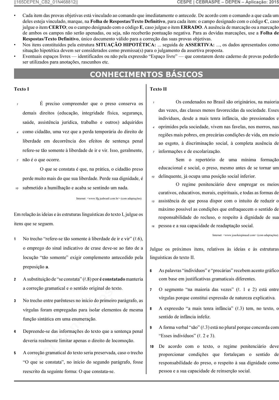pcimarkpci MDAwMDowMDAwOjAwMDA6MDAwMDowMDAwOmZmZmY6MzZlOTpjMjU5:RnJpLCAxNyBTZXAgMjAyMSAwNjozNToxMSAtMDMwMA== ||165DEPEN_CB2_01N468812|| CESPE | CEBRASPE – DEPEN – Aplicação: 2015 • Cada item das provas objetivas está vinculado ao comando que imediatamente o antecede. De acordo com o comando a que cada um deles esteja vinculado, marque, na Folha de Respostas/Texto Definitivo, para cada item: o campo designado com o código C, caso julgue o item CERTO; ou o campo designado com o código E, caso julgue o item ERRADO. A ausência de marcação ou a marcação de ambos os campos não serão apenadas, ou seja, não receberão pontuação negativa. Para as devidas marcações, use a Folha de Respostas/Texto Definitivo, único documento válido para a correção das suas provas objetivas. • Nos itens constituídos pela estrutura SITUAÇÃO HIPOTÉTICA: ... seguida de ASSERTIVA: ..., os dados apresentados como situação hipotética devem ser considerados como premissa(s) para o julgamento da assertiva proposta. • Eventuais espaços livres — identificados ou não pela expressão “Espaço livre” — que constarem deste caderno de provas poderão ser utilizados para anotações, rascunhos etc. CONHECIMENTOS BÁSICOS Texto I É preciso compreender que o preso conserva os1 demais direitos (educação, integridade física, segurança, saúde, assistência jurídica, trabalho e outros) adquiridos como cidadão, uma vez que a perda temporária do direito de4 liberdade em decorrência dos efeitos de sentença penal refere-se tão somente à liberdade de ir e vir. Isso, geralmente, não é o que ocorre.7 O que se constata é que, na prática, o cidadão preso perde muito mais do que sua liberdade. Perde sua dignidade, é submetido a humilhação e acaba se sentindo um nada.10 Internet: <www.lfg.jusbrasil.com.br> (com adaptações). Em relação às ideias e às estruturas linguísticas do texto I, julgue os itens que se seguem. 1 No trecho “refere-se tão somente à liberdade de ir e vir” (R.6), o emprego do sinal indicativo de crase deve-se ao fato de a locução “tão somente” exigir complemento antecedido pela preposição a. 2 A substituição de “se constata” (R.8) por é constatado manteria a correção gramatical e o sentido original do texto. 3 No trecho entre parênteses no início do primeiro parágrafo, as vírgulas foram empregadas para isolar elementos de mesma função sintática em uma enumeração. 4 Depreende-se das informações do texto que a sentença penal deveria realmente limitar apenas o direito de locomoção. 5 A correção gramatical do texto seria preservada, caso o trecho “O que se constata”, no início do segundo parágrafo, fosse reescrito da seguinte forma: O que constata-se. Texto II Os condenados no Brasil são originários, na maioria1 das vezes, das classes menos favorecidas da sociedade. Esses indivíduos, desde a mais tenra infância, são pressionados e oprimidos pela sociedade, vivem nas favelas, nos morros, nas4 regiões mais pobres, em precárias condições de vida, em meio ao esgoto, à discriminação social, à completa ausência de informações e de escolarização. 7 Sem o repertório de uma mínima formação educacional e social, o preso, mesmo antes de se tornar um delinquente, já ocupa uma posição social inferior.10 O regime penitenciário deve empregar os meios curativos, educativos, morais, espirituais, e todas as formas de assistência de que possa dispor com o intuito de reduzir o13 máximo possível as condições que enfraquecem o sentido de responsabilidade do recluso, o respeito à dignidade de sua pessoa e a sua capacidade de readaptação social.16 Internet: <www.joaoluizpinaud.com> (com adaptações). Julgue os próximos itens, relativos às ideias e às estruturas linguísticas do texto II. 6 As palavras “indivíduos” e “precárias” recebem acento gráfico com base em justificativas gramaticais diferentes. 7 O segmento “na maioria das vezes” (R. 1 e 2) está entre vírgulas porque constitui expressão de natureza explicativa. 8 A expressão “a mais tenra infância” (R.3) tem, no texto, o sentido de infância infeliz. 9 A forma verbal “são” (R.3) está no plural porque concorda com “Esses indivíduos” (R. 2 e 3). 10 De acordo com o texto, o regime penitenciário deve proporcionar condições que fortaleçam o sentido de responsabilidade do preso, o respeito à sua dignidade como pessoa e a sua capacidade de reinserção social. pcimarkpci MDAwMDowMDAwOjAwMDA6MDAwMDowMDAwOmZmZmY6MzZlOTpjMjU5:RnJpLCAxNyBTZXAgMjAyMSAwNjozNToxMSAtMDMwMA== ||165DEPEN_CB2_01N468812|| CESPE | CEBRASPE – DEPEN – Aplicação: 2015 Considerando os aspectos estruturais e linguísticos das correspondências oficiais, julgue os itens que se seguem de acordo com o Manual de Redação da Presidência da República. 11 A impessoalidade, propriedade dos textos oficiais, não se confunde com o uso de uma forma de linguagem administrativa caracterizada pela presença de expressões do jargão burocrático e por padrões arcaicos de construção de frases. 12 O aviso, a mensagem e o ofício são exemplos de comunicações oficiais que seguem uma diagramação própria, conhecida como padrão ofício. 13 Para a correta identificação dos interlocutores envolvidos na comunicação mediada pelos textos oficiais, todos esses expedientes devem apresentar informações relativas ao destinatário da comunicação bem como o nome e o cargo da autoridade que a expede. 14 A forma e a linguagem empregadas no trecho a seguir são adequadas para figurar em uma comunicação oficial cuja finalidade é enviar documentos solicitados por expediente anterior: “Em atenção ao Memorando n.º 9, de 8 de abril de 2015, encaminha-se, para conhecimento e avaliação, as planilhas com a previsão de gastos referentes à atualização do novo sistema operacional”. 15 Nos expedientes normalmente classificados com o padrão ofício, i