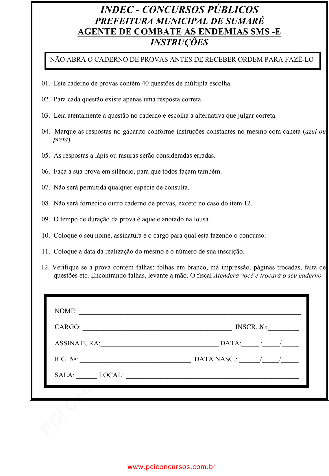 pcimarkpci MDAwMDowMDAwOjAwMDA6MDAwMDowMDAwOmZmZmY6MzZlOTpjMjU5:RnJpLCAxNyBTZXAgMjAyMSAwNzoxNDo1NyAtMDMwMA== INDEC - CONCURSOS PÚBLICOS PREFEITURA MUNICIPAL DE SUMARÉ AGENTE DE COMBATE AS ENDEMIAS SMS -E INSTRUÇÕES 01. Este caderno de provas contém 40 questões de múltipla escolha. 02. Para cada questão existe apenas uma resposta correta. 03. Leia atentamente a questão no caderno e escolha a alternativa que julgar correta. 04. Marque as respostas no gabarito conforme instruções constantes no mesmo com caneta (azul ou preta). 05. As respostas a lápis ou rasuras serão consideradas erradas. 06. Faça a sua prova em silêncio, para que todos façam também. 07. Não será permitida qualquer espécie de consulta. 08. Não será fornecido outro caderno de provas, exceto no caso do item 12. 09. O tempo de duração da prova é aquele anotado na lousa. 10. Coloque o seu nome, assinatura e o cargo para qual está fazendo o concurso. 11. Coloque a data da realização do mesmo e o número de sua inscrição. 12. Verifique se a prova contém falhas: folhas em branco, má impressão, páginas trocadas, falta de questões etc. Encontrando falhas, levante a mão. O fiscal Atenderá você e trocará o seu caderno. NOME: ________________________________________________________________ CARGO: ___________________________________________ INSCR. №:_________ ASSINATURA:__________________________________ DATA:_____ /_____/_____ R.G. №: ________________________________ DATA NASC.: ______/_____/_____ SALA: ______ LOCAL: __________________________________________________ NÃO ABRA O CADERNO DE PROVAS ANTES DE RECEBER ORDEM PARA FAZÊ-LO www.pciconcursos.com.br www.pciconcursos.com.br pcimarkpci MDAwMDowMDAwOjAwMDA6MDAwMDowMDAwOmZmZmY6MzZlOTpjMjU5:RnJpLCAxNyBTZXAgMjAyMSAwNzoxNDo1NyAtMDMwMA== AGENTE DE COMBATE AS ENDEMIAS SMS - E MATEMÁTICA 1. Em uma locadora de veículos, dos carros da frota são pretos, são brancos e o restante, 49 carros, são prateados. Quantos carros esta locadora possui? a) ( ) 60 c) ( ) 80 b) ( ) 70 d) ( ) 90 2. Um aparelho de som que custava R$ 2.000,00 foi vendido em uma loja com um desconto de 15%. O cliente optou por pagar o produto em 12 parcelas iguais. Qual o valor de cada parcela? a) ( ) R$ 141,67 c) ( ) R$ 166,66 b) ( ) R$ 151,78 d) ( ) R$ 191,67 3. Casas de um conjunto habitacional são construídas por um mutirão formado por futuros moradores. 8 casas são construídas a cada 30 dias por uma equipe formada por 20 pessoas. Se aumentarmos 5 pessoas neste mutirão, quantas casa a mais serão construídas neste mesmo período? a) ( ) 7 c) ( ) 2 b) ( ) 5 d) ( ) 1 4. Um novo modelo de um carro popular era vendido em uma concessionária com 10 % de desconto do preço de nota fiscal, devido a uma redução temporária sobre os impostos. Sabendo que esta concessionária deve voltar a vender o carro pelo preço normal, qual o aumento que irá aplicar? a) ( ) 8,8% c) ( ) 12,2% b) ( ) 10% d) ( ) 11,1% 5. Simplificando a expressão (a6 : a5)3 . (a10 : a7)2 temos: a) ( ) a8 c) ( ) a12 b) ( ) a9 d) ( ) a18 PORTUGUÊS 6. Observando o radical da palavra: enriquecer, podemos afirmar que ela é formada pelo processo de: a) ( ) derivação prefixal c) ( ) derivação parassintética b) ( ) derivação sufixal d) ( ) derivação imprópria 7. Nas alternativas a seguir apenas uma apresenta duas palavras compostas por prefixação, indique-a: a) ( ) sublocar - supermercado c) ( ) realidade - deselegante b) ( ) amoral - magreza d) ( ) felizmente – reto 8. Na palavra: couve-flor ocorre um processo de formação de palavras denominado: a) ( ) hibridismo b) ( ) composição c) ( ) derivação d) ( ) prefixação 9. No período a seguir complete os pontilhados, colocando o verbo no tempo e modo pedidos entre parênteses. “Antes de levantar esta casa, ............ construí-la com uma fachada toda de vidro.” (imaginar – pretérito perfeito do indicativo, 1ª pessoa do singular) a) ( ) imagino b) ( ) imaginava c) ( ) imaginaria d) ( ) imaginei 10. Em: “Se você se ........... calma quando Renato ............., poderá evitar uma discussão desnecessária.” Escolha a alternativa que completa corretamente as lacunas do período. a) ( ) mantiver - vier c) ( ) mantiver - vim b) ( ) manter - vir d) ( ) manter – vim CONHECIMENTOS GERAIS 11. Qual a maior usina hidrelétrica totalmente brasileira? a) ( ) Belo Monte b) ( ) Tucuruvi c) ( ) Furnas d) ( ) Itaipu 12. No litoral brasileiro, os costões abruptos recebem o nome de: a) ( ) Falésias b) ( ) Restingas c) ( ) Arrecifes d) ( ) Tombolis www.pciconcursos.com.br www.pciconcursos.com.br pcimarkpci MDAwMDowMDAwOjAwMDA6MDAwMDowMDAwOmZmZmY6MzZlOTpjMjU5:RnJpLCAxNyBTZXAgMjAyMSAwNzoxNDo1NyAtMDMwMA== 13. Quais destes paises não possuem litoral? a) ( ) Eslováquia b) ( ) Bélgica c) ( ) Macedônia d) ( ) Áustria 14. A estação da Luz em São Paulo é copia exata de uma estação de que pais? a) ( ) Estados Unidos b) ( ) Inglaterra c) ( ) França d) ( ) Austrália 15. Qual destas nações latino-americanas não enviou tropas para combater na 2ª guerra mundial? a) ( ) Brasil b) ( ) Argentina c) ( ) México d) ( ) Estados Unidos 16. “Trombetas” ou “Buraco de Tatu” São nomes de: a) ( ) Quilombos b) ( ) Quartéis c) ( ) Engenhos d) ( ) Estádios de Futebol 17. O prazo para o repasse , sem juros de mora, à Associação de Servidores e ou Sindicatos dos Servidores Municipais de Sumaré é de a) ( ) 15 dias. b) ( ) 7 dias. c) ( ) 5 dias. d) ( ) 10 dias. 18. Um servidor aposentado ou pensionista por outro regime previdenciário que não o municipal a) ( ) será assegurada uma complementação de aposentadoria proporcional ao tempo de serviço prestado para a municipalidade. b) ( ) será assegurada aposentadoria com os vencimentos integrais, independente de complementação da municipalidade. c) ( ) será assegurada uma complementação de aposentadoria integral ao tempo de serviço prestado para a municipalidade. d) ( ) não terá direit