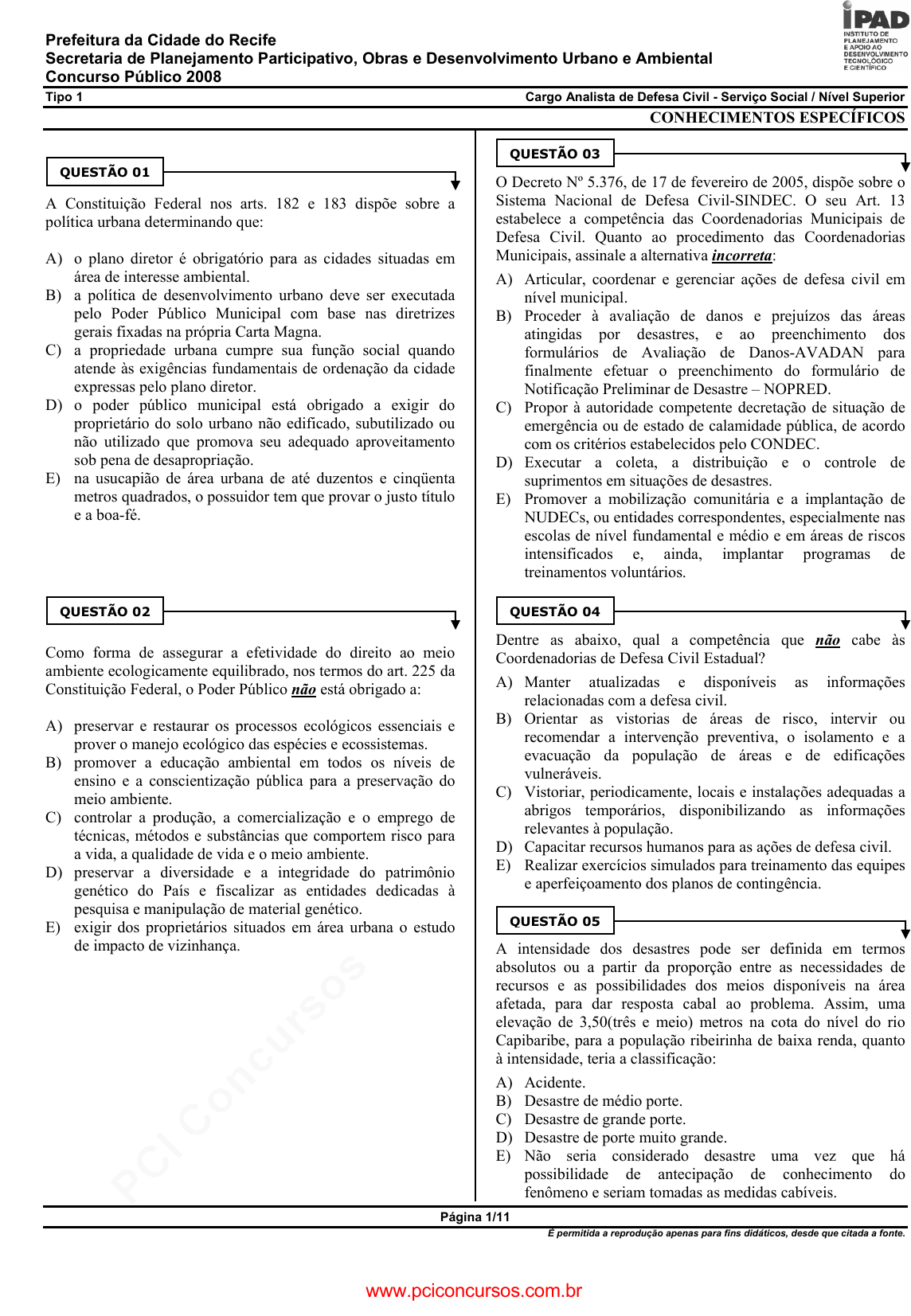 pcimarkpci MDAwMDowMDAwOjAwMDA6MDAwMDowMDAwOmZmZmY6MzZlOTpjMjU5:RnJpLCAxNyBTZXAgMjAyMSAxMDoyMzoxMiAtMDMwMA== Prefeitura da Cidade do Recife Secretaria de Planejamento Participativo, Obras e Desenvolvimento Urbano e Ambiental Concurso Público 2008 Tipo 1 Cargo Analista de Defesa Civil - Serviço Social / Nível Superior Página 1/11 É permitida a reprodução apenas para fins didáticos, desde que citada a fonte. CONHECIMENTOS ESPECÍFICOS A Constituição Federal nos arts. 182 e 183 dispõe sobre a política urbana determinando que: A) o plano diretor é obrigatório para as cidades situadas em área de interesse ambiental. B) a política de desenvolvimento urbano deve ser executada pelo Poder Público Municipal com base nas diretrizes gerais fixadas na própria Carta Magna. C) a propriedade urbana cumpre sua função social quando atende às exigências fundamentais de ordenação da cidade expressas pelo plano diretor. D) o poder público municipal está obrigado a exigir do proprietário do solo urbano não edificado, subutilizado ou não utilizado que promova seu adequado aproveitamento sob pena de desapropriação. E) na usucapião de área urbana de até duzentos e cinqüenta metros quadrados, o possuidor tem que provar o justo título e a boa-fé. Como forma de assegurar a efetividade do direito ao meio ambiente ecologicamente equilibrado, nos termos do art. 225 da Constituição Federal, o Poder Público não está obrigado a: A) preservar e restaurar os processos ecológicos essenciais e prover o manejo ecológico das espécies e ecossistemas. B) promover a educação ambiental em todos os níveis de ensino e a conscientização pública para a preservação do meio ambiente. C) controlar a produção, a comercialização e o emprego de técnicas, métodos e substâncias que comportem risco para a vida, a qualidade de vida e o meio ambiente. D) preservar a diversidade e a integridade do patrimônio genético do País e fiscalizar as entidades dedicadas à pesquisa e manipulação de material genético. E) exigir dos proprietários situados em área urbana o estudo de impacto de vizinhança. O Decreto Nº 5.376, de 17 de fevereiro de 2005, dispõe sobre o Sistema Nacional de Defesa Civil-SINDEC. O seu Art. 13 estabelece a competência das Coordenadorias Municipais de Defesa Civil. Quanto ao procedimento das Coordenadorias Municipais, assinale a alternativa incorreta: A) Articular, coordenar e gerenciar ações de defesa civil em nível municipal. B) Proceder à avaliação de danos e prejuízos das áreas atingidas por desastres, e ao preenchimento dos formulários de Avaliação de Danos-AVADAN para finalmente efetuar o preenchimento do formulário de Notificação Preliminar de Desastre – NOPRED. C) Propor à autoridade competente decretação de situação de emergência ou de estado de calamidade pública, de acordo com os critérios estabelecidos pelo CONDEC. D) Executar a coleta, a distribuição e o controle de suprimentos em situações de desastres. E) Promover a mobilização comunitária e a implantação de NUDECs, ou entidades correspondentes, especialmente nas escolas de nível fundamental e médio e em áreas de riscos intensificados e, ainda, implantar programas de treinamentos voluntários. Dentre as abaixo, qual a competência que não cabe às Coordenadorias de Defesa Civil Estadual? A) Manter atualizadas e disponíveis as informações relacionadas com a defesa civil. B) Orientar as vistorias de áreas de risco, intervir ou recomendar a intervenção preventiva, o isolamento e a evacuação da população de áreas e de edificações vulneráveis. C) Vistoriar, periodicamente, locais e instalações adequadas a abrigos temporários, disponibilizando as informações relevantes à população. D) Capacitar recursos humanos para as ações de defesa civil. E) Realizar exercícios simulados para treinamento das equipes e aperfeiçoamento dos planos de contingência. A intensidade dos desastres pode ser definida em termos absolutos ou a partir da proporção entre as necessidades de recursos e as possibilidades dos meios disponíveis na área afetada, para dar resposta cabal ao problema. Assim, uma elevação de 3,50(três e meio) metros na cota do nível do rio Capibaribe, para a população ribeirinha de baixa renda, quanto à intensidade, teria a classificação: A) Acidente. B) Desastre de médio porte. C) Desastre de grande porte. D) Desastre de porte muito grande. E) Não seria considerado desastre uma vez que há possibilidade de antecipação de conhecimento do fenômeno e seriam tomadas as medidas cabíveis. QUESTÃO 01 QUESTÃO 02 QUESTÃO 04 QUESTÃO 05 QUESTÃO 03 www.pciconcursos.com.br pcimarkpci MDAwMDowMDAwOjAwMDA6MDAwMDowMDAwOmZmZmY6MzZlOTpjMjU5:RnJpLCAxNyBTZXAgMjAyMSAxMDoyMzoxMiAtMDMwMA== Prefeitura da Cidade do Recife Secretaria de Planejamento Participativo, Obras e Desenvolvimento Urbano e Ambiental Concurso Público 2008 Tipo 1 Cargo Analista de Defesa Civil - Serviço Social / Nível Superior Página 2/11 É permitida a reprodução apenas para fins didáticos, desde que citada a fonte. Ao inspecionar um talude muito íngreme, densamente povoado, e com indícios de rupturas de solo, o agente de defesa civil deverá de imediato propor à autoridade competente a seguinte ação de defesa civil: A) Decretação de situação de emergência de médio porte. B) Decretação de situação de emergência de grande porte. C) Decretação de estado de calamidade pública. D) Promoção de ampla participação da comunidade nas ações de defesa civil, especialmente nas atividades de planejamento e ações de respostas a desastres e reconstrução. E) Promoção de medidas preventivas estruturais e não estruturais, com o objetivo de reduzir os riscos de desastre. Associe as conceituações. ( ) Risco ( 1 ) Resultado de eventos adversos, naturais ou provocados pelo homem, sobre um ecossistema vulnerável, causando danos humanos, materiais e ambien