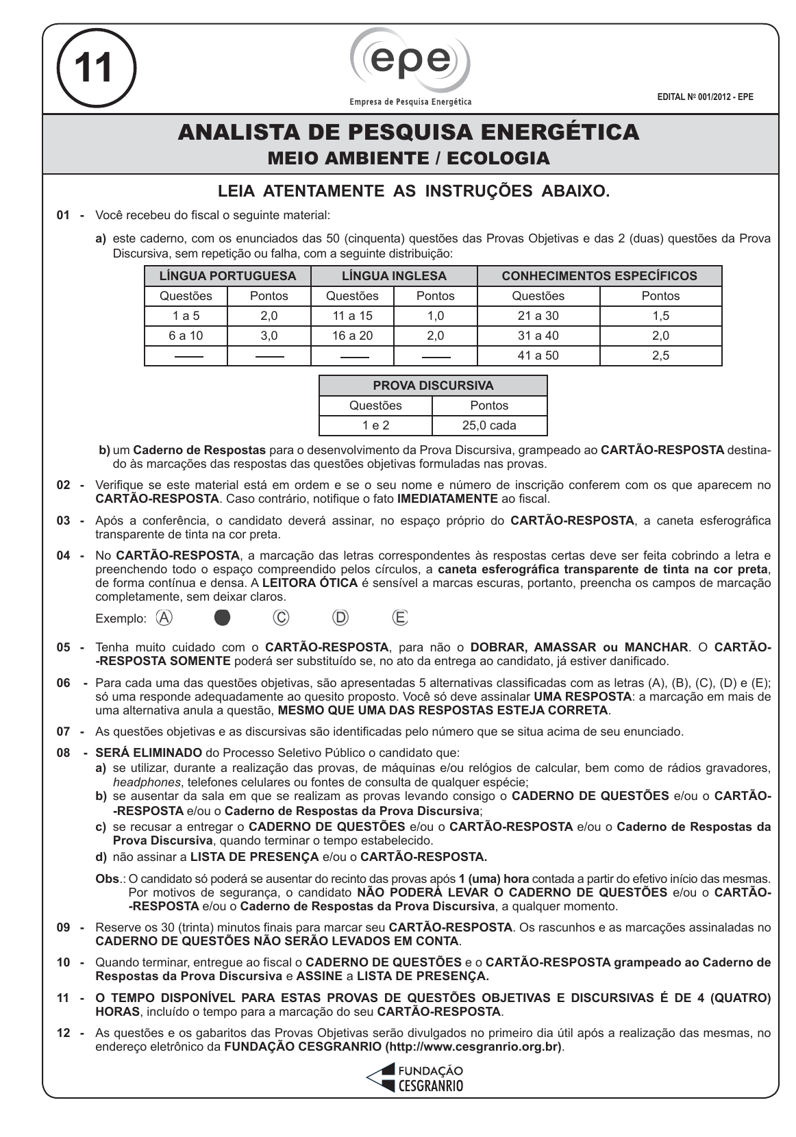 pcimarkpci MDAwMDowMDAwOjAwMDA6MDAwMDowMDAwOmZmZmY6MzZlOTpjMjU5:RnJpLCAxNyBTZXAgMjAyMSAxMTozOToxMiAtMDMwMA== ANALISTA DE PESQUISA ENERGÉTICA MEIO AMBIENTE/ECOLOGIA 1 E P E TÉCNICO(A) AMBIENTAL JÚNIOR 11 EDITAL No 001/2012 - EPE LEIA ATENTAMENTE AS INSTRUÇÕES ABAIXO. 01 - Você recebeu do fiscal o seguinte material: a) este caderno, com os enunciados das 50 (cinquenta) questões das Provas Objetivas e das 2 (duas) questões da Prova Discursiva, sem repetição ou falha, com a seguinte distribuição: LÍNGUA PORTUGUESA LÍNGUA INGLESA CONHECIMENTOS ESPECÍFICOS Questões Pontos Questões Pontos Questões Pontos 1 a 5 2,0 11 a 15 1,0 21 a 30 1,5 6 a 10 3,0 16 a 20 2,0 31 a 40 2,0 41 a 50 2,5 PROVA DISCURSIVA Questões Pontos 1 e 2 25,0 cada b) um Caderno de Respostas para o desenvolvimento da Prova Discursiva, grampeado ao CARTÃO-RESPOSTA destina- do às marcações das respostas das questões objetivas formuladas nas provas. 02 - Verifique se este material está em ordem e se o seu nome e número de inscrição conferem com os que aparecem no CARTÃO-RESPOSTA. Caso contrário, notifique o fato IMEDIATAMENTE ao fiscal. 03 - Após a conferência, o candidato deverá assinar, no espaço próprio do CARTÃO-RESPOSTA, a caneta esferográfica transparente de tinta na cor preta. 04 - No CARTÃO-RESPOSTA, a marcação das letras correspondentes às respostas certas deve ser feita cobrindo a letra e preenchendo todo o espaço compreendido pelos círculos, a caneta esferográfica transparente de tinta na cor preta, de forma contínua e densa. A LEITORA ÓTICA é sensível a marcas escuras, portanto, preencha os campos de marcação completamente, sem deixar claros. Exemplo: 05 - Tenha muito cuidado com o CARTÃO-RESPOSTA, para não o DOBRAR, AMASSAR ou MANCHAR. O CARTÃO- -RESPOSTA SOMENTE poderá ser substituído se, no ato da entrega ao candidato, já estiver danificado. 06 - Para cada uma das questões objetivas, são apresentadas 5 alternativas classificadas com as letras (A), (B), (C), (D) e (E); só uma responde adequadamente ao quesito proposto. Você só deve assinalar UMA RESPOSTA: a marcação em mais de uma alternativa anula a questão, MESMO QUE UMA DAS RESPOSTAS ESTEJA CORRETA. 07 - As questões objetivas e as discursivas são identificadas pelo número que se situa acima de seu enunciado. 08 - SERÁ ELIMINADO do Processo Seletivo Público o candidato que: a) se utilizar, durante a realização das provas, de máquinas e/ou relógios de calcular, bem como de rádios gravadores, headphones, telefones celulares ou fontes de consulta de qualquer espécie; b) se ausentar da sala em que se realizam as provas levando consigo o CADERNO DE QUESTÕES e/ou o CARTÃO- -RESPOSTA e/ou o Caderno de Respostas da Prova Discursiva; c) se recusar a entregar o CADERNO DE QUESTÕES e/ou o CARTÃO-RESPOSTA e/ou o Caderno de Respostas da Prova Discursiva, quando terminar o tempo estabelecido. d) não assinar a LISTA DE PRESENÇA e/ou o CARTÃO-RESPOSTA. Obs.: O candidato só poderá se ausentar do recinto das provas após 1 (uma) hora contada a partir do efetivo início das mesmas. Por motivos de segurança, o candidato NÃO PODERÁ LEVAR O CADERNO DE QUESTÕES e/ou o CARTÃO- -RESPOSTA e/ou o Caderno de Respostas da Prova Discursiva, a qualquer momento. 09 - Reserve os 30 (trinta) minutos finais para marcar seu CARTÃO-RESPOSTA. Os rascunhos e as marcações assinaladas no CADERNO DE QUESTÕES NÃO SERÃO LEVADOS EM CONTA. 10 - Quando terminar, entregue ao fiscal o CADERNO DE QUESTÕES e o CARTÃO-RESPOSTA grampeado ao Caderno de Respostas da Prova Discursiva e ASSINE a LISTA DE PRESENÇA. 11 - O TEMPO DISPONÍVEL PARA ESTAS PROVAS DE QUESTÕES OBJETIVAS E DISCURSIVAS É DE 4 (QUATRO) HORAS, incluído o tempo para a marcação do seu CARTÃO-RESPOSTA. 12 - As questões e os gabaritos das Provas Objetivas serão divulgados no primeiro dia útil após a realização das mesmas, no endereço eletrônico da FUNDAÇÃO CESGRANRIO (http://www.cesgranrio.org.br). ANALISTA DE PESQUISA ENERGÉTICA MEIO AMBIENTE / ECOLOGIA 11 pcimarkpci MDAwMDowMDAwOjAwMDA6MDAwMDowMDAwOmZmZmY6MzZlOTpjMjU5:RnJpLCAxNyBTZXAgMjAyMSAxMTozOToxMiAtMDMwMA== ANALISTA DE PESQUISA ENERGÉTICA MEIO AMBIENTE/ECOLOGIA 2 E P E LÍNGUA PORTUGUESA O setor elétrico e as mudanças climáticas Nosso país tem enorme potencial hidrelétrico, o que nos permite gerar energia elétrica razoavelmen- te ‘limpa’ e barata. Essa fonte responde, atualmente, por cerca de 70% da energia elétrica consumida no país. Entretanto, para que possamos usufruir dessa energia, precisamos transportá-la a longas distâncias — muitas vezes, milhares de quilômetros — por meio de linhas de transmissão aéreas, expostas ao tempo e a seus caprichos. E esses caprichos, segundo es- tudos científicos, tendem a se tornar cada vez mais frequentes em um planeta sujeito a mudanças em um ritmo jamais visto pelos humanos. A experiência brasileira mostra isso. 50% a 70% das falhas ocorridas no passado em linhas de trans- missão brasileiras estavam relacionadas às condi- ções climáticas, mais especificamente, às chamadas tempestades severas, caracterizadas por condições extremas de vento, raios ou precipitação. Com o aquecimento global, o desmatamento e alguns fenô- menos atmosféricos, esse número tende a aumentar nas próximas décadas. Combinados ou de forma isolada, esses fenôme- nos são capazes de interromper o fluxo de energia ao longo das linhas e interferir, de maneira significa- tiva, no sistema elétrico. Se as alterações do clima podem causar problemas na transmissão de energia, na distribuição a situação não é diferente. 99% da distribuição de energia elétrica no Brasil é aérea e concentra-se em grandes áreas urbanas, onde vive a maioria dos consumidores. Nessas áreas, as edi- ficações, a substituição de vegetação por asfalto, a poluição dos automóveis e das fábricas causam alte- rações atmosféricas que favorecem a