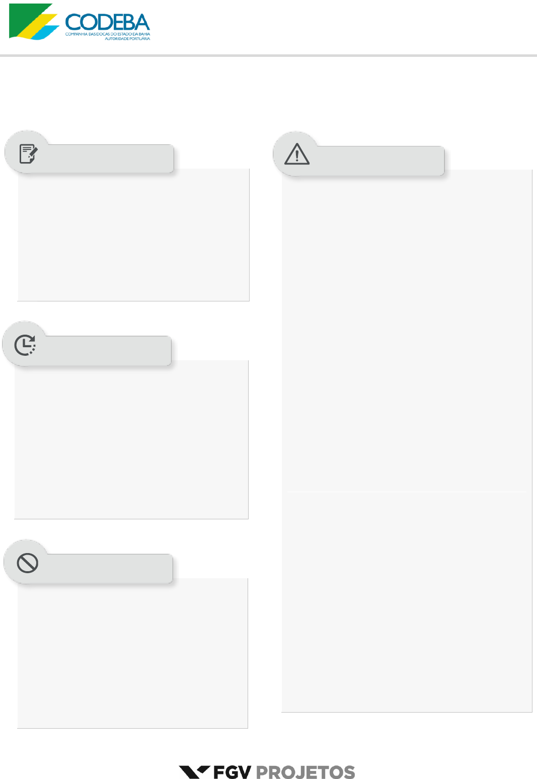 www.pciconcursos.com.br Companhia das Docas do Estado da Bahia Autoridade Portuária NS10 Concurso Público 2015 MANHÃ Nível Superior ANALISTA PORTUÁRIO (GESTÃO PORTUÁRIA) Tipo 1 – BRANCA Além deste caderno de prova, contendo sessenta questões objetivas e uma questão discursiva, você receberá do fiscal de sala: uma folha destinada às respostas das questões objetivas. uma folha de texto definitivo destinada à questão discursiva. A questão discursiva e o espaço para rascunho virão após as questões objetivas, no final deste caderno; Verifique se seu caderno está completo, sem repetição de questões ou falhas. Caso contrário, notifique imediatamente o fiscal da sala, para que sejam tomadas as devidas providências; Confira seus dados pessoais, especialmente nome, número de inscrição e documento de identidade e leia atentamente as instruções para preencher a folha de respostas e a folha de texto definitivo; Use somente caneta esferográfica, fabricada em material transparente, com tinta preta ou azul; Assine seu nome apenas nos espaços reservados; Não será permitido qualquer tipo de identificação na folha de texto definitivo da questão discursiva; Marque na folha de respostas o campo relativo à confirmação do tipo/cor de prova, conforme o caderno recebido; O preenchimento das respostas da prova objetiva e da questão discursiva é de sua responsabilidade e não será permitida a troca de folha de respostas ou de texto definitivo em caso de erro; Reserve tempo suficiente para o preenchimento de suas respostas. Para fins de avaliação, serão levadas em consideração apenas as marcações realizadas na folha de respostas da prova objetiva e na folha de texto definitivo, não sendo permitido anotar informações relativas às respostas em qualquer outro meio que não seja o caderno de provas; A FGV coletará as impressões digitais dos candidatos na folha de respostas; Os candidatos serão submetidos ao sistema de detecção de metais quando do ingresso e da saída de sanitários durante a realização das provas. 4 (quatro) horas e 30 (trinta) minutos é o tempo disponível para a realização da prova, já incluído o tempo para a marcação da folha de respostas da prova objetiva; 2 horas após o início da prova é possível retirar- se da sala, sem levar o caderno de prova; 1 hora antes do término do período de prova é possível retirar-se da sala levando o caderno de prova. Qualquer tipo de comunicação entre os candidatos durante a aplicação da prova; Levantar da cadeira sem autorização do fiscal de sala; Usar o sanitário ao término da prova, após deixar a sala. SUA PROVA TEMPO NÃO SERÁ PERMITIDO INFORMAÇÕES GERAIS www.pciconcursos.com.br www.pciconcursos.com.br Companhia das Docas do Estado da Bahia - CODEBA FGV – Projetos Analista Portuário (Gestão Portuária) Tipo 1 – Cor BRANCA – Página 3 Língua Portuguesa As questões 01 a 06 devem ser respondidas a partir do texto I. Texto I Do relatório à pizza Nos últimos anos, relatórios produzidos por Comissões Parlamentares de Inquérito têm merecido destaque na mídia nacional por impactos das denúncias que investigam. Algumas das sessões de inquérito são transmitidas por canais de televisão e acompanhadas por milhares de brasileiros interessados no resultado das investigações conduzidas por seus representantes legislativos. Muitos jornais publicam trechos dos relatórios produzidos por essas comissões de inquérito. De modo geral, porém, as expectativas dos eleitores são frustradas quando veem relatórios que apontam responsabilidades por crimes de corrupção e desvio de verbas públicas serem “engavetados” sem que os responsáveis sejam punidos. (João Montanaro, Folha de São Paulo, 19-05-2012) 1 No texto, o termo que exerce uma função sintática diferente das demais é: (A) por Comissões Parlamentares de Inquérito. (B) por impactos das denúncias que investigam. (C) por canais de televisão. (D) por milhares de brasileiros interessados. (E) por seus representantes legislativos. 2 Sobre a expressão inicial do texto – Nos últimos anos – assinale a afirmativa correta. (A) Localiza temporalmente a ação da oração seguinte. (B) Indica precisão na quantificação dos anos referidos. (C) Inclui obrigatoriamente a última década. (D) Ironiza o trabalho legislativo brasileiro. (E) Mostra a lentidão dos trabalhos das comissões. 3 O segundo período do texto tem a função de (A) destacar um aspecto positivo do trabalho político. (B) mostrar o interesse do público pelo trabalho das comissões. (C) explicar o significado de uma expressão anterior. (D) explicitar o que foi feito nos últimos anos. (E) detalhar algumas das denúncias referidas. 4 “Algumas das sessões de inquérito são transmitidas por canais de televisão e acompanhadas por milhares de brasileiros interessados no resultado das investigações conduzidas por seus representantes legislativos”. Sobre os componentes desse segmento do texto, assinale a afirmativa inadequada. (A) “transmitidas”, “acompanhadas” e “conduzidas" são palavras formalmente idênticas. (B) “milhares de brasileiros” equivale semanticamente a “brasileiros aos milhares”. (C) “no resultado das investigações” funciona como complemento do adjetivo “interessados”. (D) O possessivo “seus” tem por referente “brasileiros”. (E) A forma “sessões” está incorreta, devendo ser substituída por “seções”. 5 “Algumas das sessões” e “Muitos jornais” indicam (A) quantidade determinada e valorização das sessões e dos jornais. (B) quantidade indeterminada e desvalorização das sessões. (C) grande número e especificação dos jornais. (D) pequeno número e desqualificação de sessões e jornais. (E) número impreciso e indefinição de sessões e jornais. 6 Ao dizer que alguns relatórios são “engavetados”, o texto quer dizer que esses relatórios (A) devem se