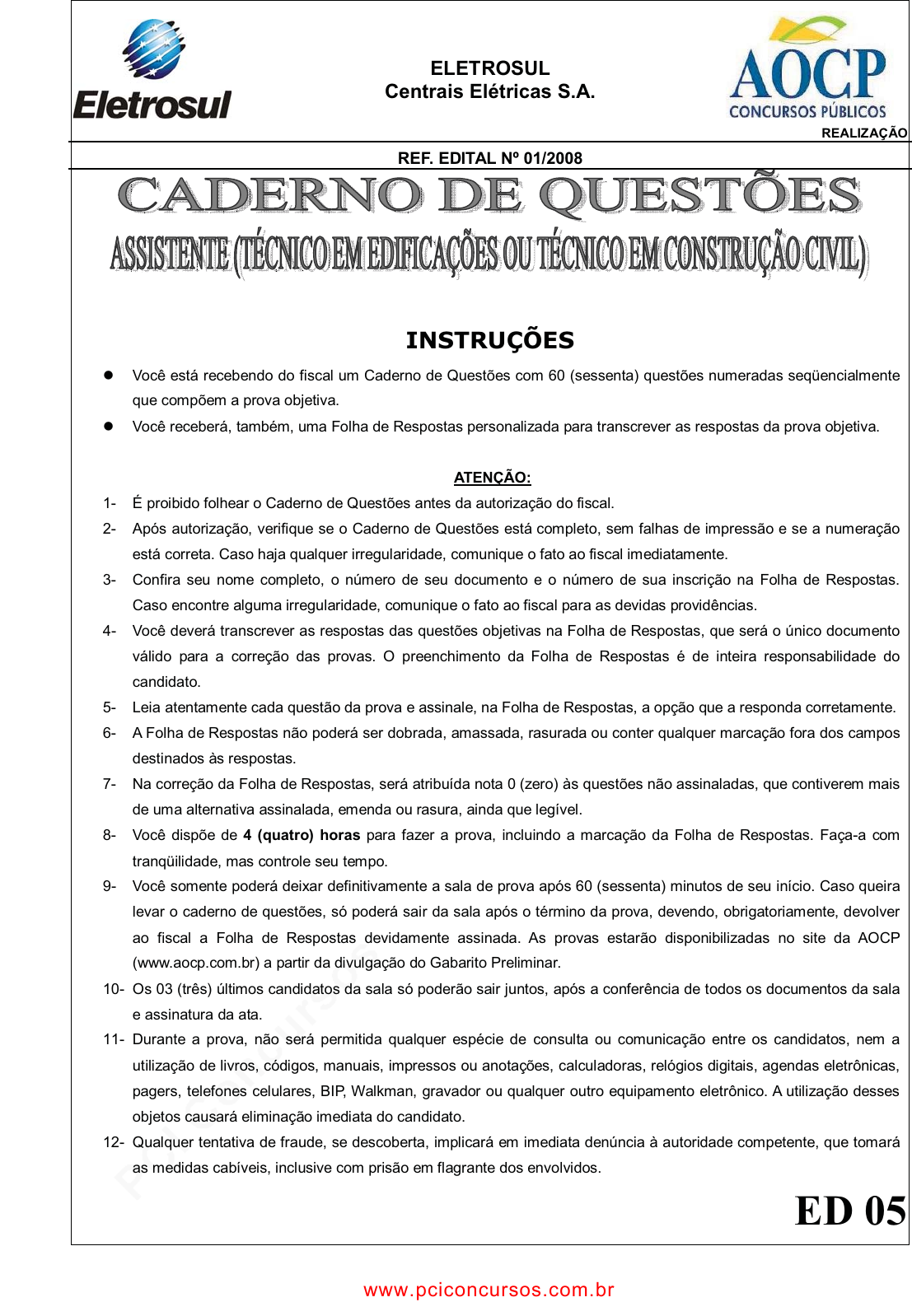 pcimarkpci MDAwMDowMDAwOjAwMDA6MDAwMDowMDAwOmZmZmY6MzZlOTpjMjU5:RnJpLCAxNyBTZXAgMjAyMSAyMTo1Njo1NCAtMDMwMA== ELETROSUL Centrais Elétricas S.A. REALIZAÇÃO REF. EDITAL Nº 01/2008 INSTRUÇÕES � Você está recebendo do fiscal um Caderno de Questões com 60 (sessenta) questões numeradas seqüencialmente que compõem a prova objetiva. � Você receberá, também, uma Folha de Respostas personalizada para transcrever as respostas da prova objetiva. ATENÇÃO: 1- É proibido folhear o Caderno de Questões antes da autorização do fiscal. 2- Após autorização, verifique se o Caderno de Questões está completo, sem falhas de impressão e se a numeração está correta. Caso haja qualquer irregularidade, comunique o fato ao fiscal imediatamente. 3- Confira seu nome completo, o número de seu documento e o número de sua inscrição na Folha de Respostas. Caso encontre alguma irregularidade, comunique o fato ao fiscal para as devidas providências. 4- Você deverá transcrever as respostas das questões objetivas na Folha de Respostas, que será o único documento válido para a correção das provas. O preenchimento da Folha de Respostas é de inteira responsabilidade do candidato. 5- Leia atentamente cada questão da prova e assinale, na Folha de Respostas, a opção que a responda corretamente. 6- A Folha de Respostas não poderá ser dobrada, amassada, rasurada ou conter qualquer marcação fora dos campos destinados às respostas. 7- Na correção da Folha de Respostas, será atribuída nota 0 (zero) às questões não assinaladas, que contiverem mais de uma alternativa assinalada, emenda ou rasura, ainda que legível. 8- Você dispõe de 4 (quatro) horas para fazer a prova, incluindo a marcação da Folha de Respostas. Faça-a com tranqüilidade, mas controle seu tempo. 9- Você somente poderá deixar definitivamente a sala de prova após 60 (sessenta) minutos de seu início. Caso queira levar o caderno de questões, só poderá sair da sala após o término da prova, devendo, obrigatoriamente, devolver ao fiscal a Folha de Respostas devidamente assinada. As provas estarão disponibilizadas no site da AOCP (www.aocp.com.br) a partir da divulgação do Gabarito Preliminar. 10- Os 03 (três) últimos candidatos da sala só poderão sair juntos, após a conferência de todos os documentos da sala e assinatura da ata. 11- Durante a prova, não será permitida qualquer espécie de consulta ou comunicação entre os candidatos, nem a utilização de livros, códigos, manuais, impressos ou anotações, calculadoras, relógios digitais, agendas eletrônicas, pagers, telefones celulares, BIP, Walkman, gravador ou qualquer outro equipamento eletrônico. A utilização desses objetos causará eliminação imediata do candidato. 12- Qualquer tentativa de fraude, se descoberta, implicará em imediata denúncia à autoridade competente, que tomará as medidas cabíveis, inclusive com prisão em flagrante dos envolvidos. ED 05 www.pciconcursos.com.br pcimarkpci MDAwMDowMDAwOjAwMDA6MDAwMDowMDAwOmZmZmY6MzZlOTpjMjU5:RnJpLCAxNyBTZXAgMjAyMSAyMTo1Njo1NCAtMDMwMA== FOLHA PARA ANOTAÇÃO DAS RESPOSTAS DO CANDIDATO QUESTÃO 1 2 3 4 5 6 7 8 9 10 11 12 13 14 15 16 17 18 19 20 21 22 23 24 25 26 27 28 29 30 RESP. QUESTÃO 31 32 33 34 35 36 37 38 39 40 41 42 43 44 45 46 47 48 49 50 51 52 53 54 55 56 57 58 59 60 RESP. www.pciconcursos.com.br pcimarkpci MDAwMDowMDAwOjAwMDA6MDAwMDowMDAwOmZmZmY6MzZlOTpjMjU5:RnJpLCAxNyBTZXAgMjAyMSAyMTo1Njo1NCAtMDMwMA== C O N H E C I M E N T O E S P E C Í F I C O 1. Considerando um levantamento planimétrico feito em uma poligonal com 17 vértices, assinale a alternativa que corresponde à soma de seus ângulos internos. a) 1700°. b) 2000°. c) 3060°. d) 2700°. e) 2580°. A tabela de campo apresenta os dados coletados em um nivelamento geométrico. Com os dados apresentados a seguir, responda as questões 2 e 3. Visadas Es ta ca Po si çã o do ap ar el ho R é (m ) In te rm ed iá ria (m ) M ud an ça (m ) A ltu ra d o In st ru m en to (m ) C ot a (m ) 1 0,256 500,0 002 0,125 3 A 0,365 3 0,125 4 0,360 5 B 0,125 2. A altura do instrumento na posição B é de a) 500,000 m. b) 500,016 m. c) 500,256 m. d) 499,891 m. e) 500,113 m. 3. A diferença entre a cota do ponto 1 e do ponto 5 é de a) 0,452 m. b) 0,314 m. c) 0,256 m. d) 0,125 m. e) 0,109 m. 4. As folhas de papel usadas para plotagem de desenhos técnicos apresentam padrões de tamanhos definidos internacionalmente, como o tamanho A0, A1, A2 e A3. A dimensão desses tamanhos são, respectivamente, a) 841x1189 mm, 594x841 mm, 420x594 mm e 297x420 mm. b) 563x1222 mm, 594x841 mm, 420x594 mm e 297x420 mm. c) 841x1189 mm, 594x841 mm, 253x658 mm e 297x420 mm. d) 841x1189 mm, 594x841 mm, 420x594 mm e 325x699 mm. e) 841x1586 mm, 594x841 mm, 420x594 mm e 297x699 mm. 5. A NR 18 - Condições e Meio Ambiente de Trabalho na Indústria da Construção Civil apresenta algumas disposições sobre o uso da serra circular. Em relação a esse assunto, assinale a alternativa INCORRETA. a) Deve ser dotada de mesa estável, com fechamento de suas faces inferiores, anterior e posterior, construída em madeira resistente e de primeira qualidade, material metálico ou similar de resistência equivalente, sem irregularidades, com dimensionamento suficiente para a execução das tarefas. b) Deve ter a carcaça do motor aterrada eletricamente. c) Seu disco deve ser mantido afiado e travado, devendo ser substituído quando apresentar trincas, dentes quebrados ou empenamentos. d) As transmissões de força mecânica devem estar protegidas obrigatoriamente por anteparos fixos e resistentes, e devem sempre ser removidos durante a execução dos trabalhos. e) Ser provida de coifa protetora do disco e cutelo divisor, com identificação do fabricante e ainda coletor de serragem. 6. A NR 18 - Condições e Meio Ambiente de Trabalho na Indústria da Construção Civil estabelece a comunicação prévia necessária que deve ser feita à Delegacia Regional do 