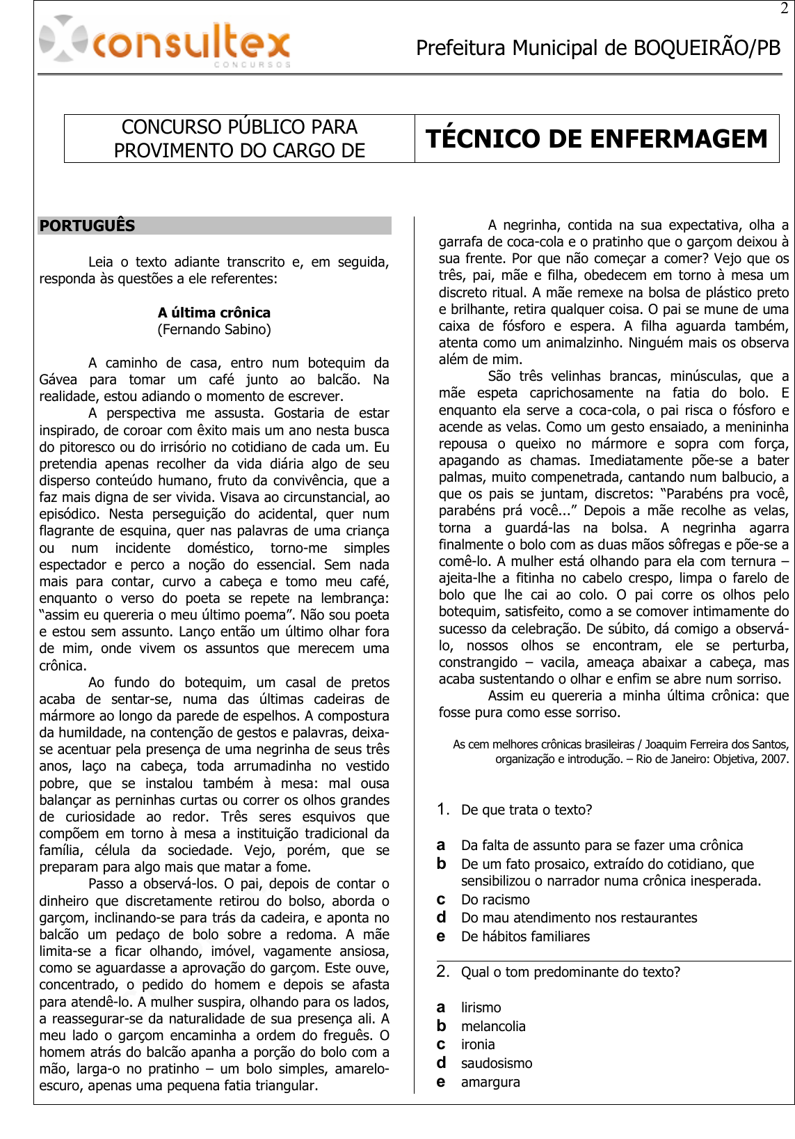 pcimarkpci MDAwMDowMDAwOjAwMDA6MDAwMDowMDAwOmZmZmY6MzZlOTpjMjU5:U2F0LCAxMSBTZXAgMjAyMSAxMjowMzozMiAtMDMwMA== 2 Prefeitura Municipal de BOQUEIRÃO/PB CONCURSO PÚBLICO PARA PROVIMENTO DO CARGO DE TÉCNICO DE ENFERMAGEM PORTUGUÊS Leia o texto adiante transcrito e, em seguida, responda às questões a ele referentes: A última crônica (Fernando Sabino) A caminho de casa, entro num botequim da Gávea para tomar um café junto ao balcão. Na realidade, estou adiando o momento de escrever. A perspectiva me assusta. Gostaria de estar inspirado, de coroar com êxito mais um ano nesta busca do pitoresco ou do irrisório no cotidiano de cada um. Eu pretendia apenas recolher da vida diária algo de seu disperso conteúdo humano, fruto da convivência, que a faz mais digna de ser vivida. Visava ao circunstancial, ao episódico. Nesta perseguição do acidental, quer num flagrante de esquina, quer nas palavras de uma criança ou num incidente doméstico, torno-me simples espectador e perco a noção do essencial. Sem nada mais para contar, curvo a cabeça e tomo meu café, enquanto o verso do poeta se repete na lembrança: “assim eu quereria o meu último poema”. Não sou poeta e estou sem assunto. Lanço então um último olhar fora de mim, onde vivem os assuntos que merecem uma crônica. Ao fundo do botequim, um casal de pretos acaba de sentar-se, numa das últimas cadeiras de mármore ao longo da parede de espelhos. A compostura da humildade, na contenção de gestos e palavras, deixa- se acentuar pela presença de uma negrinha de seus três anos, laço na cabeça, toda arrumadinha no vestido pobre, que se instalou também à mesa: mal ousa balançar as perninhas curtas ou correr os olhos grandes de curiosidade ao redor. Três seres esquivos que compõem em torno à mesa a instituição tradicional da família, célula da sociedade. Vejo, porém, que se preparam para algo mais que matar a fome. Passo a observá-los. O pai, depois de contar o dinheiro que discretamente retirou do bolso, aborda o garçom, inclinando-se para trás da cadeira, e aponta no balcão um pedaço de bolo sobre a redoma. A mãe limita-se a ficar olhando, imóvel, vagamente ansiosa, como se aguardasse a aprovação do garçom. Este ouve, concentrado, o pedido do homem e depois se afasta para atendê-lo. A mulher suspira, olhando para os lados, a reassegurar-se da naturalidade de sua presença ali. A meu lado o garçom encaminha a ordem do freguês. O homem atrás do balcão apanha a porção do bolo com a mão, larga-o no pratinho – um bolo simples, amarelo- escuro, apenas uma pequena fatia triangular. A negrinha, contida na sua expectativa, olha a garrafa de coca-cola e o pratinho que o garçom deixou à sua frente. Por que não começar a comer? Vejo que os três, pai, mãe e filha, obedecem em torno à mesa um discreto ritual. A mãe remexe na bolsa de plástico preto e brilhante, retira qualquer coisa. O pai se mune de uma caixa de fósforo e espera. A filha aguarda também, atenta como um animalzinho. Ninguém mais os observa além de mim. São três velinhas brancas, minúsculas, que a mãe espeta caprichosamente na fatia do bolo. E enquanto ela serve a coca-cola, o pai risca o fósforo e acende as velas. Como um gesto ensaiado, a menininha repousa o queixo no mármore e sopra com força, apagando as chamas. Imediatamente põe-se a bater palmas, muito compenetrada, cantando num balbucio, a que os pais se juntam, discretos: “Parabéns pra você, parabéns prá você...” Depois a mãe recolhe as velas, torna a guardá-las na bolsa. A negrinha agarra finalmente o bolo com as duas mãos sôfregas e põe-se a comê-lo. A mulher está olhando para ela com ternura – ajeita-lhe a fitinha no cabelo crespo, limpa o farelo de bolo que lhe cai ao colo. O pai corre os olhos pelo botequim, satisfeito, como a se comover intimamente do sucesso da celebração. De súbito, dá comigo a observá- lo, nossos olhos se encontram, ele se perturba, constrangido – vacila, ameaça abaixar a cabeça, mas acaba sustentando o olhar e enfim se abre num sorriso. Assim eu quereria a minha última crônica: que fosse pura como esse sorriso. As cem melhores crônicas brasileiras / Joaquim Ferreira dos Santos, organização e introdução. – Rio de Janeiro: Objetiva, 2007. 1. De que trata o texto? a Da falta de assunto para se fazer uma crônica b De um fato prosaico, extraído do cotidiano, que sensibilizou o narrador numa crônica inesperada. c Do racismo d Do mau atendimento nos restaurantes e De hábitos familiares 2. Qual o tom predominante do texto? a lirismo b melancolia c ironia d saudosismo e amargura pcimarkpci MDAwMDowMDAwOjAwMDA6MDAwMDowMDAwOmZmZmY6MzZlOTpjMjU5:U2F0LCAxMSBTZXAgMjAyMSAxMjowMzozMiAtMDMwMA== 3 3. Qual a palavra que melhor traduz o sentimento que se apossou do narrador ao observar a cena por ele narrada? a tédio b entusiasmo c revolta d indiferença e comoção 4. Assinale a opção CORRETA: a A família de negros era abastada. b O garçom hesitou antes de atender ao pedido do homem. c O narrador tinha marcado um encontro com a família de negros. d O narrador deparou, por acaso, com a cena protagonizada pela família de negros. e O dono do botequim era amigo do narrador. 5. Marque a alternativa CORRETA: a O homem do balcão apanhou a fatia do bolo e serviu à família. b O narrador achou inconveniente a celebração num botequim. c O narrador desejou que sua crônica tivesse a mesma pureza que ele observou no sorriso do homem negro. d A negrinha estava triste com uma simples fatia de bolo em seu aniversário. e Havia muito tempo que a família tinha programado aquela celebração. 6. O narrador fez a seguinte pergunta a si mesmo: “Por que não começa a comer?”. O narrador faz essa interrogação porque: a não sabia que a negrinha estava aguardando os preparativos da celebração de seu aniversário. b estava irritado com a demora da negrinha. c achava estranho que houvesse apenas uma fatia para ser divi