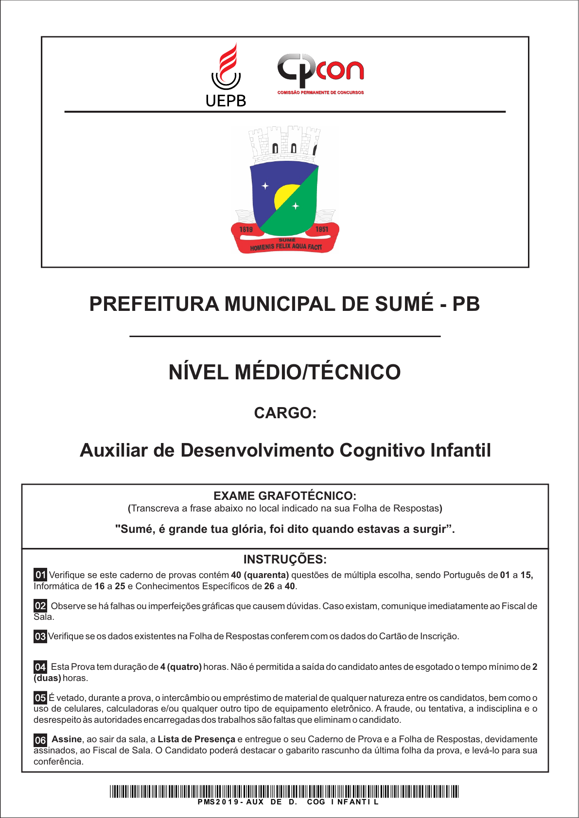 pcimarkpci MDAwMDowMDAwOjAwMDA6MDAwMDowMDAwOmZmZmY6MzZlOTpjMjU5:U2F0LCAxOCBTZXAgMjAyMSAxMDowMDo1NyAtMDMwMA== P MS2 0 1 9 - AUX DE D. COG I NF ANT I L Auxiliar de Desenvolvimento Cognitivo Infantil . NÍVEL MÉDIO/TÉCNICO CARGO: EXAME GRAFOTÉCNICO: (Transcreva a frase abaixo no local indicado na sua Folha de Respostas) "Sumé, é grande tua glória, foi dito quando estavas a surgir”. 01 Observe se há falhas ou imperfeições gráficas que causem dúvidas. Caso existam, comunique imediatamente ao Fiscal de Sala. 02 Verifique se os dados existentes na Folha de Respostas conferem com os dados do Cartão de Inscrição.03 Esta Prova tem duração de 4 (quatro) horas. Não é permitida a saída do candidato antes de esgotado o tempo mínimo de 2 (duas) horas. 04 É vetado, durante a prova, o intercâmbio ou empréstimo de material de qualquer natureza entre os candidatos, bem como o uso de celulares, calculadoras e/ou qualquer outro tipo de equipamento eletrônico. A fraude, ou tentativa, a indisciplina e o desrespeito às autoridades encarregadas dos trabalhos são faltas que eliminam o candidato. 05 Assine, ao sair da sala, a Lista de Presença e entregue o seu Caderno de Prova e a Folha de Respostas, devidamente assinados, ao Fiscal de Sala. O Candidato poderá destacar o gabarito rascunho da última folha da prova, e levá-lo para sua conferência. 06 INSTRUÇÕES: PREFEITURA MUNICIPAL DE SUMÉ - PB Verifique se este caderno de provas contém 40 (quarenta) questões de múltipla escolha, sendo Português de 01 a 15, Informática de 16 a 25 e Conhecimentos Específicos de 26 a 40. pcimarkpci MDAwMDowMDAwOjAwMDA6MDAwMDowMDAwOmZmZmY6MzZlOTpjMjU5:U2F0LCAxOCBTZXAgMjAyMSAxMDowMDo1NyAtMDMwMA== PORTUGUÊS Leia com atenção o texto abaixo, de modo a responder às questões de a :1 6 1ª QUESTÃO Ao refletir sobre o comportamento da sociedade na atualidade, a autora destaca o poder da . Significa que a ela podem ser Palavra atribuídas diferentes propriedades. Conforme o direcionamento argumentativo do texto, indique que característica da “palavra” a autora ressalta na conclusão do texto. a) d) Um meio de representação.Um meio de expressão de sentimentos. b) e) Instrumento de inspiração e transformação.Uma forma de ação. c) Instrumento de interação. 2ª QUESTÃO Considerando o trecho, a seguir, que finaliza o texto acima, avalie como verdadeir ou fals as proposições:as (V) as (F) “[...] Que se escancarem os risos, as canções, as histórias encantadas, as lendas... Que venham as fadas, os duendes, elfos, bruxos e bruxas nos ensinarem, novamente, a razão da vida. E que isso não seja um pecado. Mas, como disse o grande escritor e dramaturgo Bertold Brecht, que fez da indignação com as sombras sua bandeira: ‘Que tempos são esses, quando falar sobre flores é quase um crime?’ ” ( ) mas O emprego do conector serve para introduzir uma ressalva, em tom irônico, dado que a autora, pressupondo o estranhamento quanto ao conteúdo das informações precedentes, já se adianta admitindo a dificuldade de mudança em tempos de tantos desencantos. ( ) que Todas as frases introduzidas pelo item expressam o desejo da autora de uma mudança no comportamento da sociedade; trata- se de frases exclamativas, ou desiderativas, constituindo-se, pois, como marcas de subjetividade na construção do texto. ( ) Ao encerrar o texto com a indagação feita pelo dramaturgo Bertold Brecht, a autora demonstra conformação com a realidade descrita e, assim, nega a possibilidade de mudança. A sequência que responde CORRETAMENTE à questão é: a) d) F, F e V.V, F e F. b) e) V, V e F.F, V e V. c) V, F e V. 1 2 3 4 5 6 7 8 9 10 11 12 13 14 15 16 17 18 19 20 21 22 23 24 25 26 27 28 29 v ĵ ś Ċś▓♫◘ℓ ℓĎ◘ śℓℓśℓ� Os dias estão sombrios. Em todo o planeta, o ódio tem mostrado sua face mais intransigente. E ela parece com a nossa! Isso é o que, de fato, assusta. O poder da morte e da destruição ao alcance da nossa mão. A um click, a uma nota assinada por algum poderoso mandatário... No centro de tudo, a Palavra. Tenho visto brigas completamente desnecessárias no trânsito, homens e mulheres que dão espaço a uma verdadeira entidade guerreira graças a uma ultrapassagem indevida ou a uma simples buzinada. Jovens e adolescentes que se agridem pelas redes sociais. Políticos que usam o verbo para separar nações, apontar o dedo para cidadãos, enaltecer guerras. No centro de tudo, a Palavra. Diante dos temores e terrores da nossa época – e de todas as épocas – é a palavra que define o que somos. Na era da disseminação fácil, rápida e aleatória, notícias falsas podem produzir o andamento da história. Ou o contrário dela. Defender uma ideia, mesmo que levemente, pode determinar sua exclusão de um grupo social ou da própria família. No centro de tudo, a Palavra. A vida está sombria. E aquele que acha graça em uma brincadeira de criança, ou se delicia com um inocente sorvete, é visto com reservas, taxado de desvairado ou desvairada, com certeza falta-lhe um parafuso. No centro de tudo, a Palavra. Dos livros sagrados, da interpretação do que está escrito nessas obras, sempre em nome de Deus se formam milícias, exércitos, alguém em uma mesquita e atira em uma centena de pessoas. Não sem antes deixar claro em vídeo o que vai em sua mente. Ao vivo. Ou um jovem escreve uma mensagem enigmática e assassina seus antes colegas da sua antiga escola. Pela dor que as palavras produzem em sua alma. No centro de tudo, a Palavra. Os corações estão sombrios. E é preciso urgentemente que se dê uma nova ordem à ordem social. Que se escancarem os risos, as canções, as histórias encantadas, as lendas... Que venham as fadas, os duendes, elfos, bruxos e bruxas nos ensinarem, novamente, a razão da vida. E que isso não seja um pecado. No centro de tudo, a Palavra. Mas, como disse o grande escritor e dramaturgo Bertold Brecht, que fez da indignação com