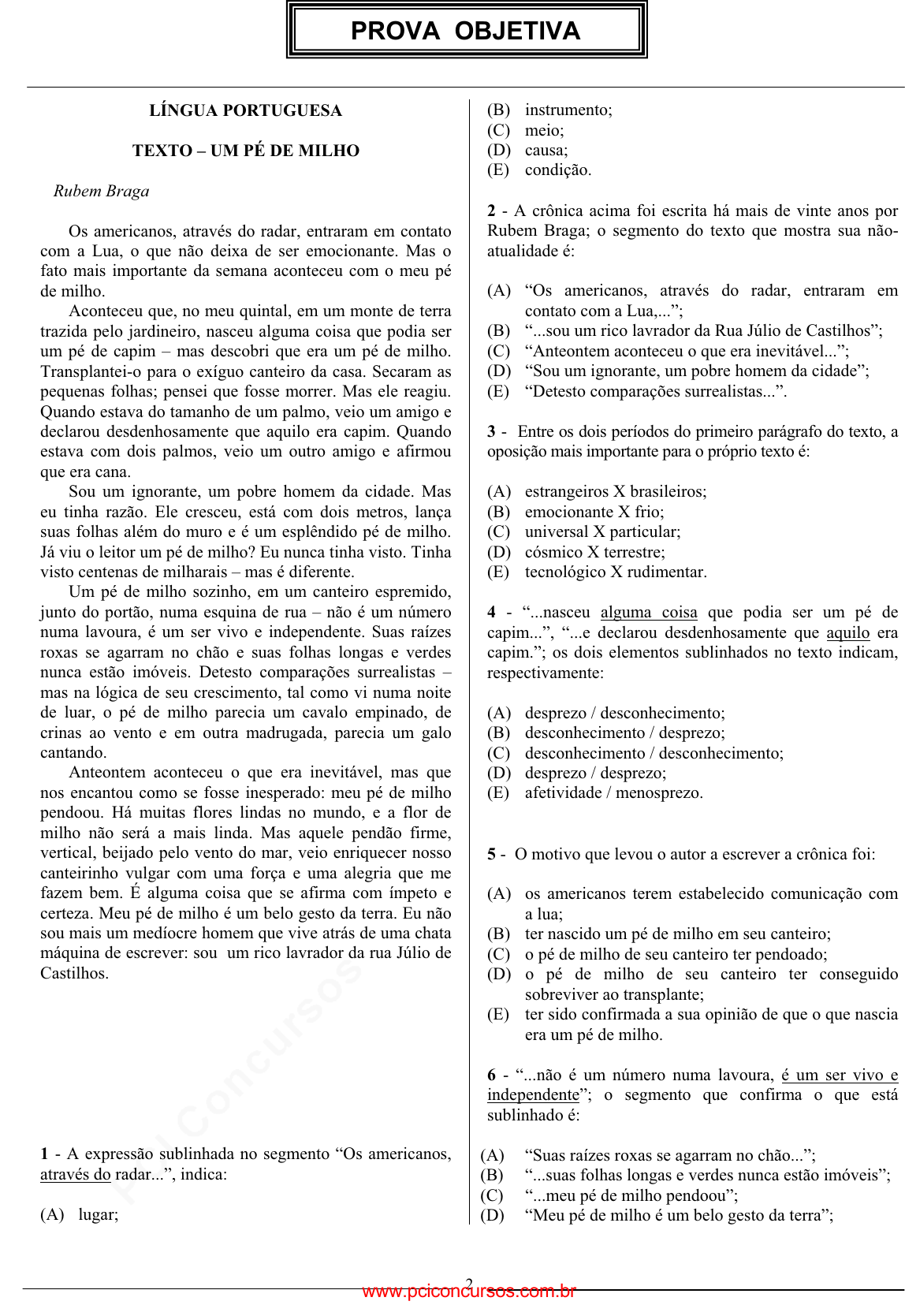 pcimarkpci MDAwMDowMDAwOjAwMDA6MDAwMDowMDAwOmZmZmY6MzZlOTpjMjU5:U2F0LCAxOCBTZXAgMjAyMSAxODowNTozNiAtMDMwMA== 2 PROVA OBJETIVA LÍNGUA PORTUGUESA TEXTO – UM PÉ DE MILHO Rubem Braga Os americanos, através do radar, entraram em contato com a Lua, o que não deixa de ser emocionante. Mas o fato mais importante da semana aconteceu com o meu pé de milho. Aconteceu que, no meu quintal, em um monte de terra trazida pelo jardineiro, nasceu alguma coisa que podia ser um pé de capim – mas descobri que era um pé de milho. Transplantei-o para o exíguo canteiro da casa. Secaram as pequenas folhas; pensei que fosse morrer. Mas ele reagiu. Quando estava do tamanho de um palmo, veio um amigo e declarou desdenhosamente que aquilo era capim. Quando estava com dois palmos, veio um outro amigo e afirmou que era cana. Sou um ignorante, um pobre homem da cidade. Mas eu tinha razão. Ele cresceu, está com dois metros, lança suas folhas além do muro e é um esplêndido pé de milho. Já viu o leitor um pé de milho? Eu nunca tinha visto. Tinha visto centenas de milharais – mas é diferente. Um pé de milho sozinho, em um canteiro espremido, junto do portão, numa esquina de rua – não é um número numa lavoura, é um ser vivo e independente. Suas raízes roxas se agarram no chão e suas folhas longas e verdes nunca estão imóveis. Detesto comparações surrealistas – mas na lógica de seu crescimento, tal como vi numa noite de luar, o pé de milho parecia um cavalo empinado, de crinas ao vento e em outra madrugada, parecia um galo cantando. Anteontem aconteceu o que era inevitável, mas que nos encantou como se fosse inesperado: meu pé de milho pendoou. Há muitas flores lindas no mundo, e a flor de milho não será a mais linda. Mas aquele pendão firme, vertical, beijado pelo vento do mar, veio enriquecer nosso canteirinho vulgar com uma força e uma alegria que me fazem bem. É alguma coisa que se afirma com ímpeto e certeza. Meu pé de milho é um belo gesto da terra. Eu não sou mais um medíocre homem que vive atrás de uma chata máquina de escrever: sou um rico lavrador da rua Júlio de Castilhos. 1 - A expressão sublinhada no segmento “Os americanos, através do radar...”, indica: (A) lugar; (B) instrumento; (C) meio; (D) causa; (E) condição. 2 - A crônica acima foi escrita há mais de vinte anos por Rubem Braga; o segmento do texto que mostra sua não- atualidade é: (A) “Os americanos, através do radar, entraram em contato com a Lua,...”; (B) “...sou um rico lavrador da Rua Júlio de Castilhos”; (C) “Anteontem aconteceu o que era inevitável...”; (D) “Sou um ignorante, um pobre homem da cidade”; (E) “Detesto comparações surrealistas...”. 3 - Entre os dois períodos do primeiro parágrafo do texto, a oposição mais importante para o próprio texto é: (A) estrangeiros X brasileiros; (B) emocionante X frio; (C) universal X particular; (D) cósmico X terrestre; (E) tecnológico X rudimentar. 4 - “...nasceu alguma coisa que podia ser um pé de capim...”, “...e declarou desdenhosamente que aquilo era capim.”; os dois elementos sublinhados no texto indicam, respectivamente: (A) desprezo / desconhecimento; (B) desconhecimento / desprezo; (C) desconhecimento / desconhecimento; (D) desprezo / desprezo; (E) afetividade / menosprezo. 5 - O motivo que levou o autor a escrever a crônica foi: (A) os americanos terem estabelecido comunicação com a lua; (B) ter nascido um pé de milho em seu canteiro; (C) o pé de milho de seu canteiro ter pendoado; (D) o pé de milho de seu canteiro ter conseguido sobreviver ao transplante; (E) ter sido confirmada a sua opinião de que o que nascia era um pé de milho. 6 - “...não é um número numa lavoura, é um ser vivo e independente”; o segmento que confirma o que está sublinhado é: (A) “Suas raízes roxas se agarram no chão...”; (B) “...suas folhas longas e verdes nunca estão imóveis”; (C) “...meu pé de milho pendoou”; (D) “Meu pé de milho é um belo gesto da terra”; www.pciconcursos.com.br pcimarkpci MDAwMDowMDAwOjAwMDA6MDAwMDowMDAwOmZmZmY6MzZlOTpjMjU5:U2F0LCAxOCBTZXAgMjAyMSAxODowNTozNiAtMDMwMA== 3 PROVA OBJETIVA (E) “...afirmou que era cana”. 7 - Considerando o segundo e o terceiro parágrafos do texto, o segmento que pode ser considerado uma interrupção da narrativa é: (A) “Quando estava com dois palmos, veio outro amigo e afirmou que era cana”; (B) “-mas descobri que era um pé de milho”; (C) “Mas ele reagiu”; (D) “Sou um ignorante, um pobre homem da cidade”; (E) “Ele cresceu, está com dois metros...”. 8 - A substituição correta do termo sublinhado por um sinônimo está em: (A) “Transplantei-o para o exíguo canteiro...” = raso; (B) “...e declarou desdenhosamente que aquilo era capim” = depreciativamente; (C) “...veio enriquecer o nosso canteirinho vulgar...” = popular; (D) “Anteontem aconteceu o que era inevitável...” = imprevisível; (E) “...que se afirma com ímpeto e certeza” = velocidade. 9 - A substituição da expressão sublinhada por um só termo é INADEQUADA em: (A) “Sou um ignorante, um pobre homem da cidade” = urbano; (B) “...tal como vi numa noite de luar...” = enluarada; (C) “...beijado pelo vento do mar...” = marinho; (D) “...exíguo canteiro da casa.” = doméstico; (E) “...é um belo gesto da terra.” = terrestre. 10 - Em todos os segmentos abaixo há um sintagma construído por um substantivo + adjetivo (ou vice-versa); o sintagma em que a troca de posições entre esses vocábulos pode trazer mudança de sentido é: (A) “Transplantei-o para o exíguo canteiro da casa”; (B) “Secaram as pequenas folhas”; (C) “Sou um ignorante, um pobre homem da cidade”; (D) “...e é um esplêndido pé de milho”; (E) “...em um canteiro espremido...”. 11 - “Detesto comparações surrealistas...”; apesar disso, o autor do texto faz uma dessas comparações: (A) “...o pé de milho parecia 